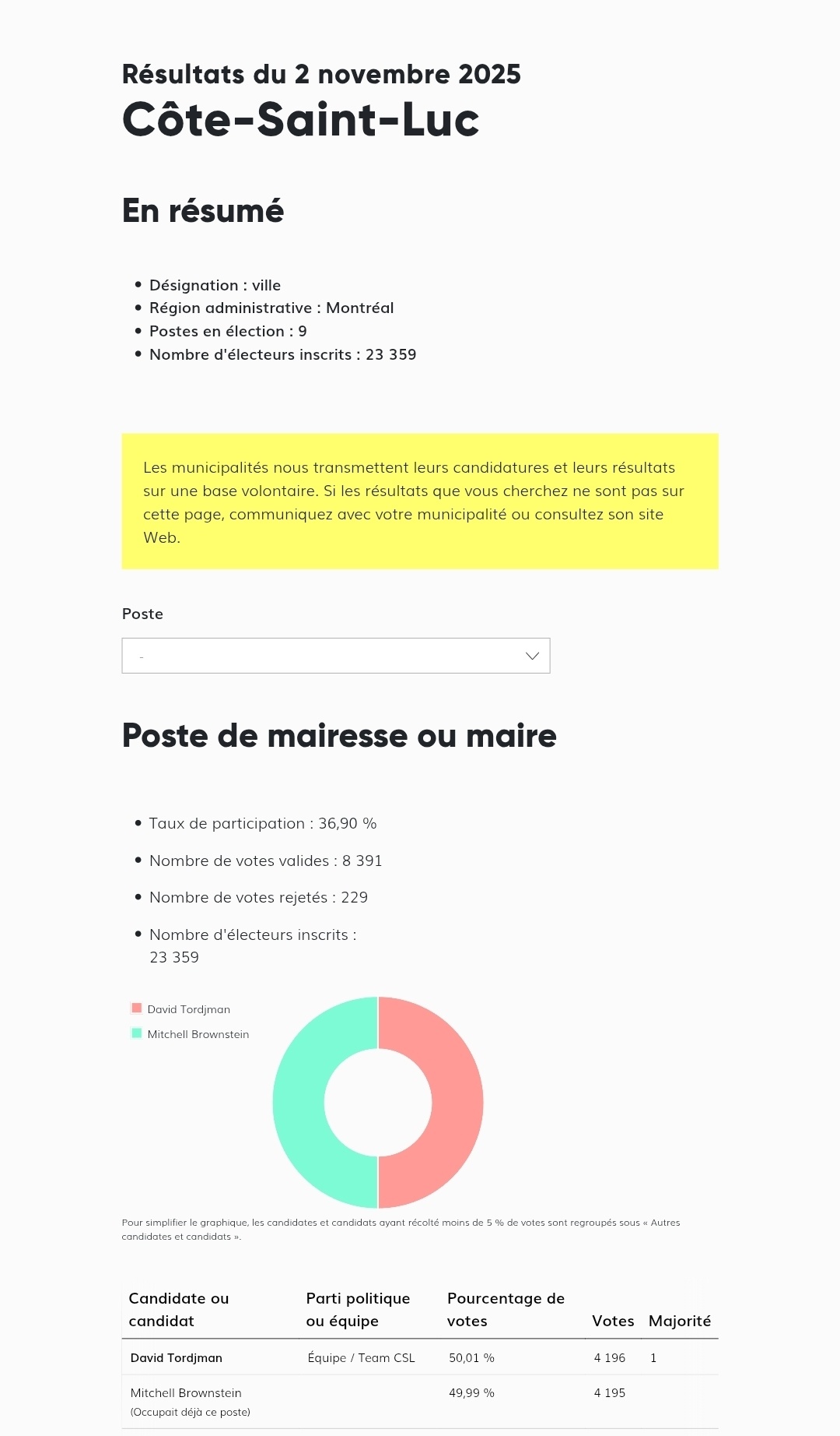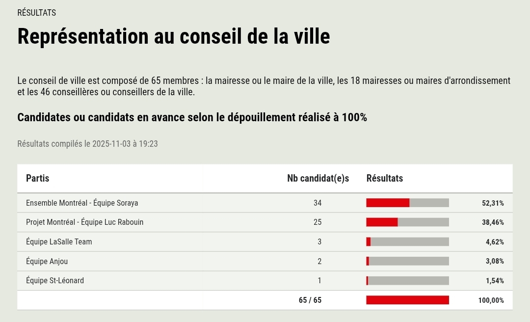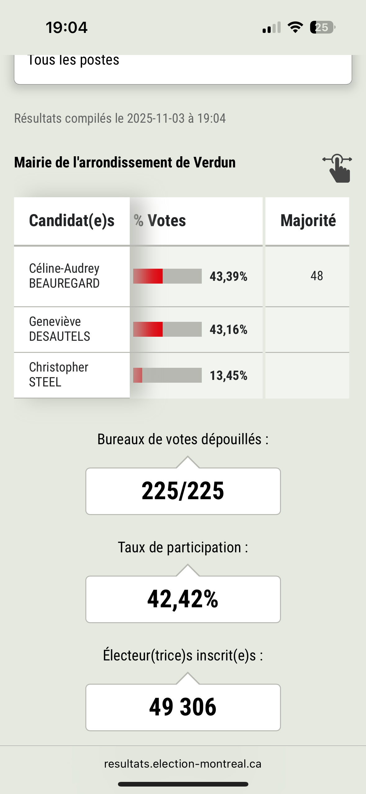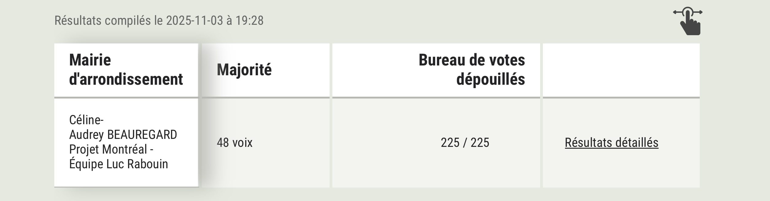Des 19 arrondissements qui forment la Ville de Montréal, Verdun est le seul à avoir des bureaux de vote où le dépouillement n’a été achevé qu’en soirée le 3 novembre. Les personnes candidates ont attendu que les bulletins de sept bureaux de vote soient dépouillés pour déterminer qui sera élue mairesse d’arrondissement. À 19h28, Élections Montréal a mis à jour son site web : Céline-Audrey Beauregard, candidate avec Projet Montréal, est élue mairesse de Verdun.
