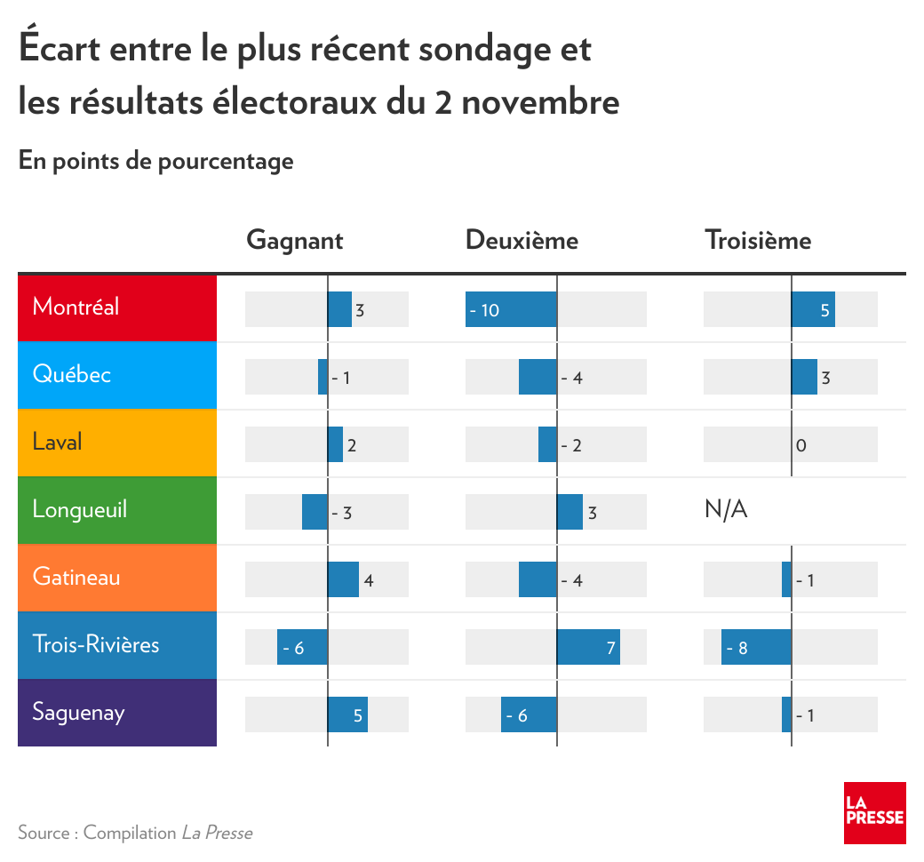 Les coups de sonde menés durant la campagne électorale ont brossé un portrait fidèle des différentes courses dans les principales villes du Québec à une exception près, celle du candidat malheureux à la mairie Montréal, Luc Rabouin, dont les appuis ont été sous-estimés.