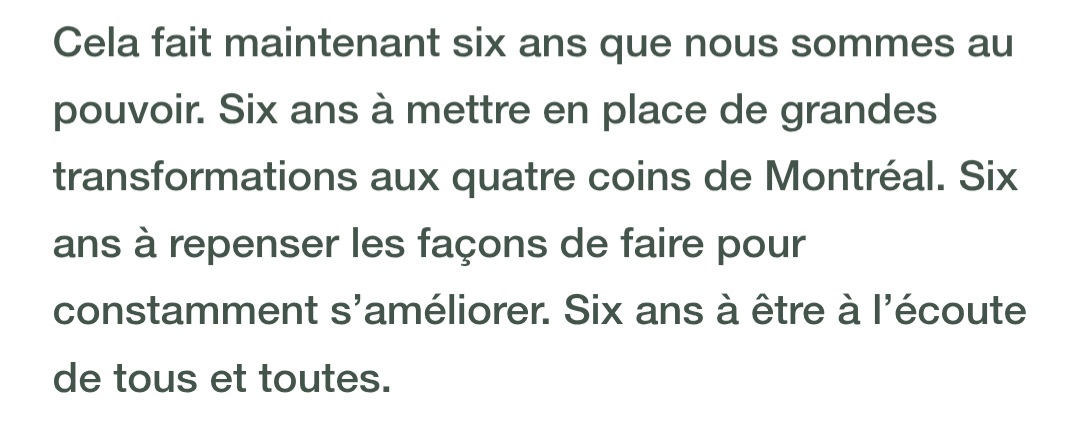 À titre informatif, une petite coquille sur le site de Projet Montréal. On stipule que ça fait six ans qu’ils sont au pouvoir. Mais si je ne m’abuse, cela fait huit ans. À corriger, si vous êtes en mesure de retracer les personnes concernées par les ajustements