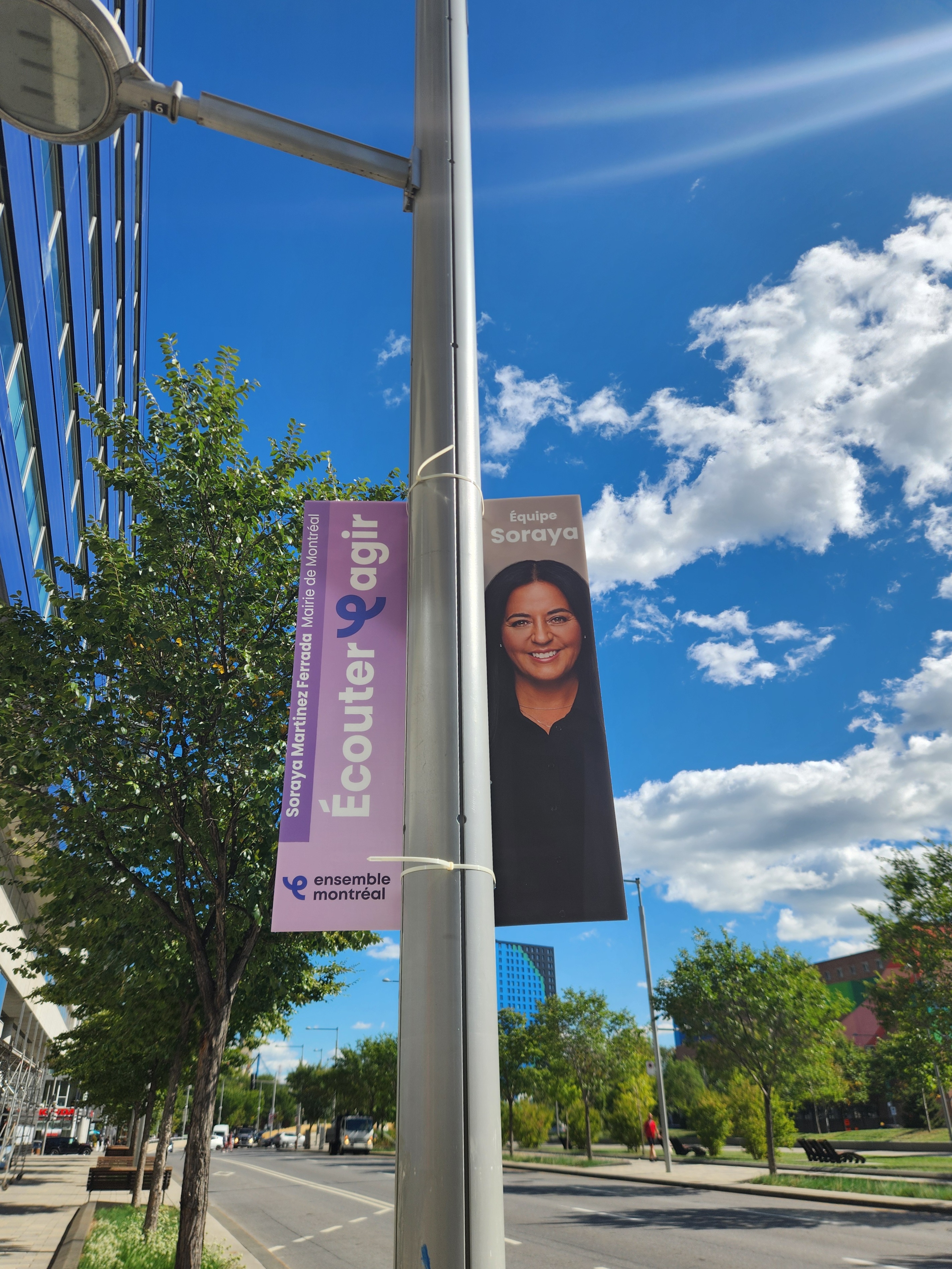 Je trouve intéressant le concept des pancartes d’Ensemble Montréal. Une seule pancarte avec deux styles différents de part et d’autre. Ça permet d’économiser sur les coûts, tout en étant plus écologique. Assez original