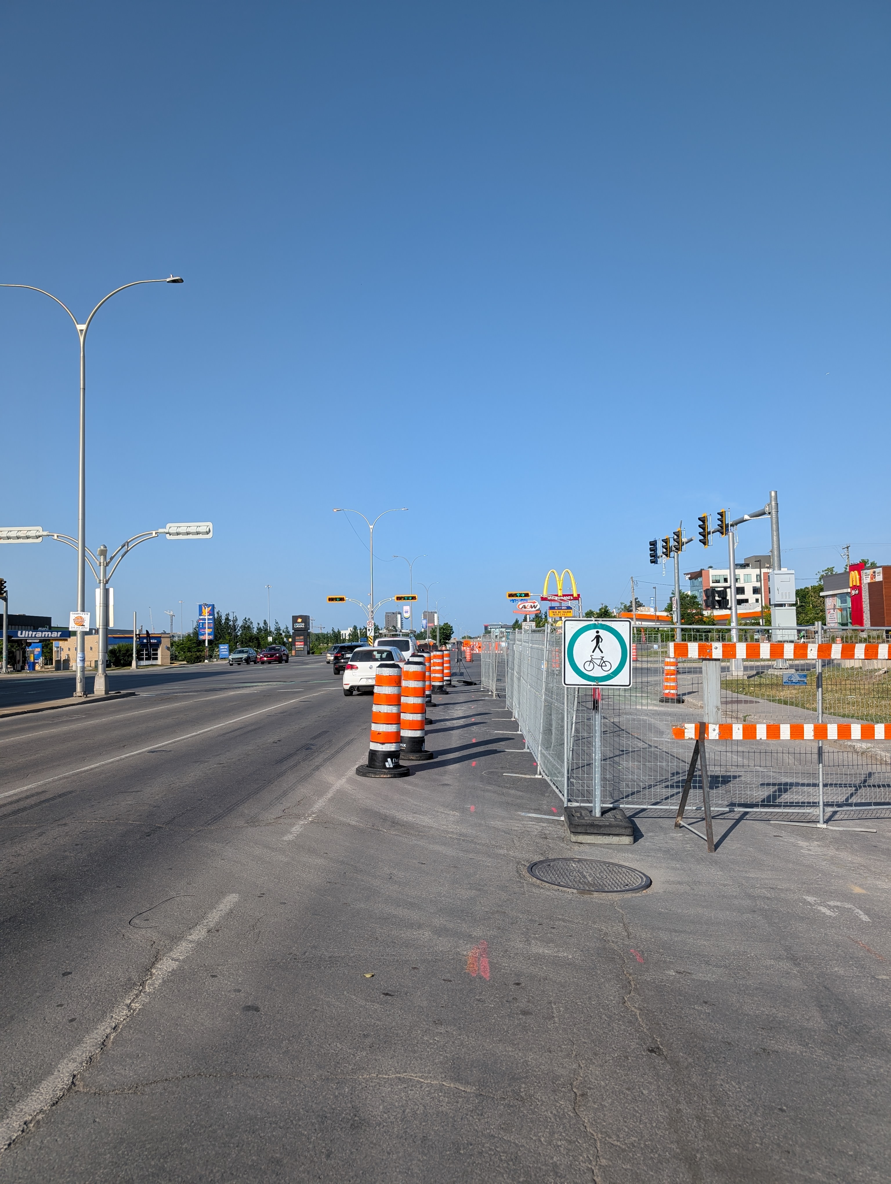 Un bon exemple où le trottoir à été ajusté est la travée nord du segment près du centropolis (environ entre l’A-15 et la promenade du Centropolis), où la faible largeur d’emprise disponible/un rétrécissement de la chaussée carrossable avait forcé l’implantation d’une section avec circulation cyclable sur le trottoir du côté nord dans l’implantation transitoire. Nous avons réussi à élargir légèrement au dos du trottoir dans le projet de 2025, permettant de séparer plus clairement circulation piétonne des personnes à vélo, mais une petite section demeure plus tight en raison de structures de feux qu’on ne pouvait pas toucher. Ça demeure une amélioration par rapport à un trottoir où la cohabitation pouvait être difficile.