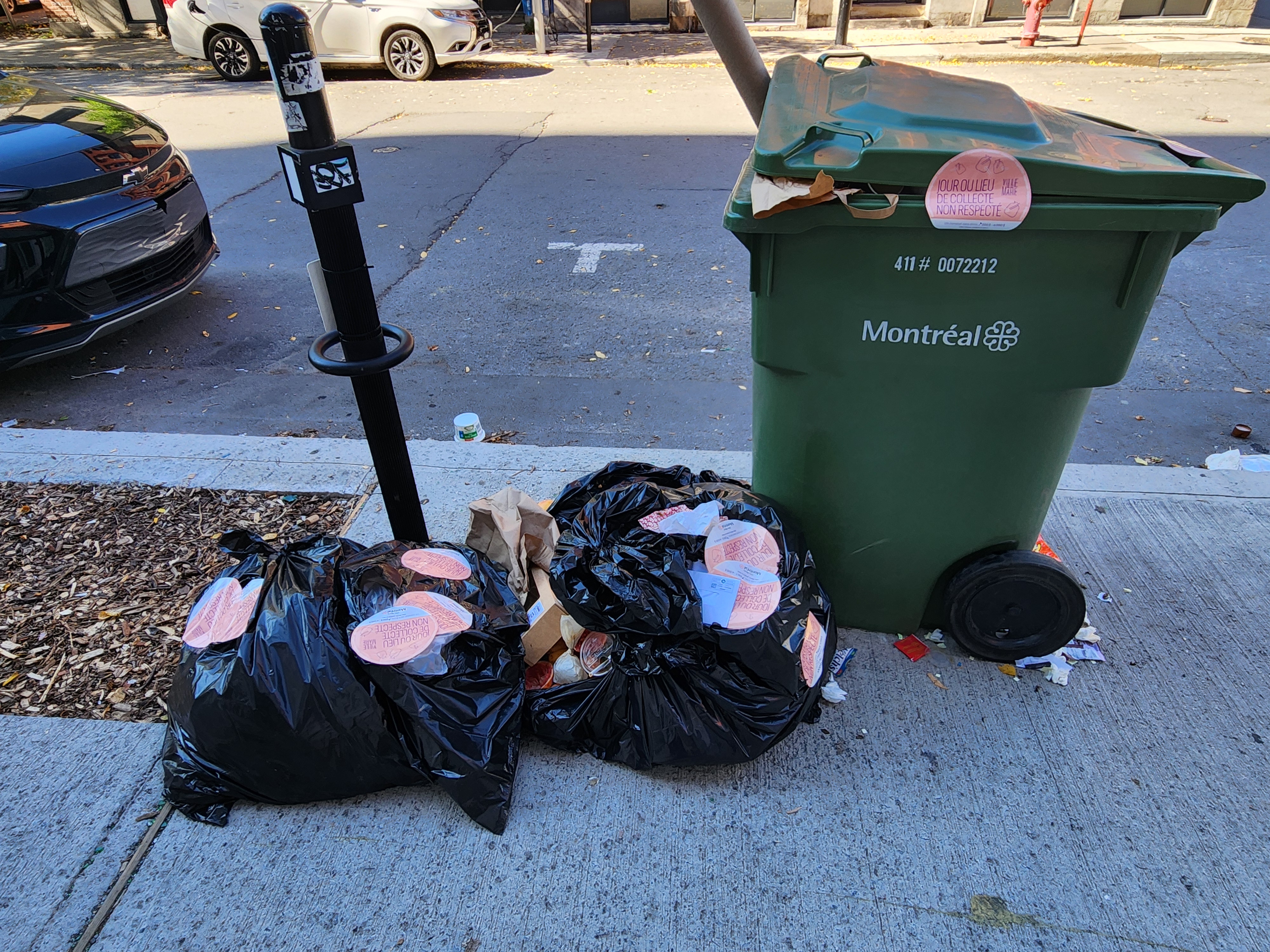 On a l’habitude de coller des collants lorsque les déchets sont déposés en situation d’illégalité, mais je me demande pourquoi on en colle autant? Ce n’est pas très écologique comme mesure, avec un certain gaspillage de plastique. Un collant par sac devrait suffire, non?