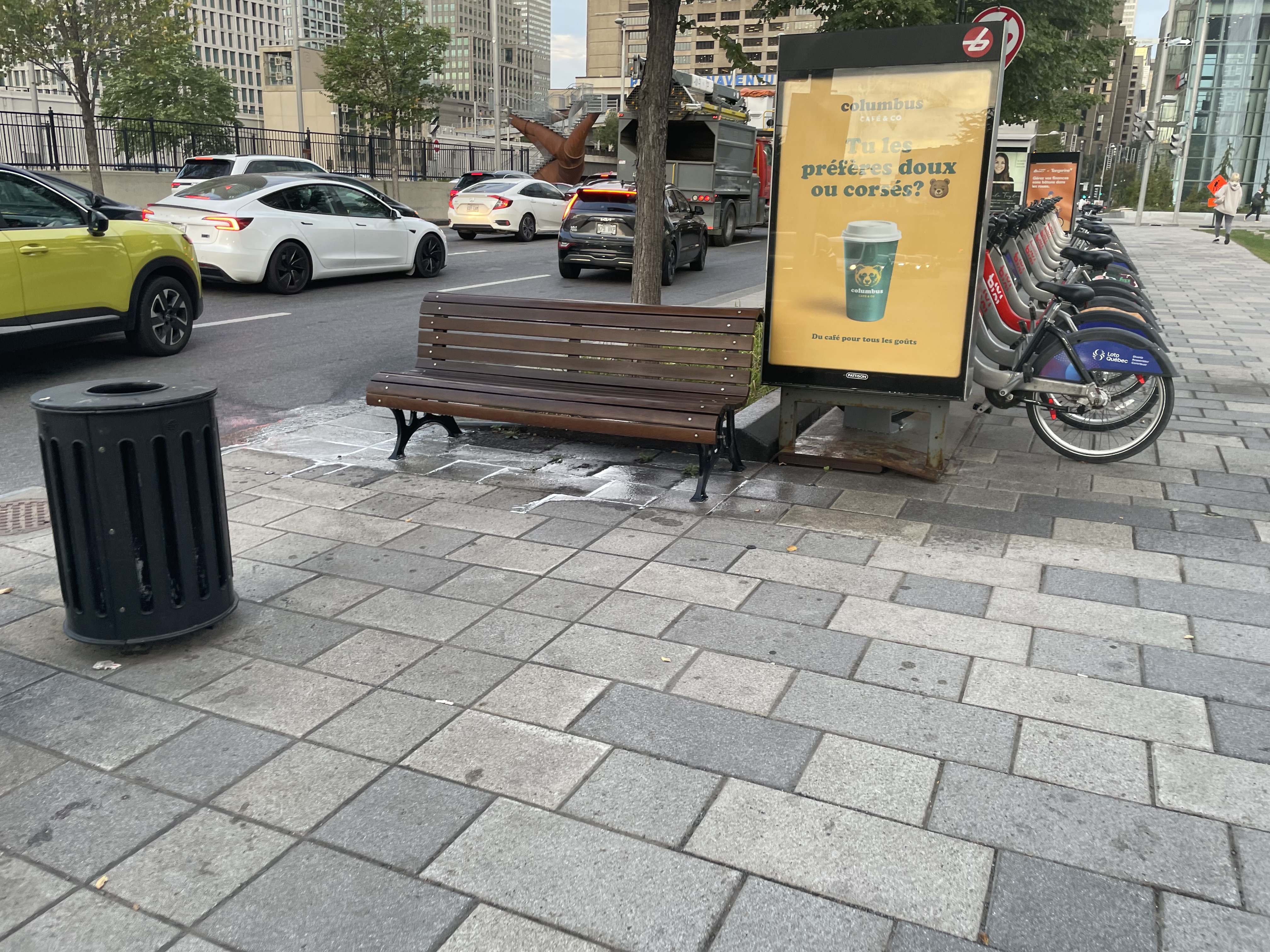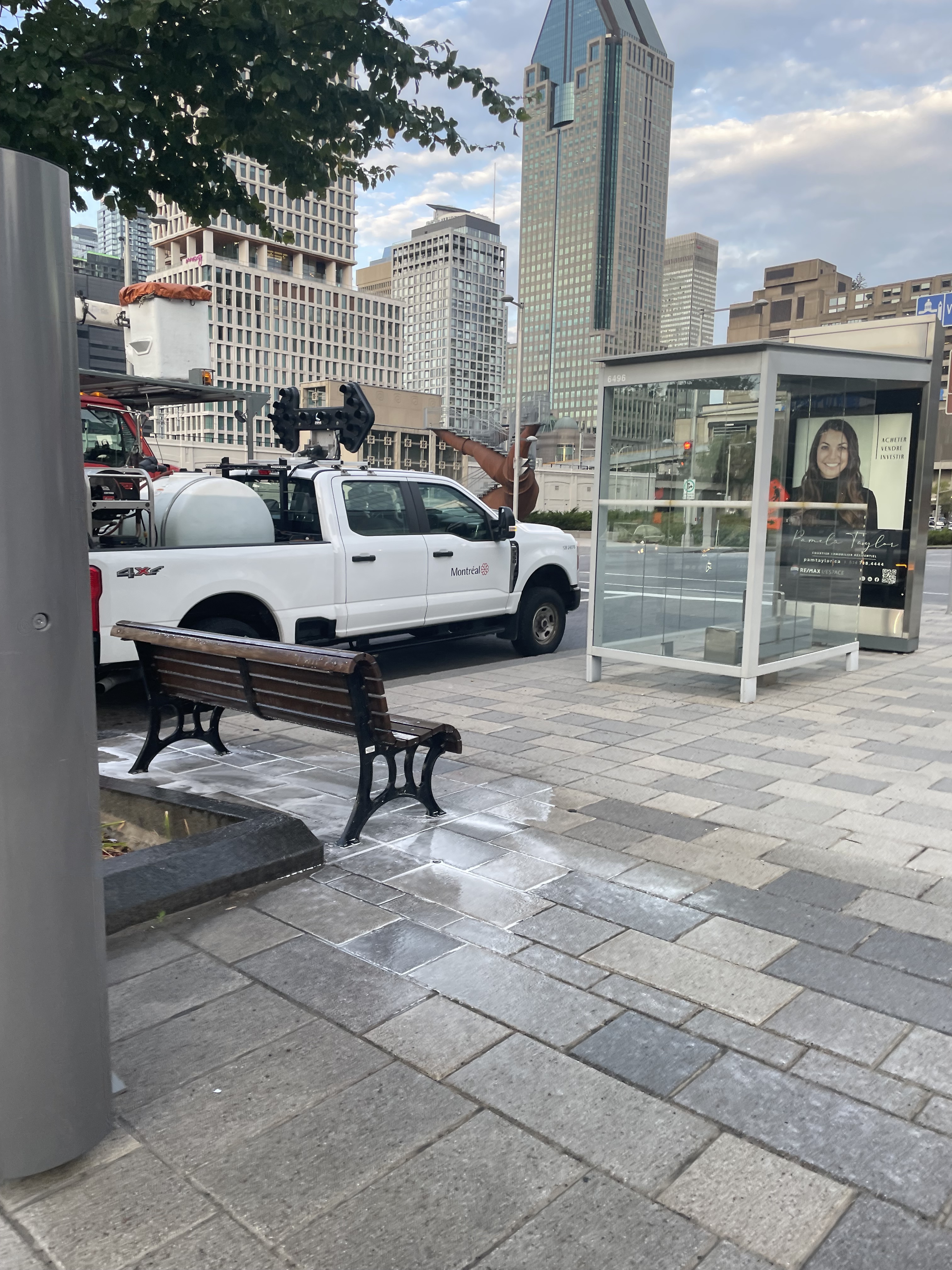 Nettoyage à pression des bancs le long du boul. Robert-Bourassa ce matin