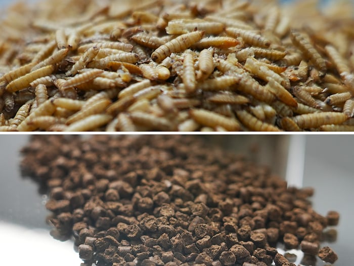 Une fois bien nourries, les larves peuvent être vendues séchées comme source de protéines (photo du haut) et les résidus de substrat sont commercialisés sous le nom « frass », un fertilisant (photo du bas).