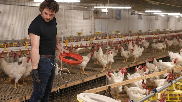 Jérémy Lavoie nourrit de jeunes coqs avec des larves de mouches soldat noires séchées.