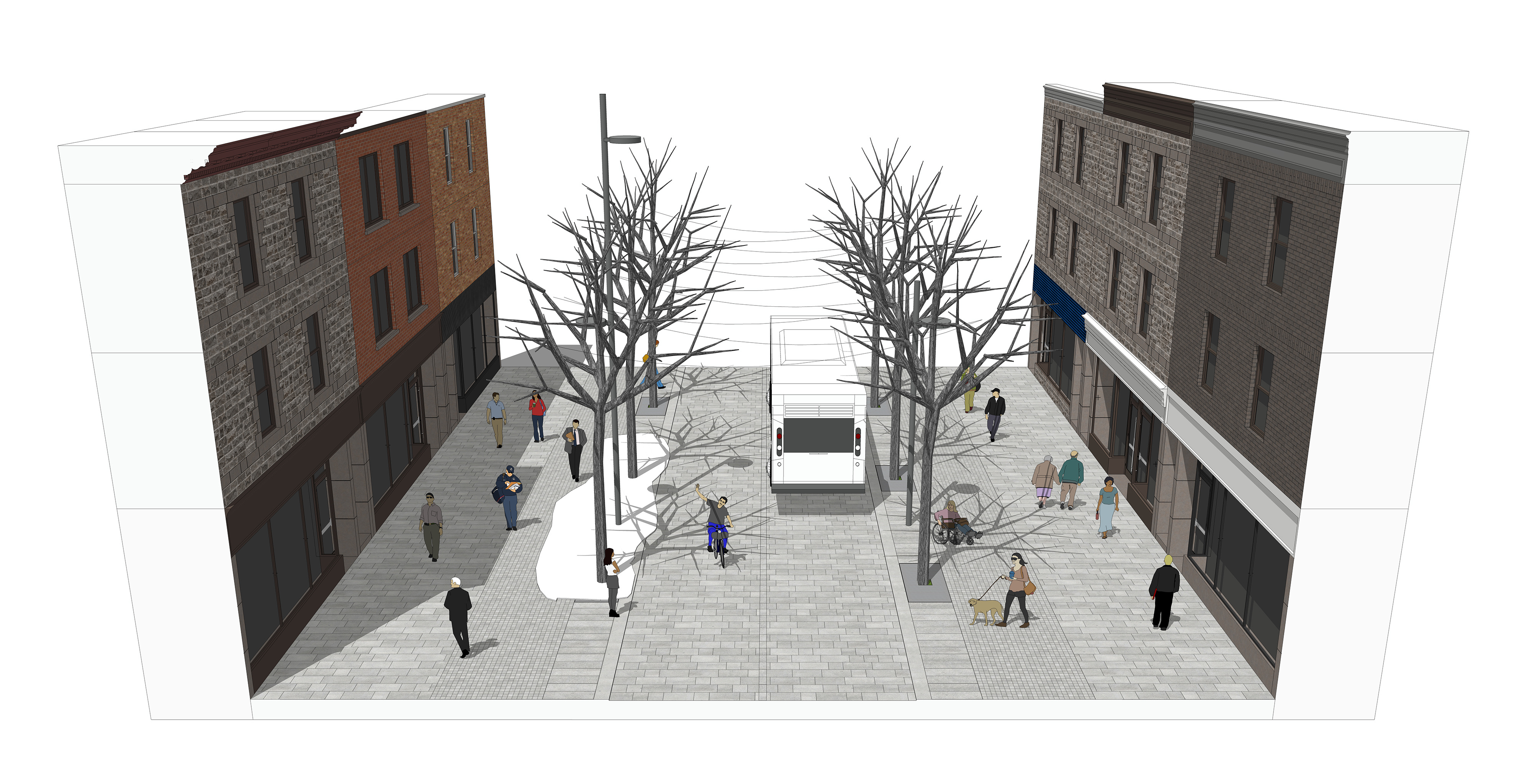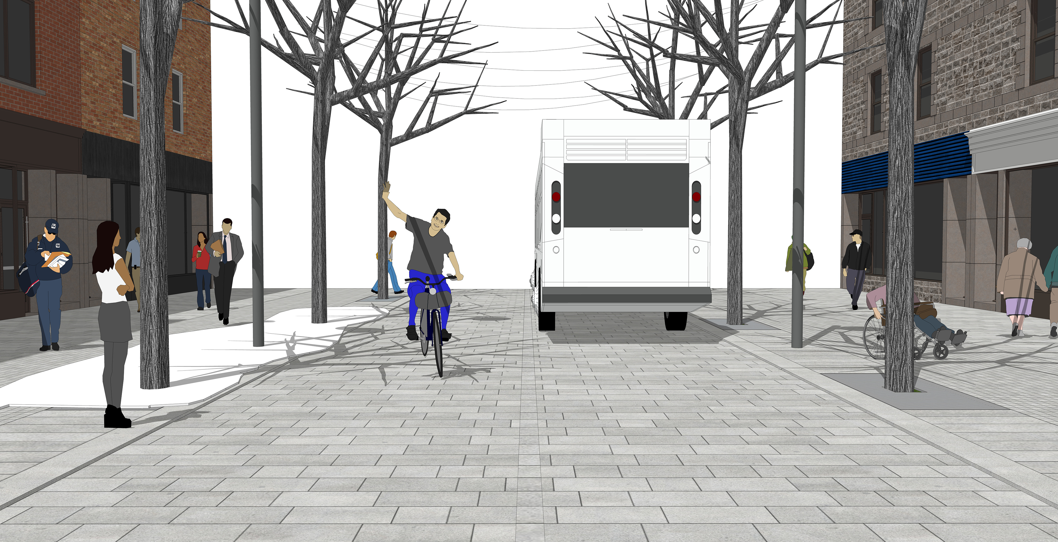 En hiver, l’avenue du Mont-Royal demeure un lien important pour le transport collectif. L’aménagement d’une rue flexible permettrait de maintenir une piétonnisation forte et continue durant l’été, tout en permettant le passage du transport collectif le reste de l’année.