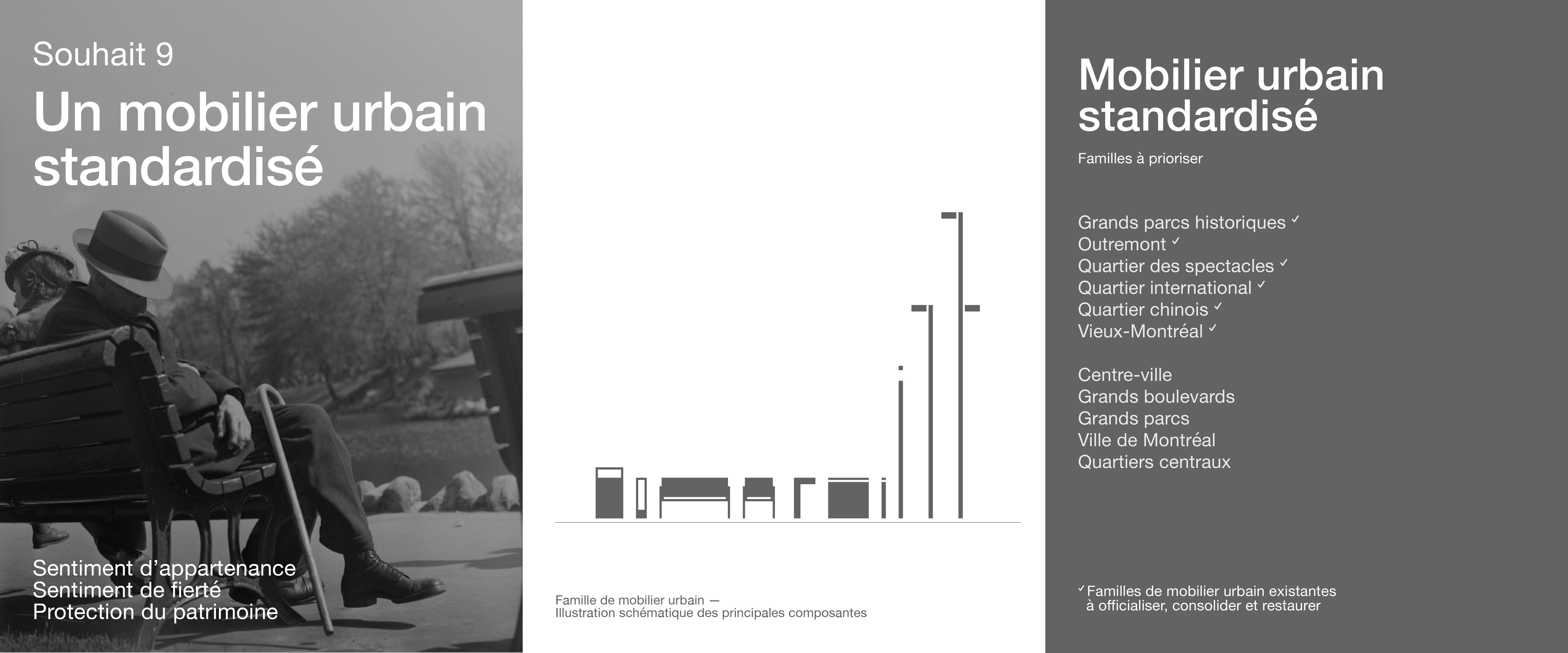 9.1 La mise en place d’un inventaire des familles de mobilier urbain emblématiques de Montréal, à officialiser, consolider et restaurer ;