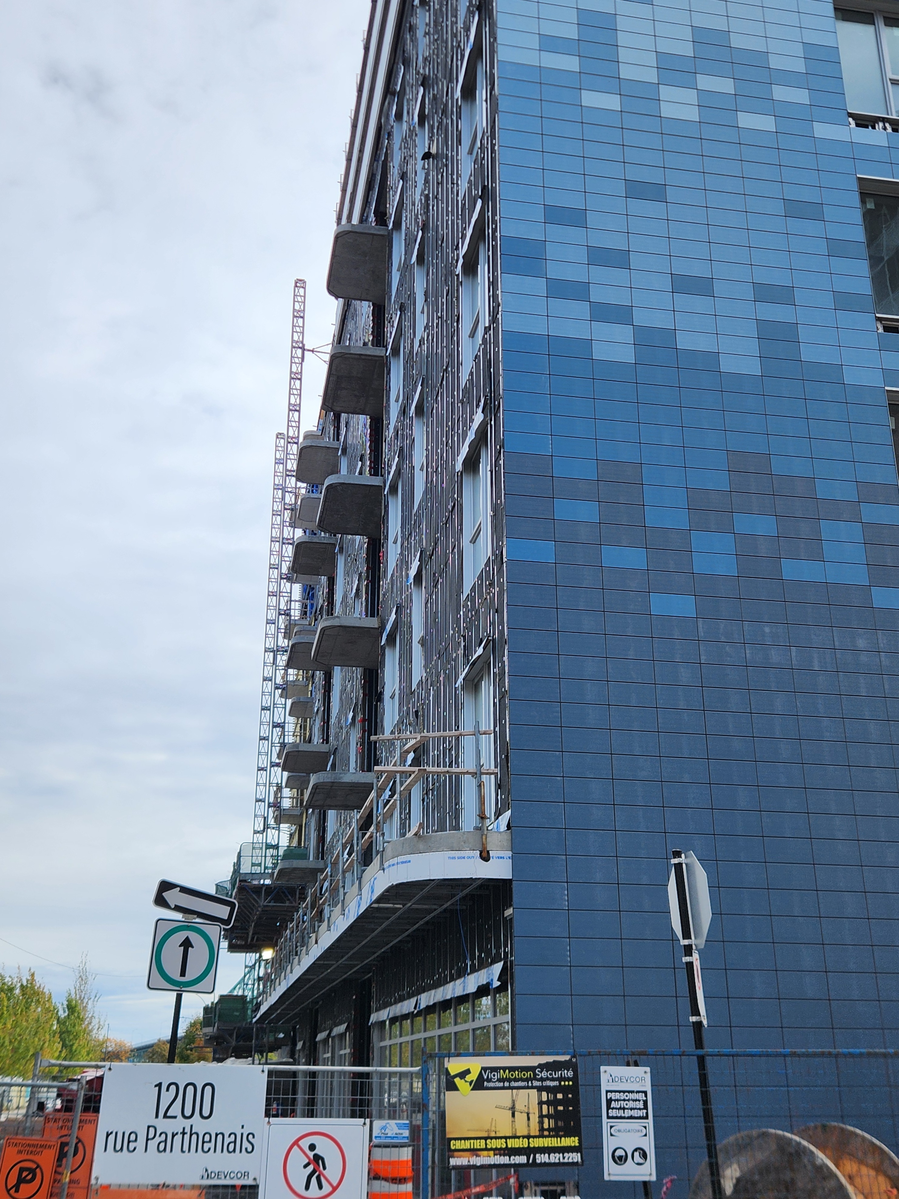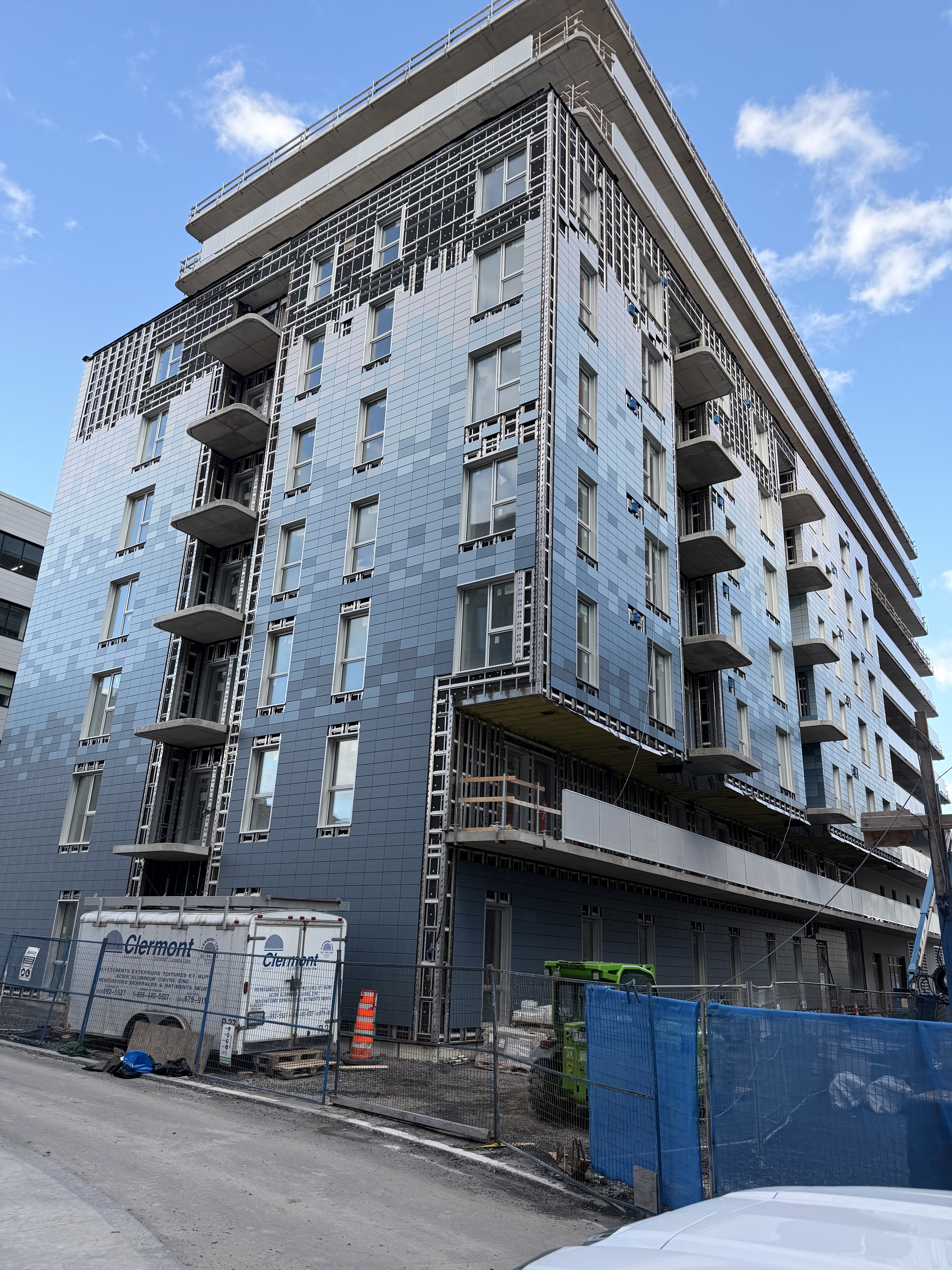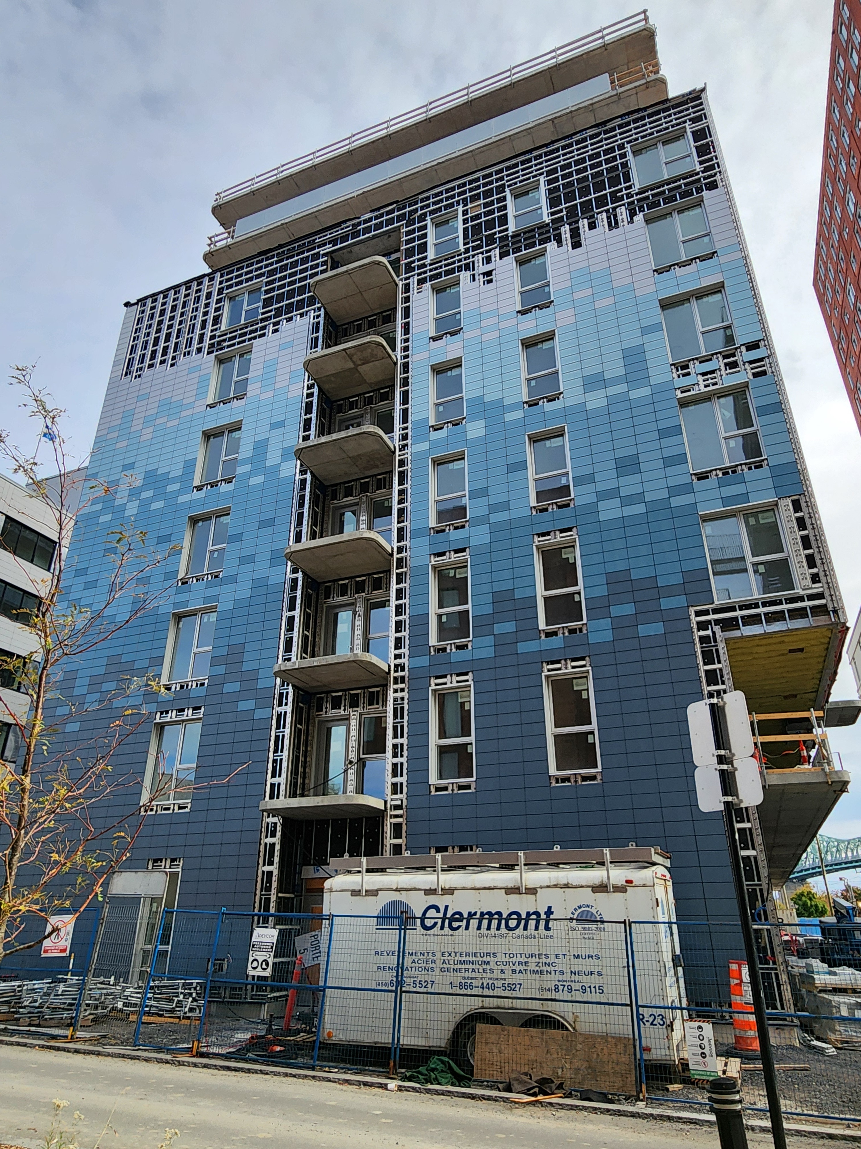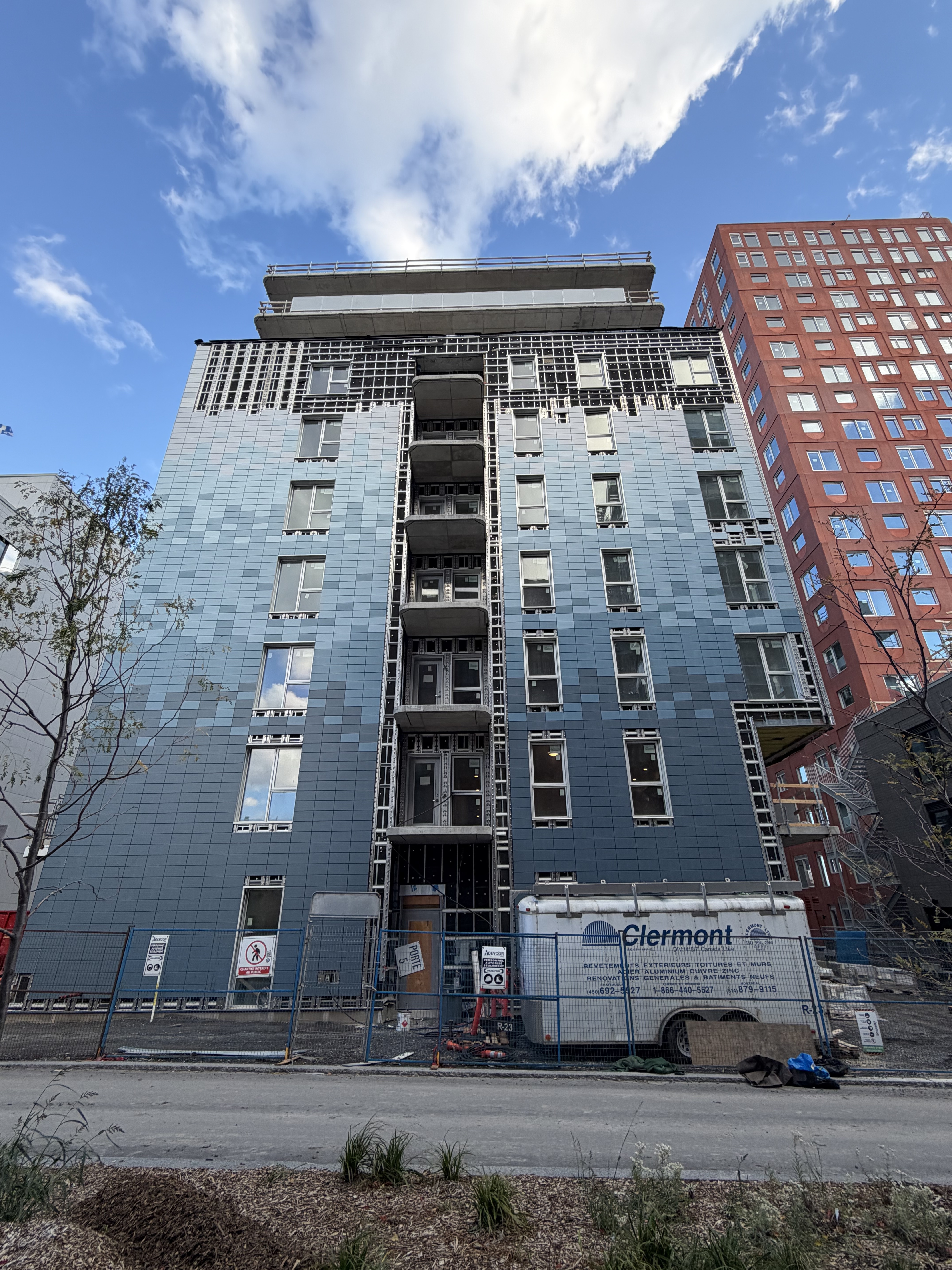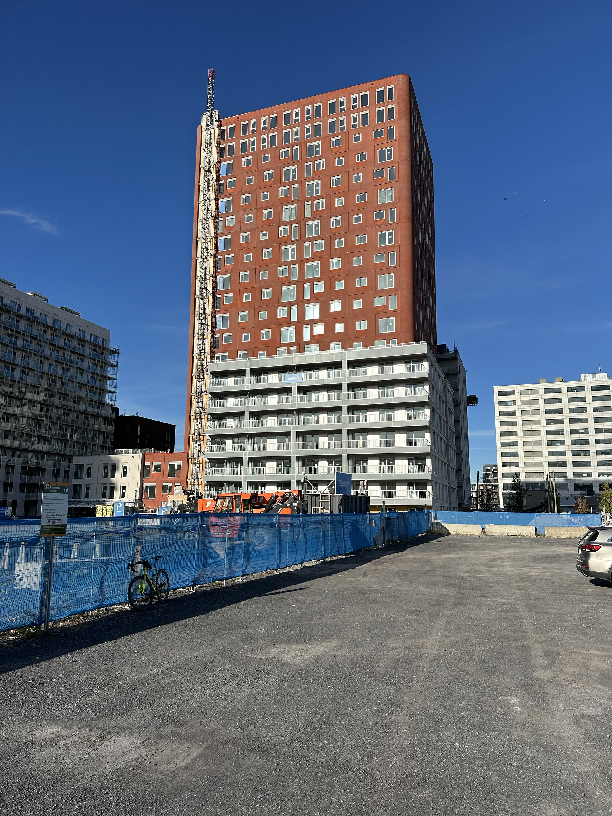 La tour de logements communautaires avance bien sur la rue Parthenais. Les oeuvres d’art peintes sont super jolies. Le terrassement est complété du côté de l’ilôt 2, rue Tansley. Une belle harmonie de couleurs et de formes dans ce projet.