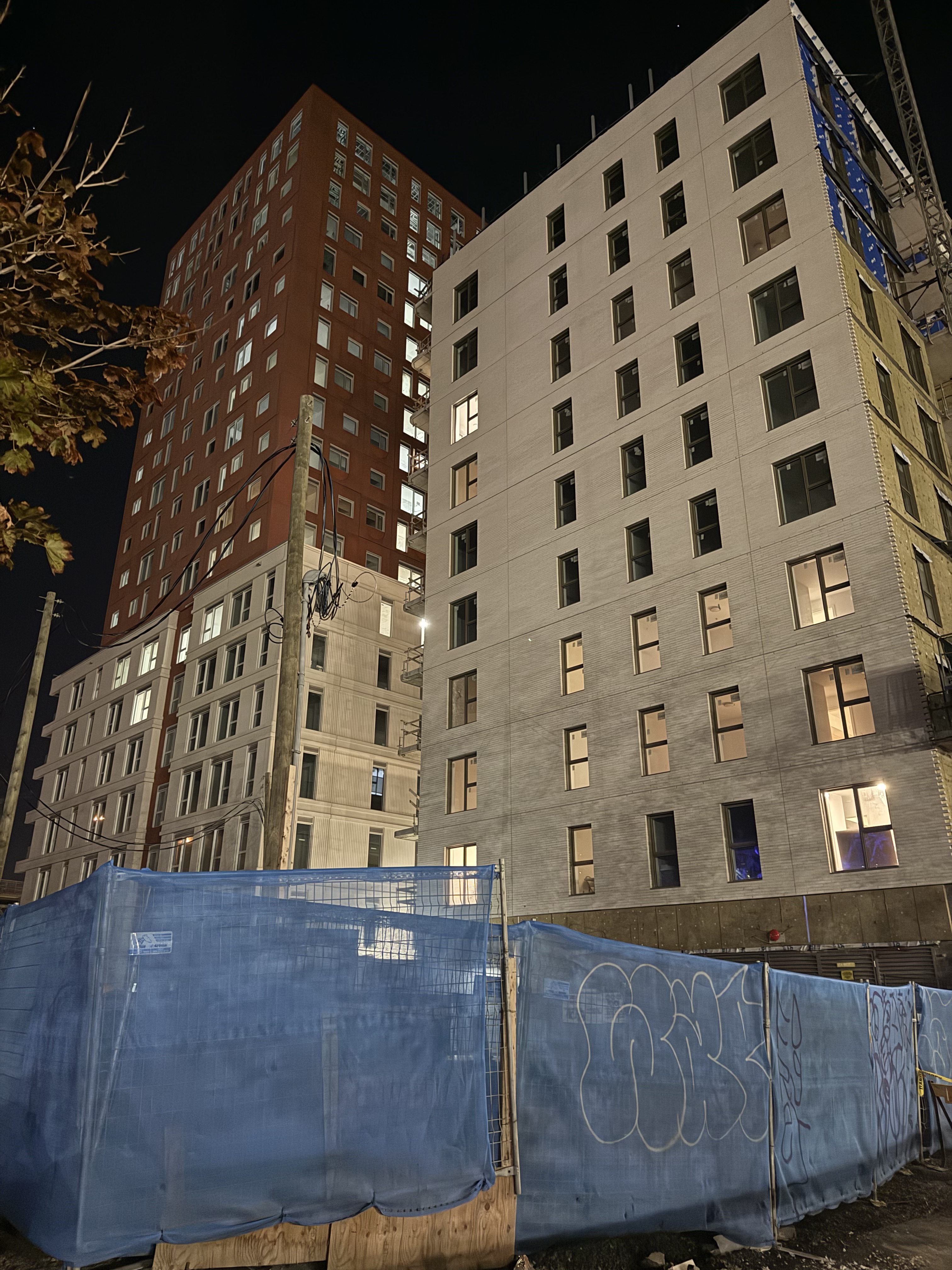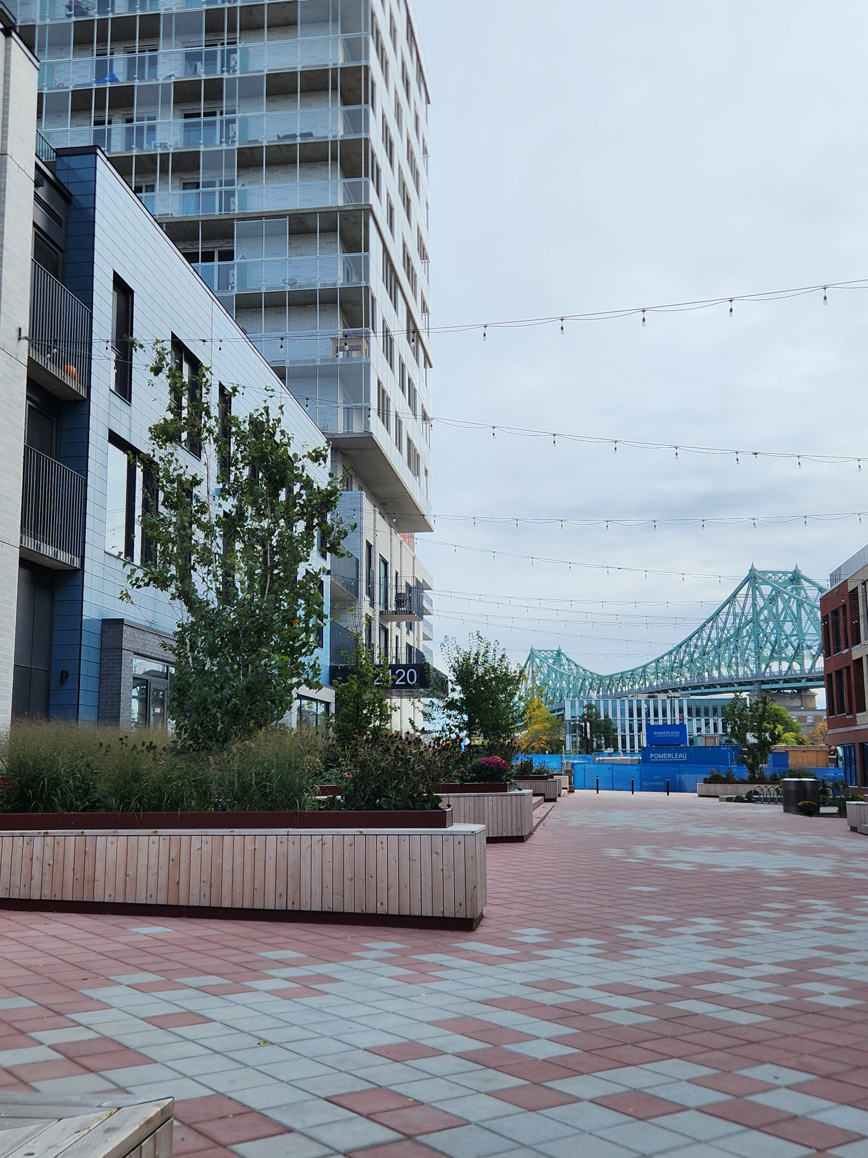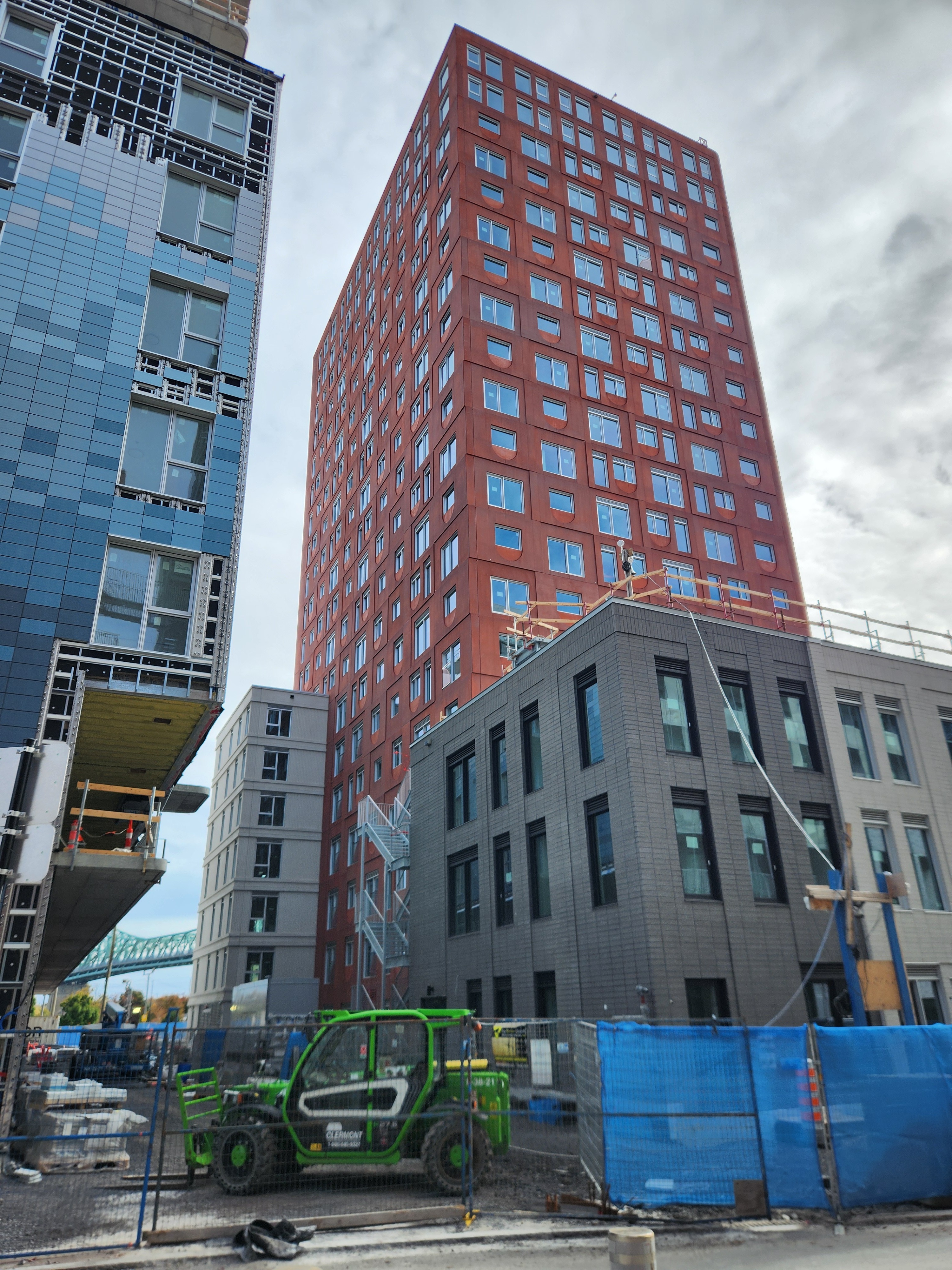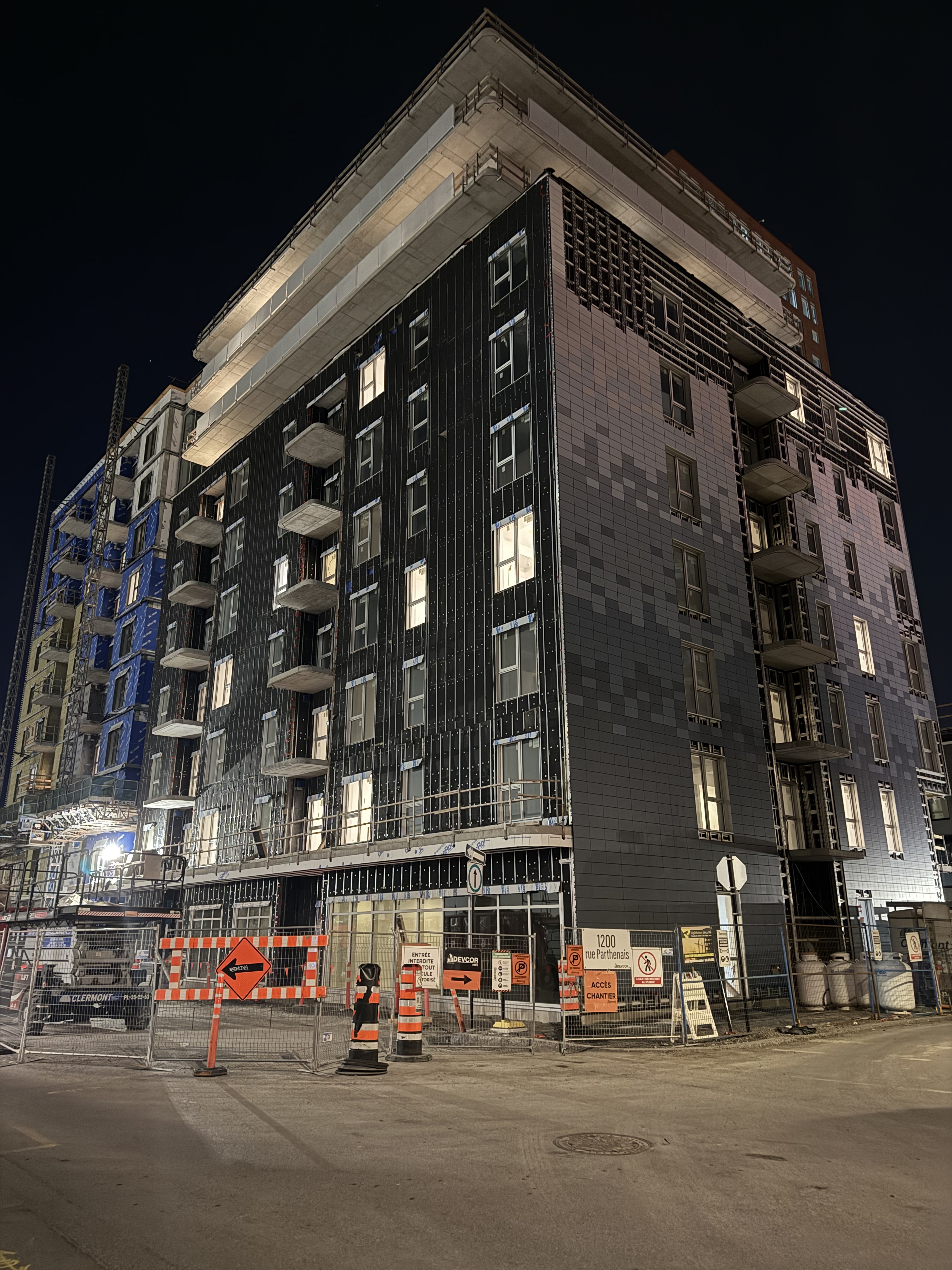 La tour de logements communautaires avance bien sur la rue Parthenais. Les oeuvres d’art peintes sont super jolies. Le terrassement est complété du côté de l’ilôt 2, rue Tansley. Une belle harmonie de couleurs et de formes dans ce projet.