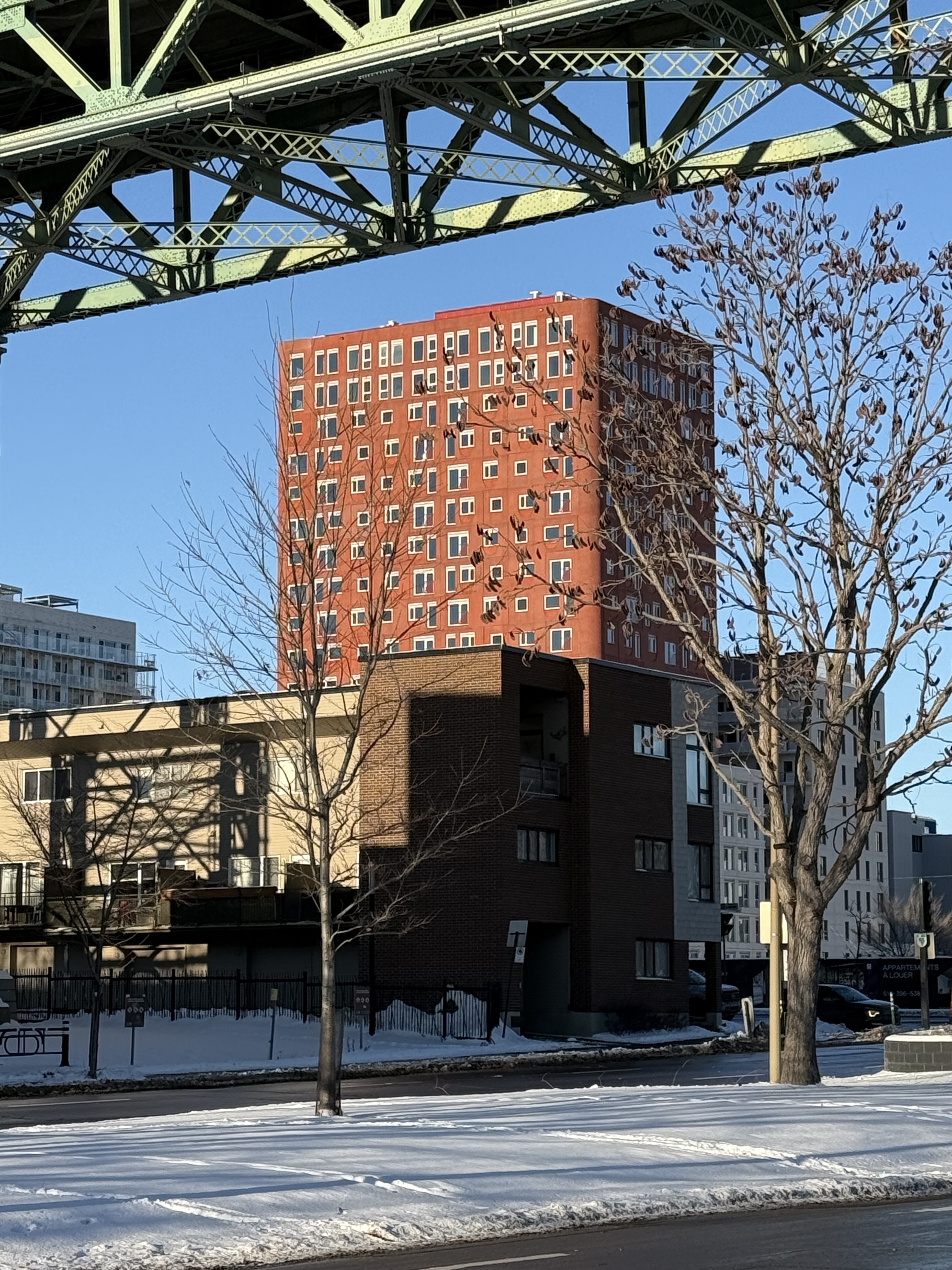 En fait ce qui aurait pu bien fonctionner c’est une enseigne qui sort de l’immeuble plutôt que le long de celui-ci. Je m’excuse mes connaissances de l’architecture sont limitées et je ne sais pas comment ça s’appelle.