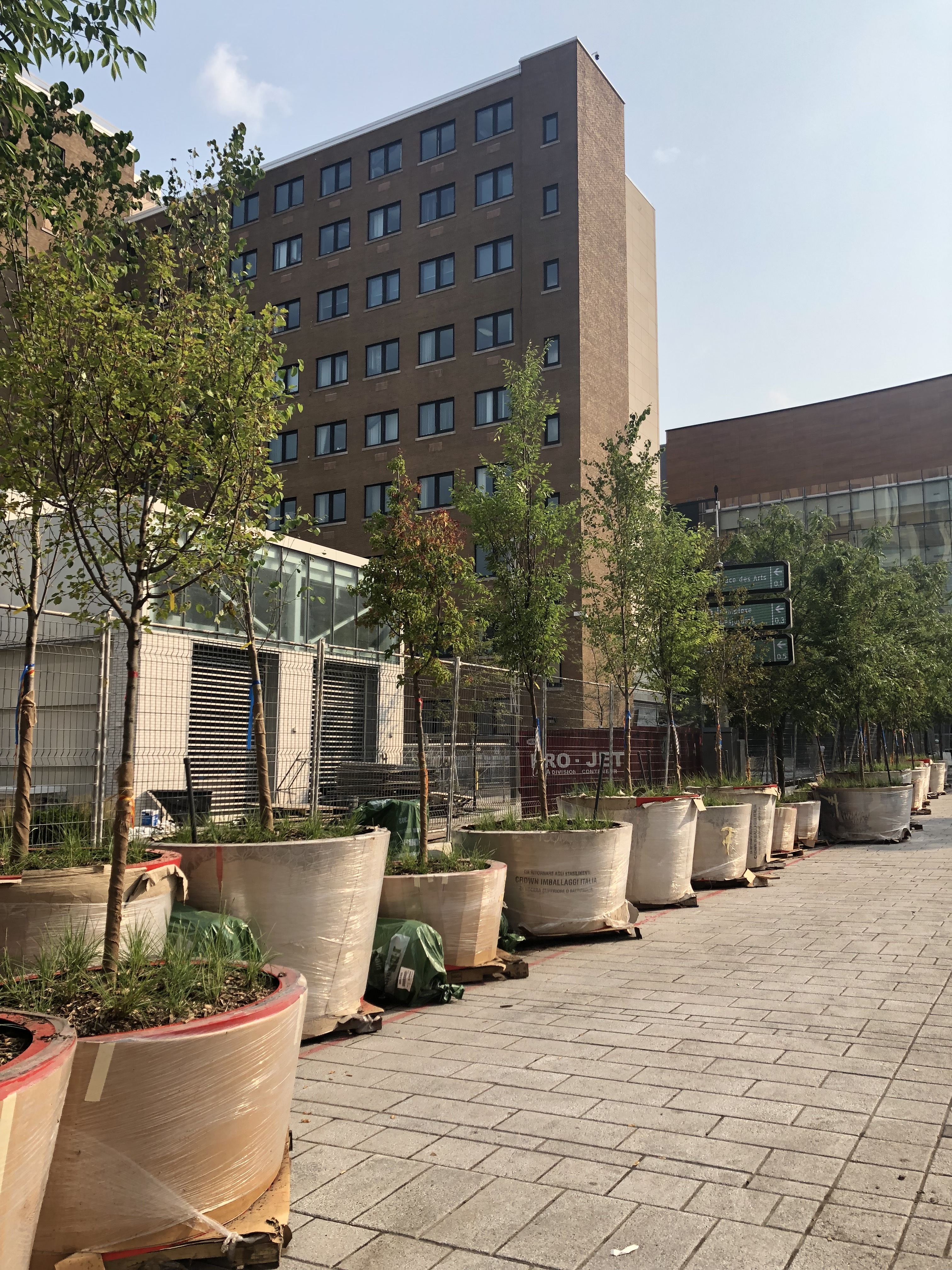 Il s’agit d’une simple reconstruction de trottoir et non de la rue. Élargir les trottoirs pour planter des arbres auraient probablement impliqué de déplacer les infrastructures sous la chaussée (on le voit sur la photo).