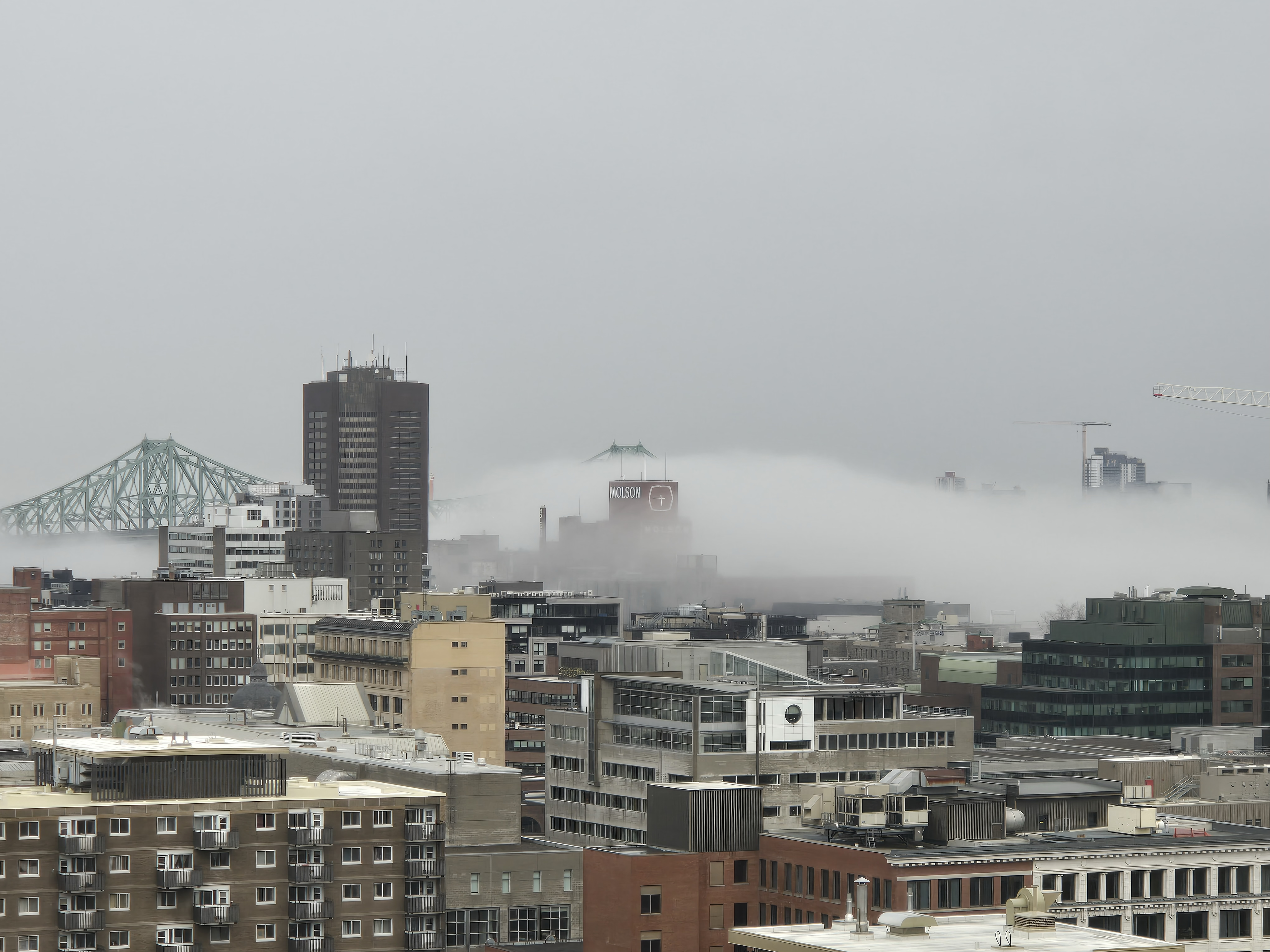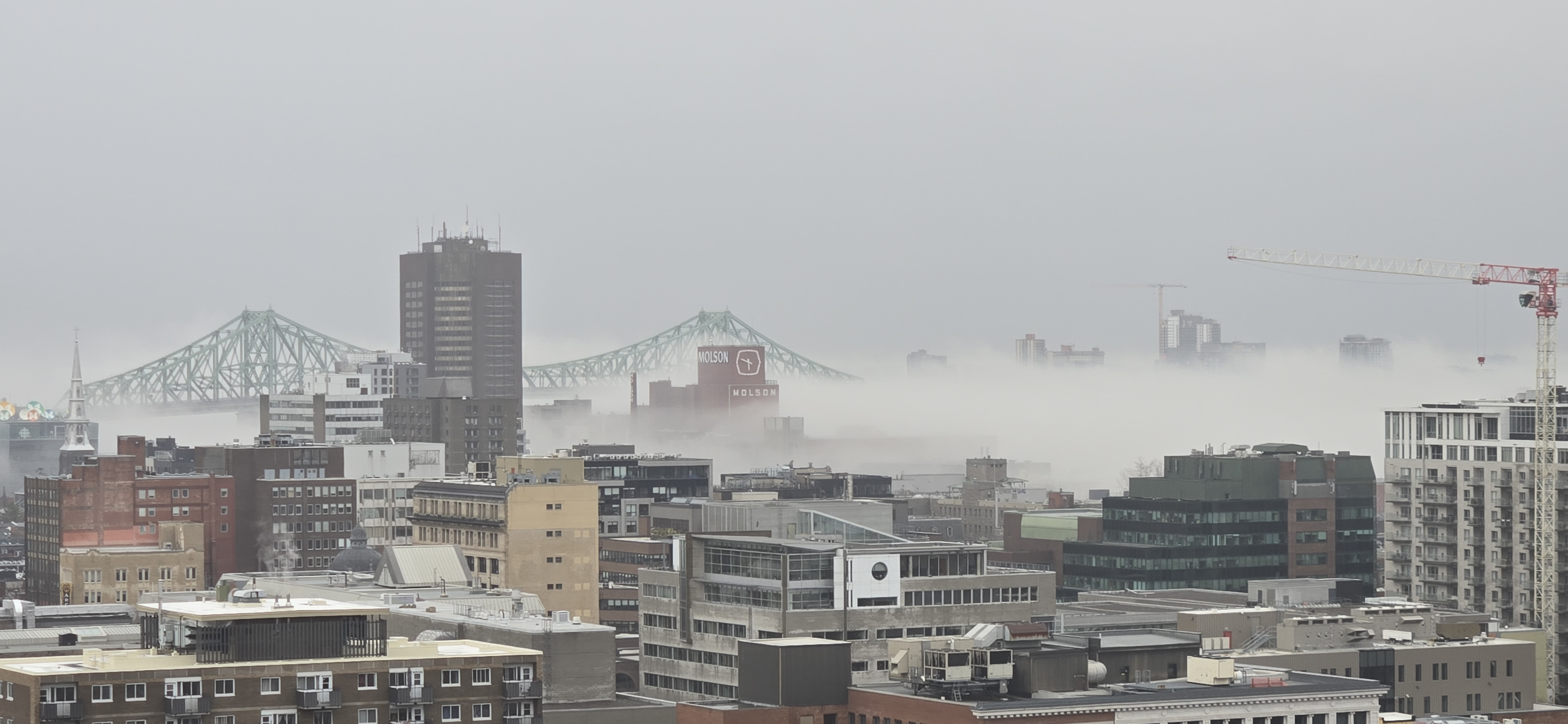 J’ai vu beaucoup de confusion ces dernières heures entre le smog et le brouillard. Oui il y a du smog, mais c’est du brouillard que l’on voit. Le smog est présent depuis quelques jours déjà, par exemple, hier après-midi, on avait de la difficulté à distinguer les immeubles lointain, le mont Royal. Le smog est plus foncé, plus gris et surtout, n’a pas de formes nettes et définies. Le brouillard, lui, est plus clair et possèdes des formes. C’est pourquoi son opacité est très variable dans le temps et que selon les heures, il est plus ou moins opaque.