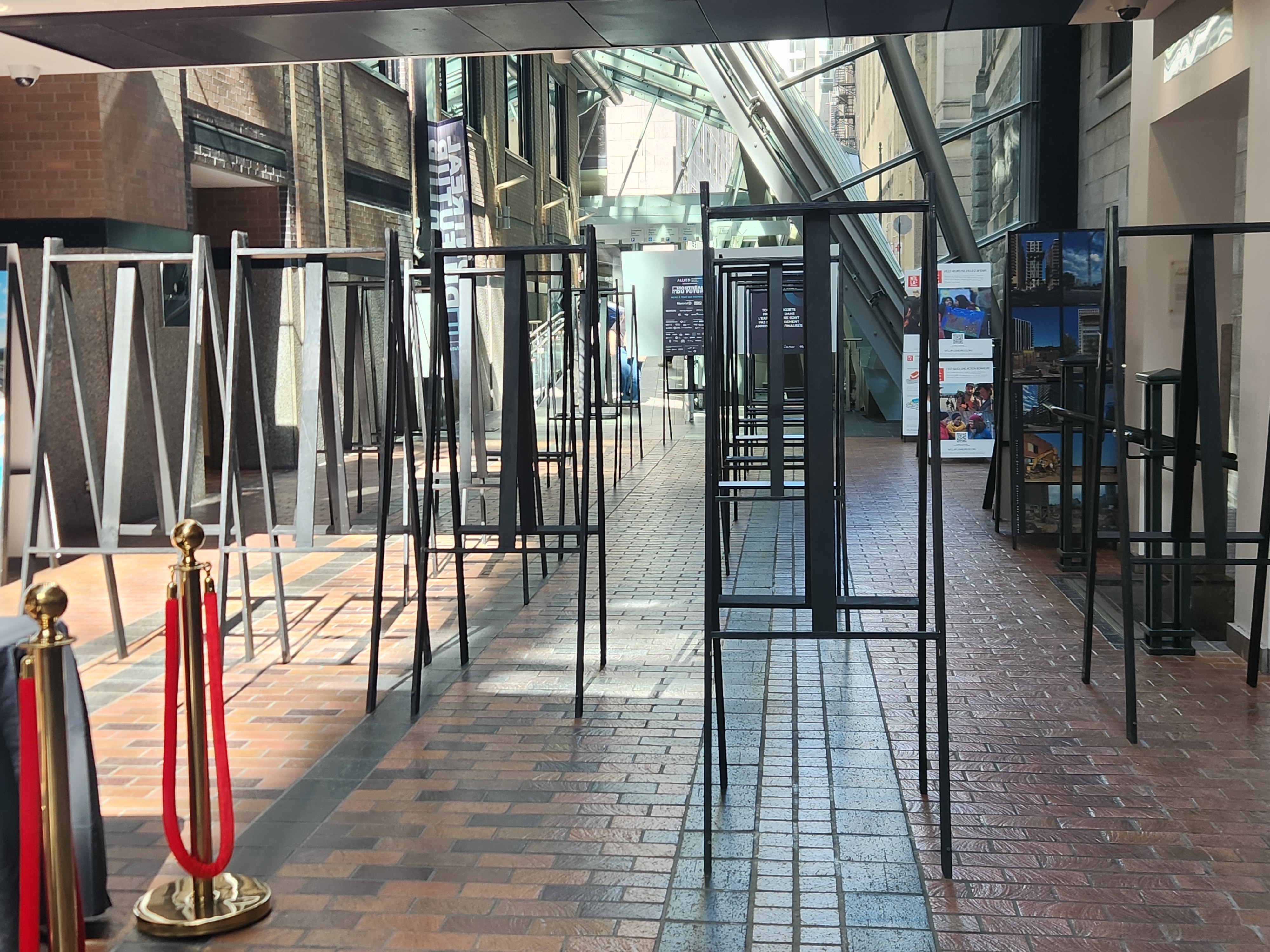 Par contre, je trouve que c’est vraiment un mauvais endroit pour tenir cette exposition. Je sais que le but est que les gens puissent tomber dessus ‘par hasard’ mais l’espace est très restreint et rend la circulation très difficile. Ça rend le CMM pas mal complètement inaccessible aux personnes en fauteuils roulants aussi.