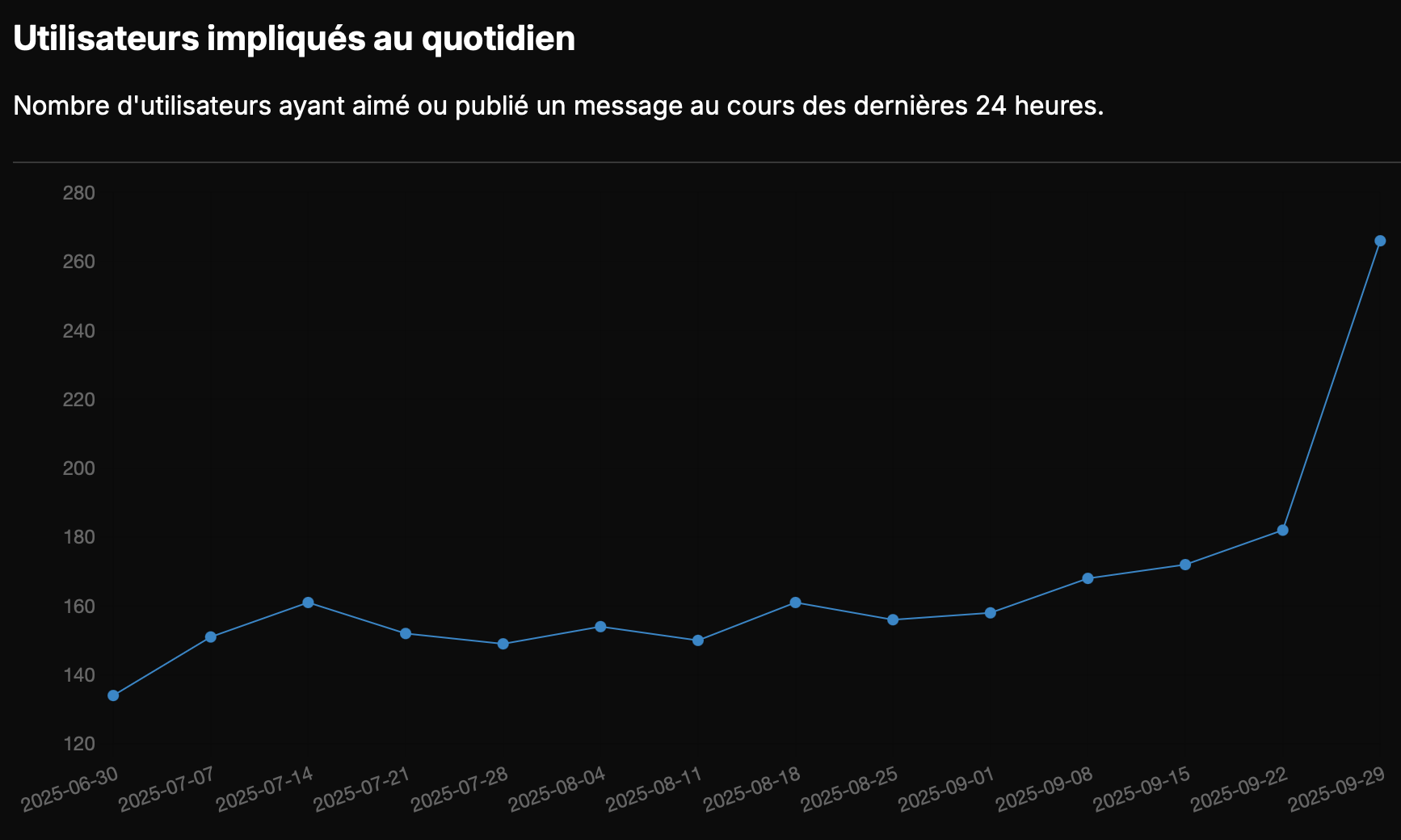 La première journée de l’exposition est dans le top 5 (le top 5 est très serré) des journées les plus achalandées en termes de trafic. On a vu 10 inscriptions, et a battu le record d’utilisateurs actifs sur le forum.