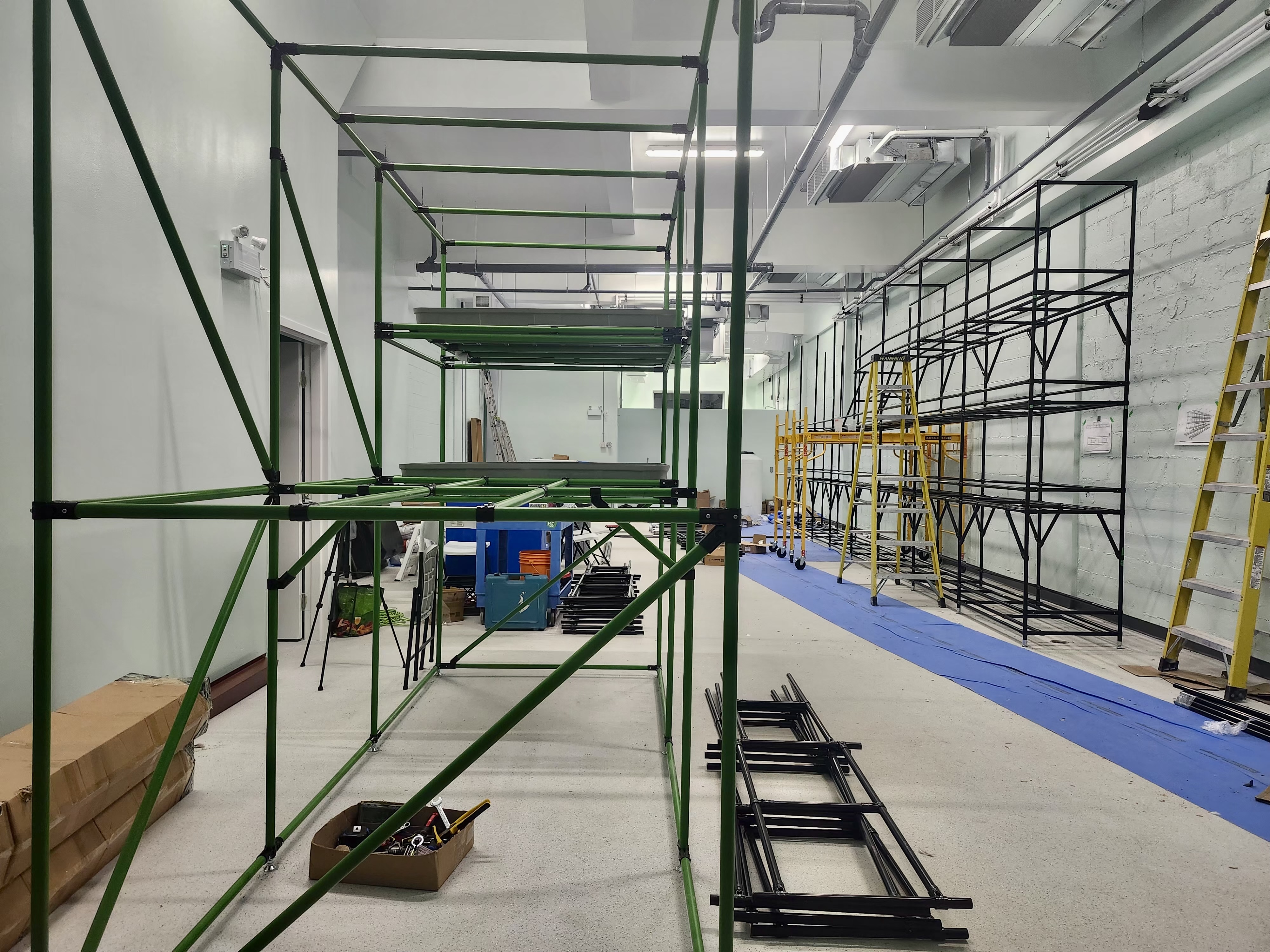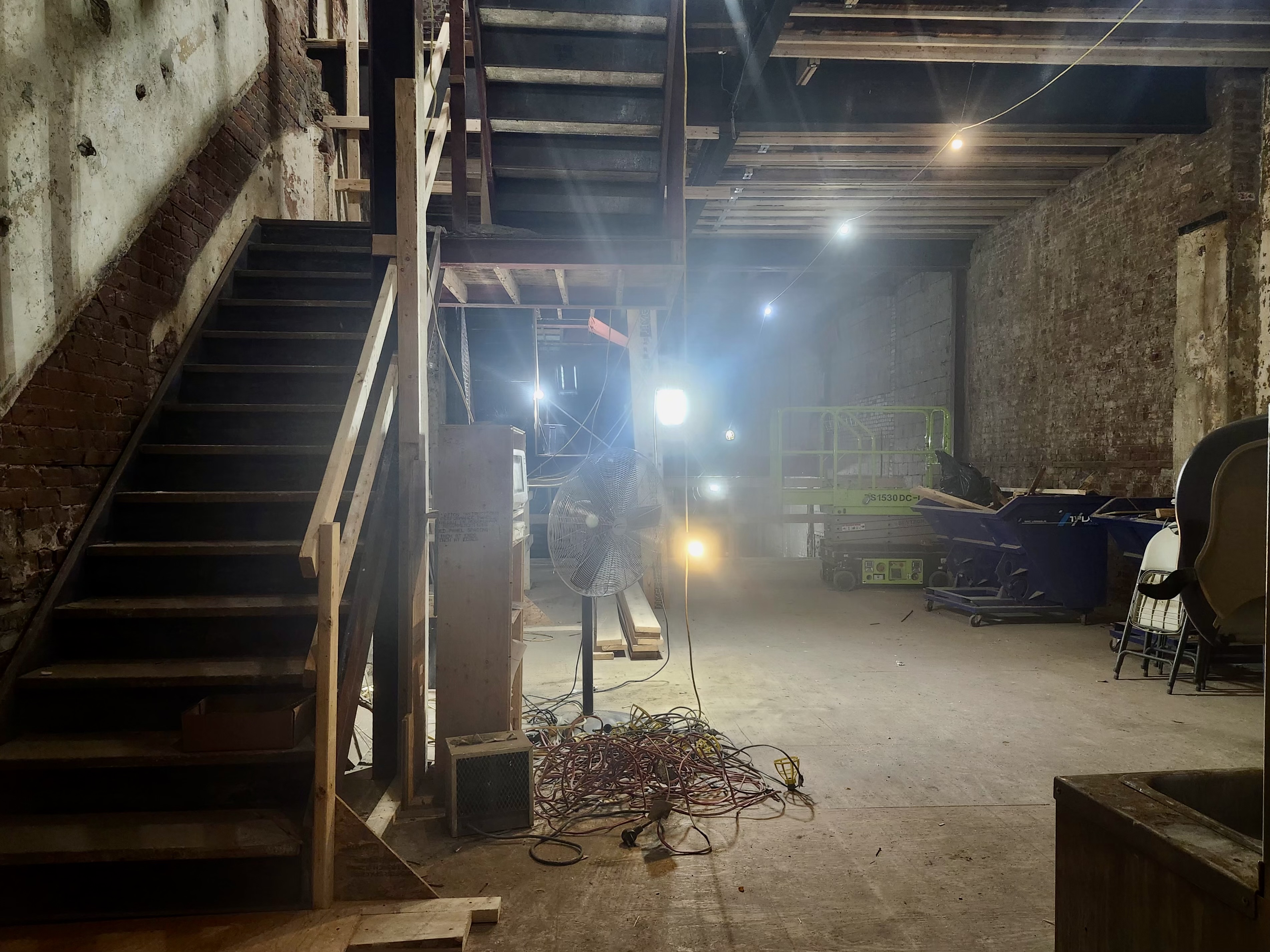 Des photos des rénovations à l’intérieur à travers la vitre le soir, comprenant la future ferme et son voisin ex-Exotica.