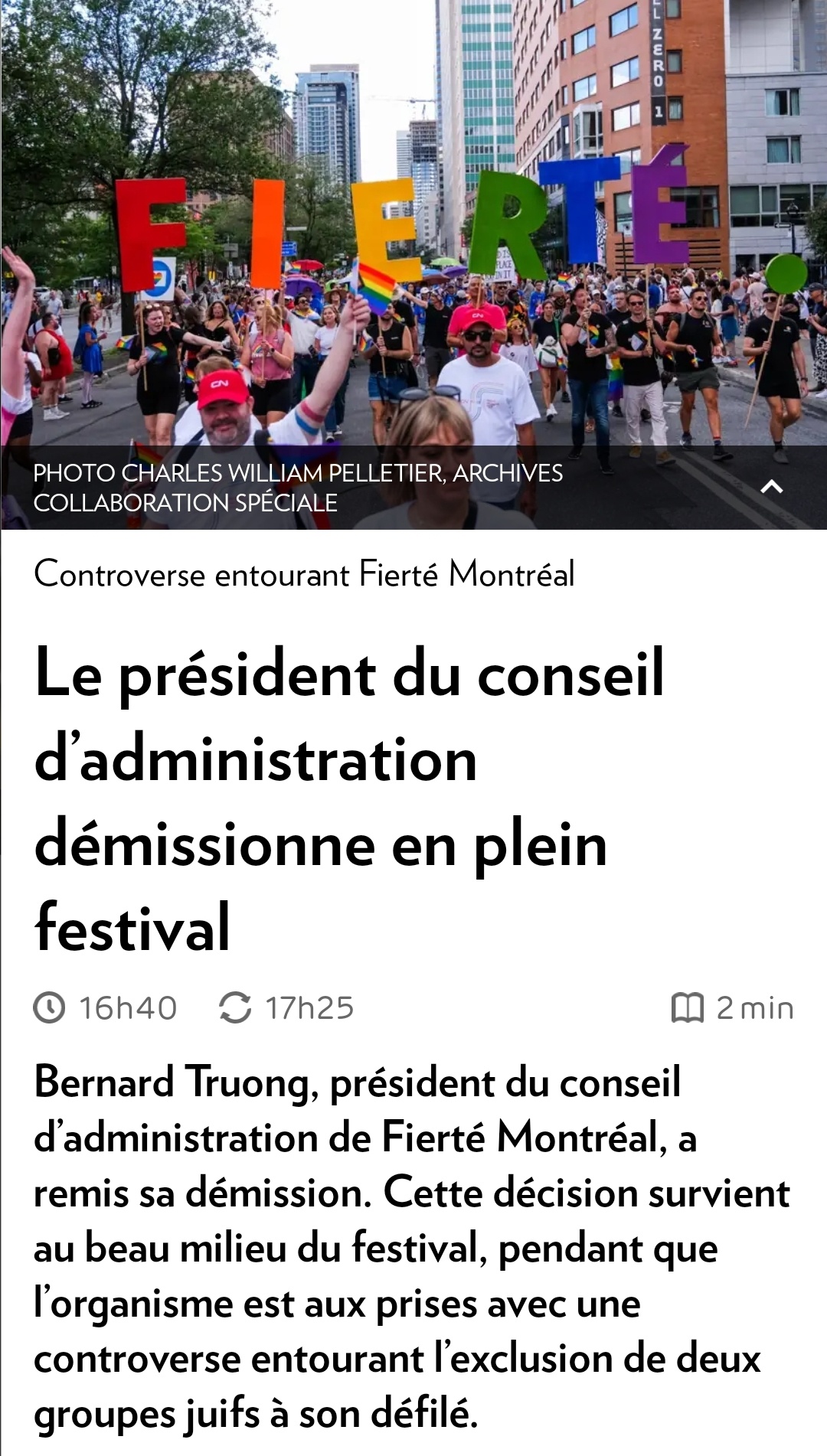 Le président du conseil d’administration démissionne en plein festival : Controverse entourant Fierté Montréal | Le président du conseil d’administration démissionne en plein festival | La Presse