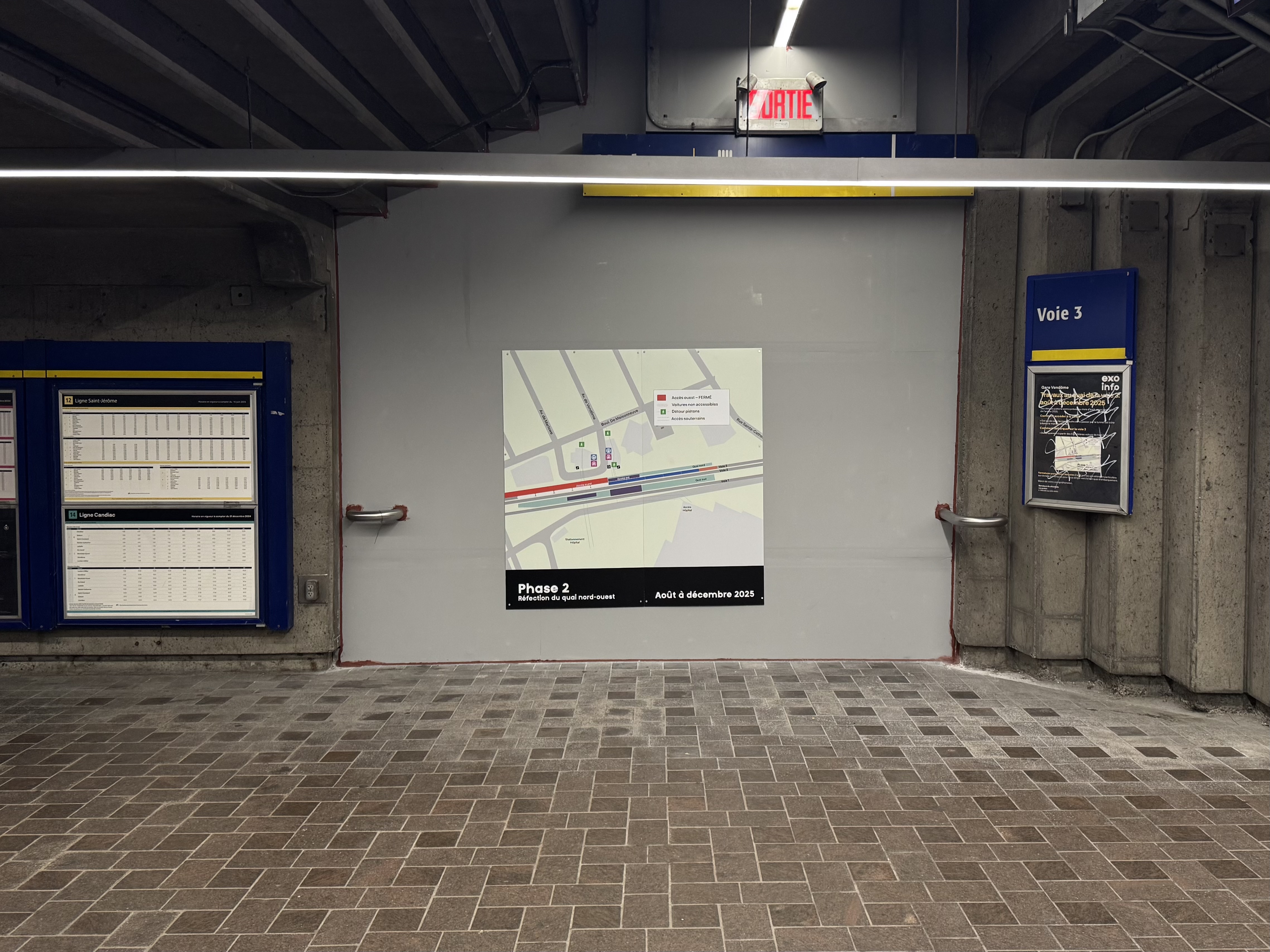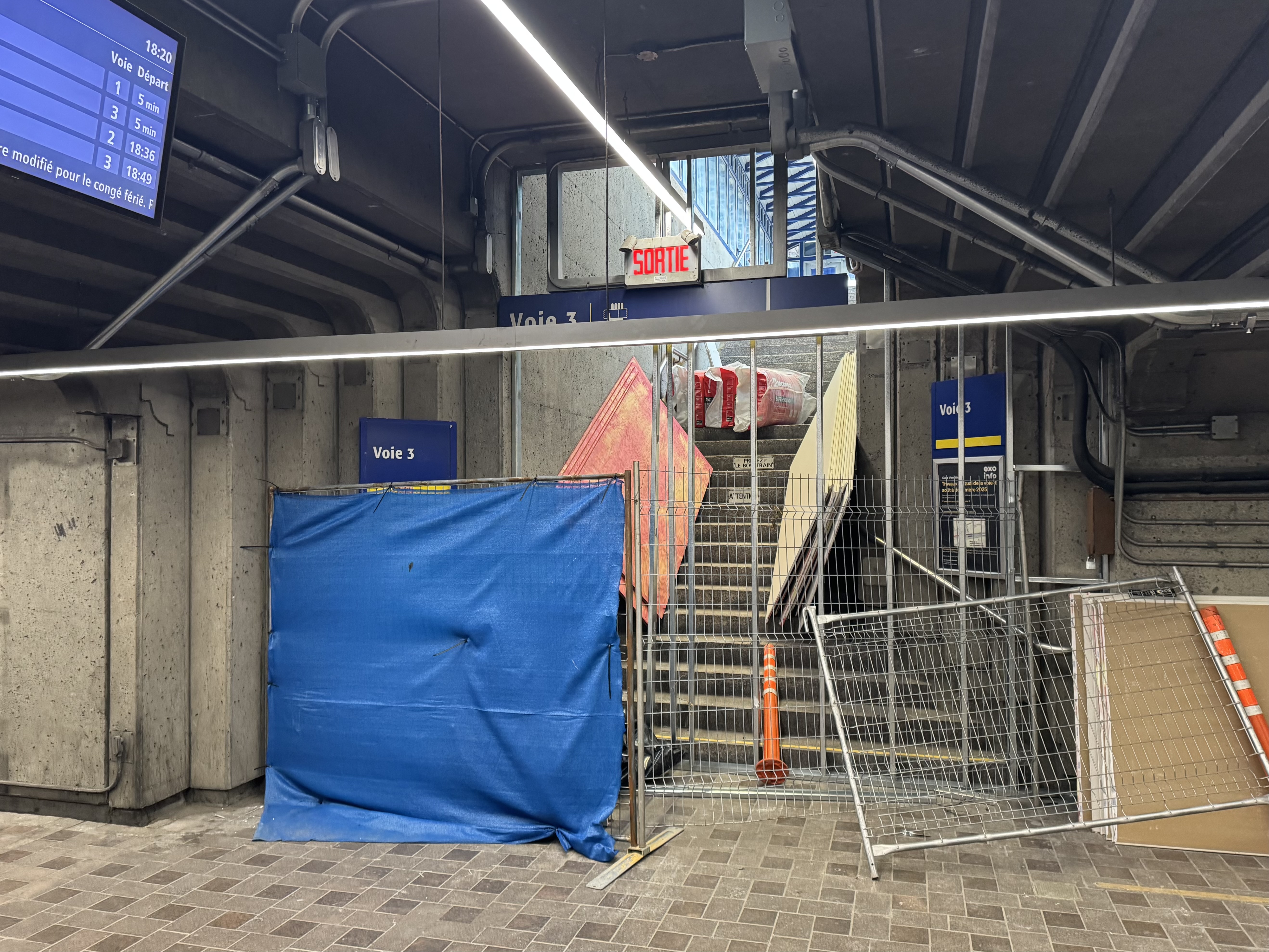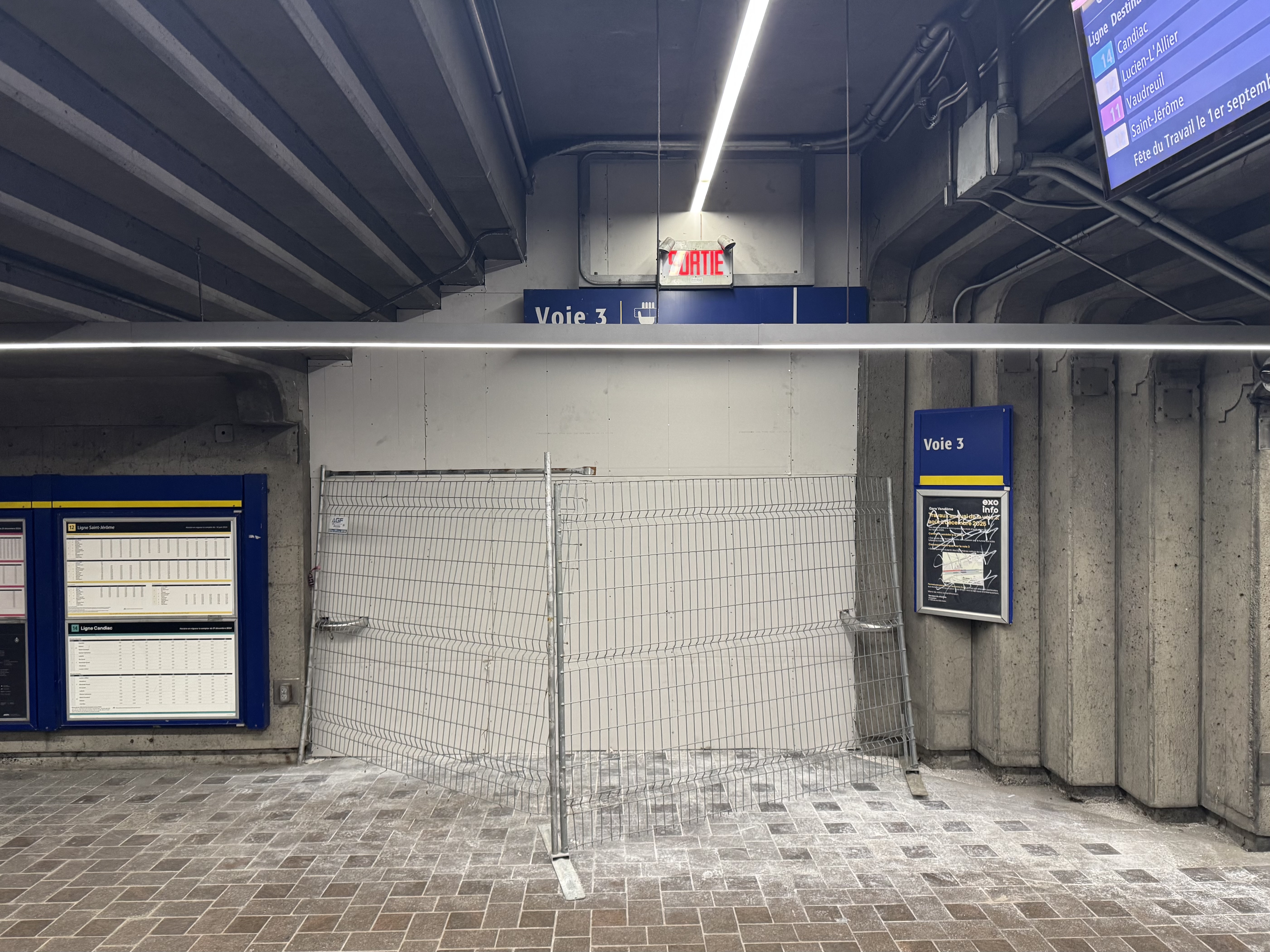 Le démontage des anciennes installations progresse. Il y a une variété de panneaux indiquant le détour, mais pas dans le tunnel menant aux quais. Lorsque je suis descendu, quelqu’un m’a tout de suite demandé comment accéder à la voie 3. Puisqu’iel avait une passe mensuelle, je lui ai suggéré de passer plutôt par le quai du métro.