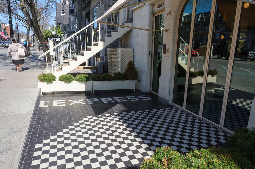 Ă la place dâune enseigne sur la façade, LâExpress a choisi de sâannoncer au sol, au-dessus dâun trottoir chauffant oĂč la neige ne se pose pas.
