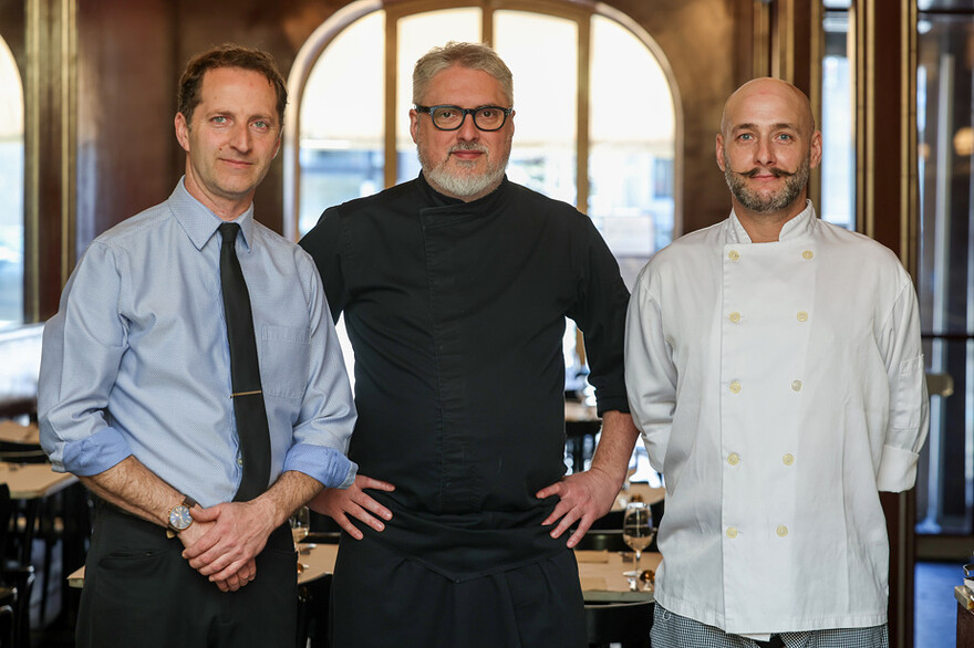 Le chef Jean-François Vachon (au centre) a pris la relĂšve des cuisines en 2016. Le maĂźtre dâhĂŽtel de jour Jacques-Yves BoltĂ© (Ă gauche) travaille Ă LâExpress depuis plus de 20 ans. Yannick Chaput occupe pour sa part le poste de sous-chef.