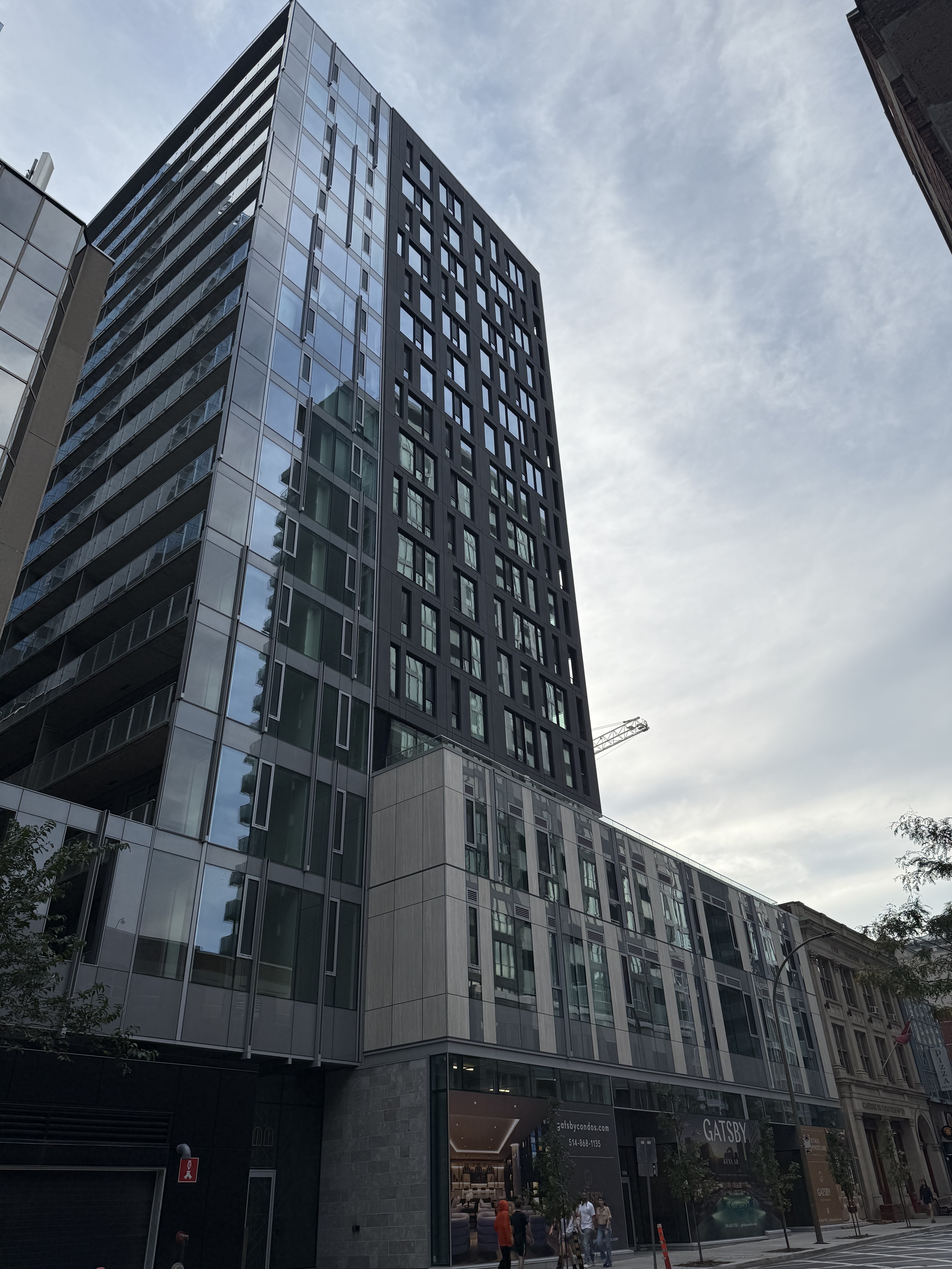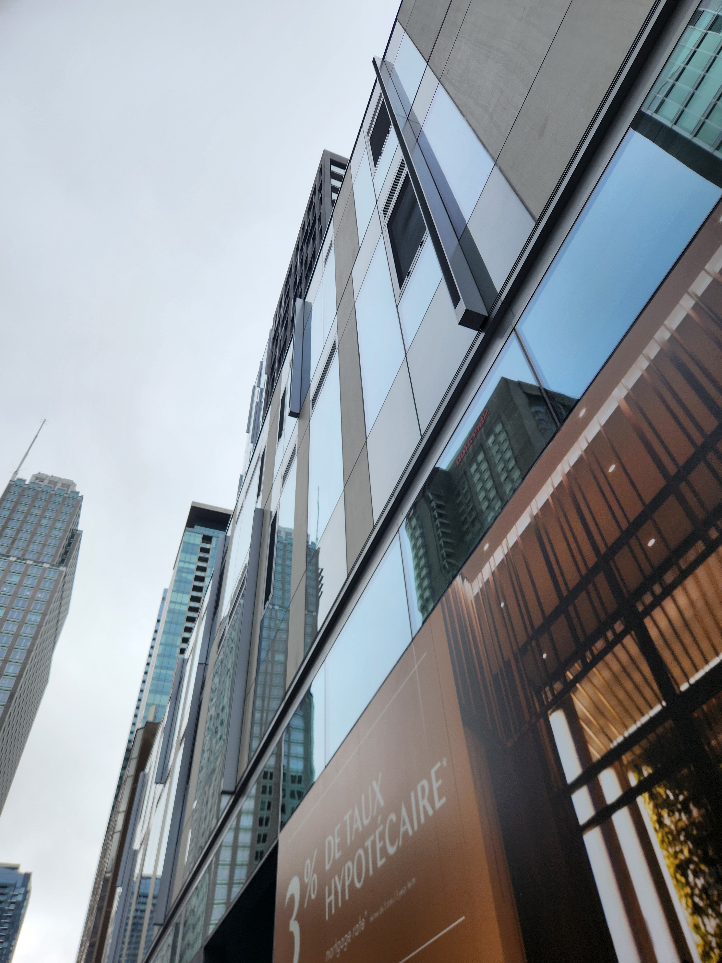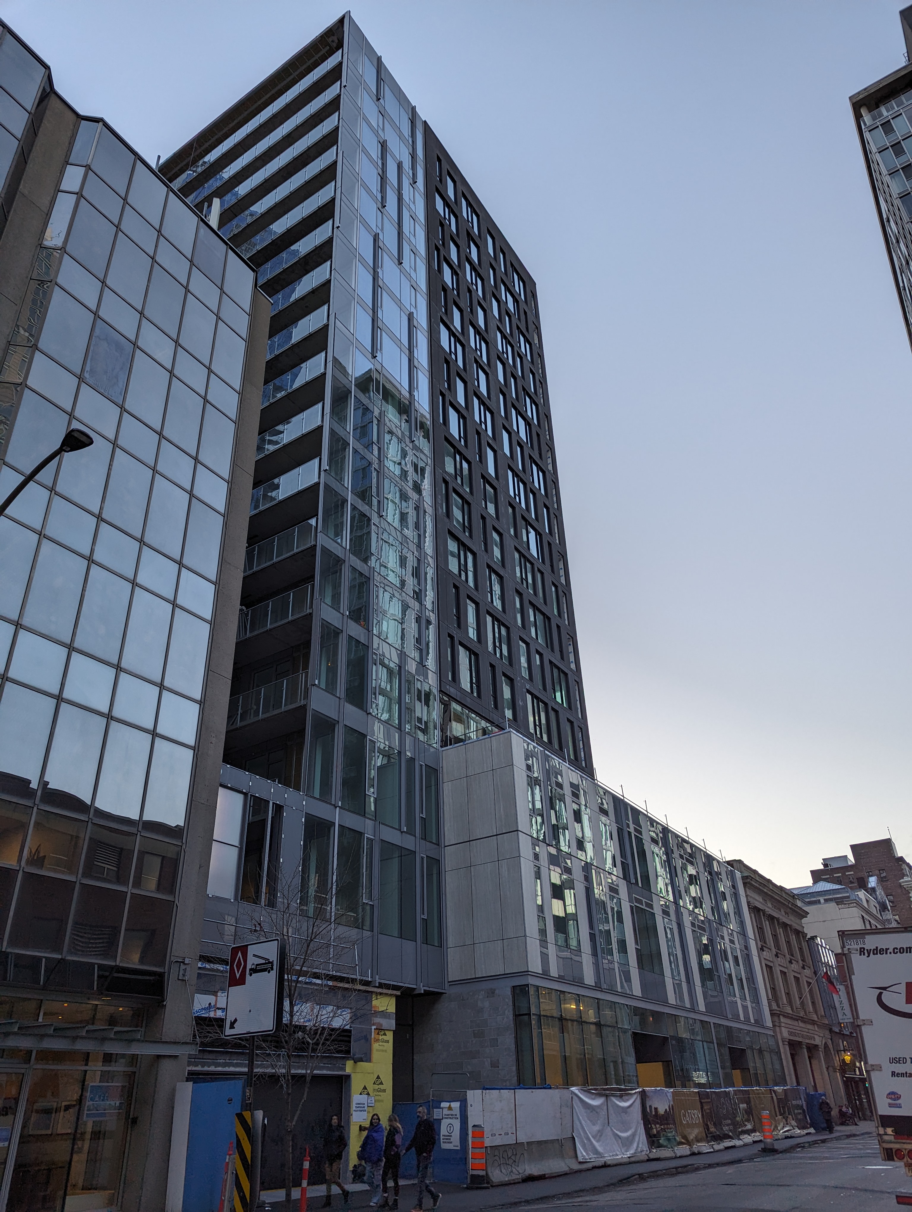 J’aimerais spécifier que beaucoup d’architectes montréalais ne savent vraiment pas comment gérer les fenêtres ouvrantes dans un mur rideau. Presque tous les projets qui intègrent des ouvrants dans un mur rideau de verre résultent en un patchwork horrible de cadres inélégants qui anéantissent toute tentative d’avoir un effet “slick” et uniforme. Évidemment, les rendus promotionnels ne le montreront jamais; ce sera toujours une hideuse surprise à la fin. D’ailleurs, c’est le symptôme d’une paresse maladive de certains professionnels de recourir systématiquement au mur rideau de verre plutôt que de vraiment s’occuper de la composition des façades avec une profondeur et de l’opacité réfléchie.