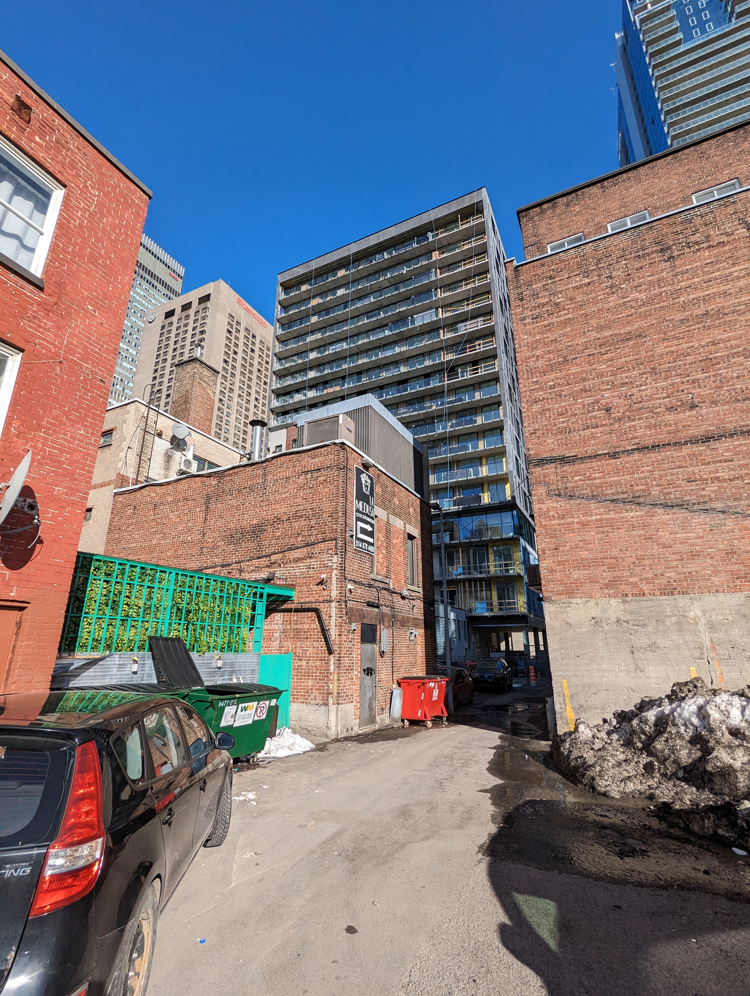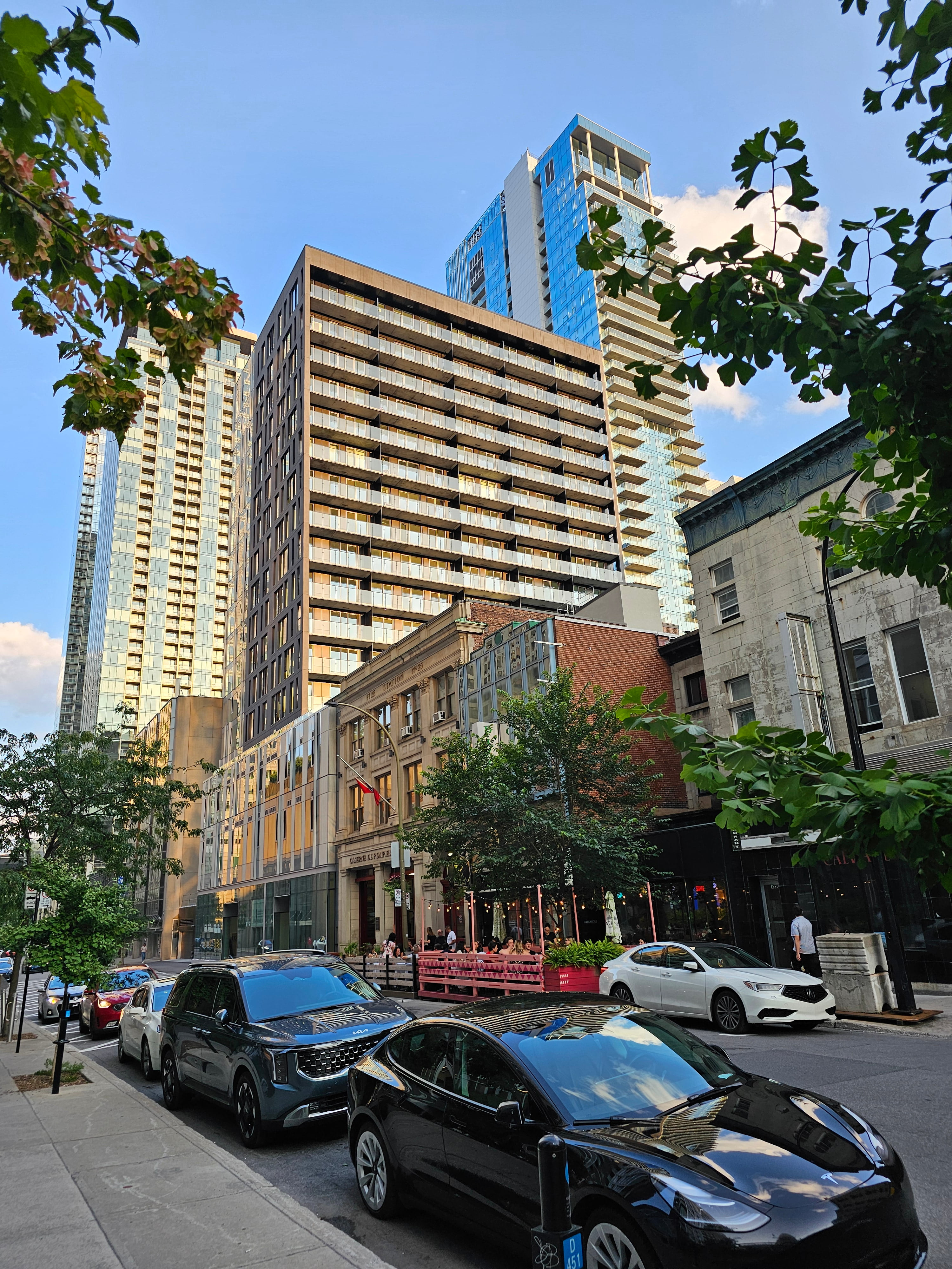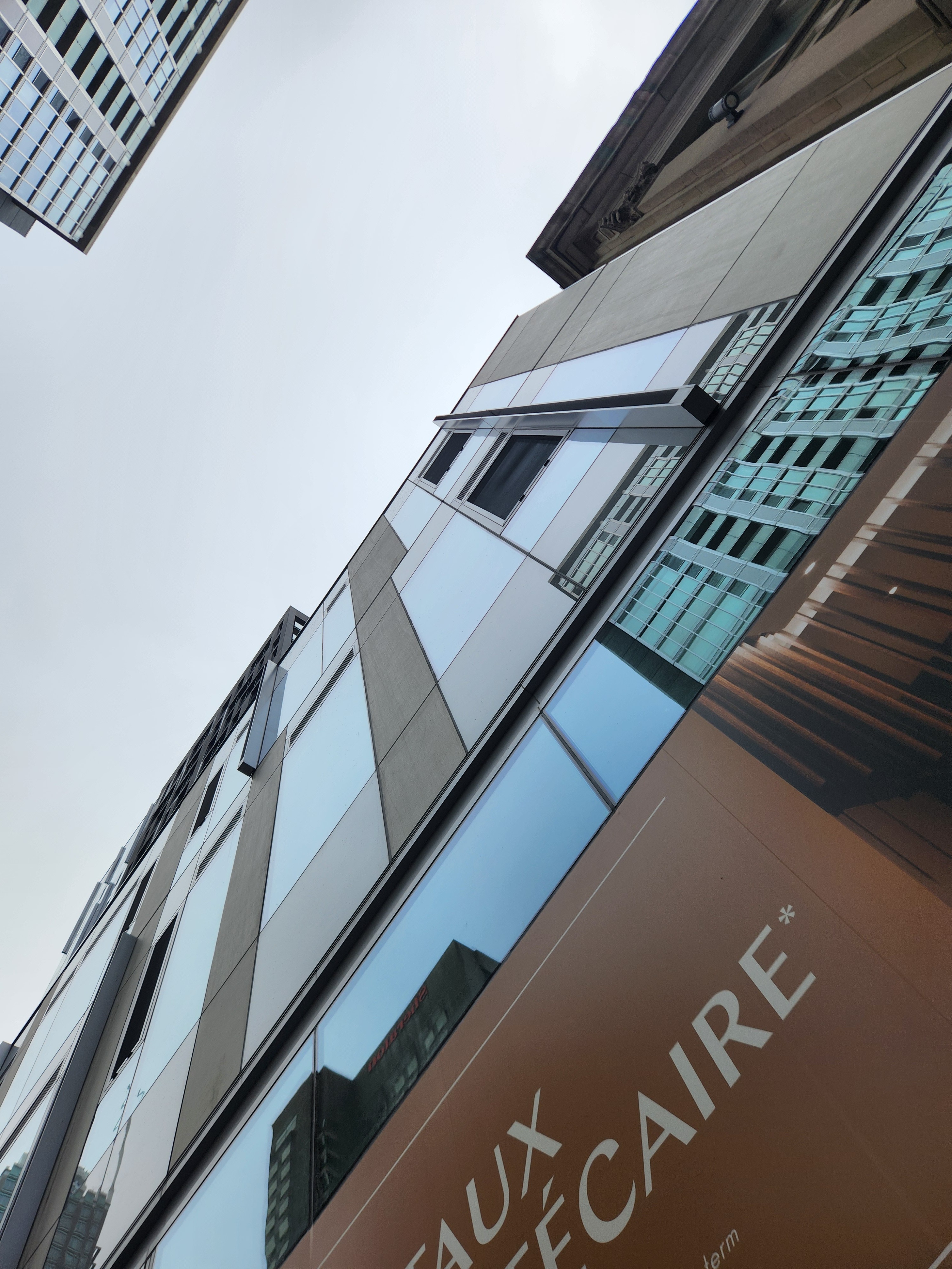 J’aimerais spécifier que beaucoup d’architectes montréalais ne savent vraiment pas comment gérer les fenêtres ouvrantes dans un mur rideau. Presque tous les projets qui intègrent des ouvrants dans un mur rideau de verre résultent en un patchwork horrible de cadres inélégants qui anéantissent toute tentative d’avoir un effet “slick” et uniforme. Évidemment, les rendus promotionnels ne le montreront jamais; ce sera toujours une hideuse surprise à la fin. D’ailleurs, c’est le symptôme d’une paresse maladive de certains professionnels de recourir systématiquement au mur rideau de verre plutôt que de vraiment s’occuper de la composition des façades avec une profondeur et de l’opacité réfléchie.