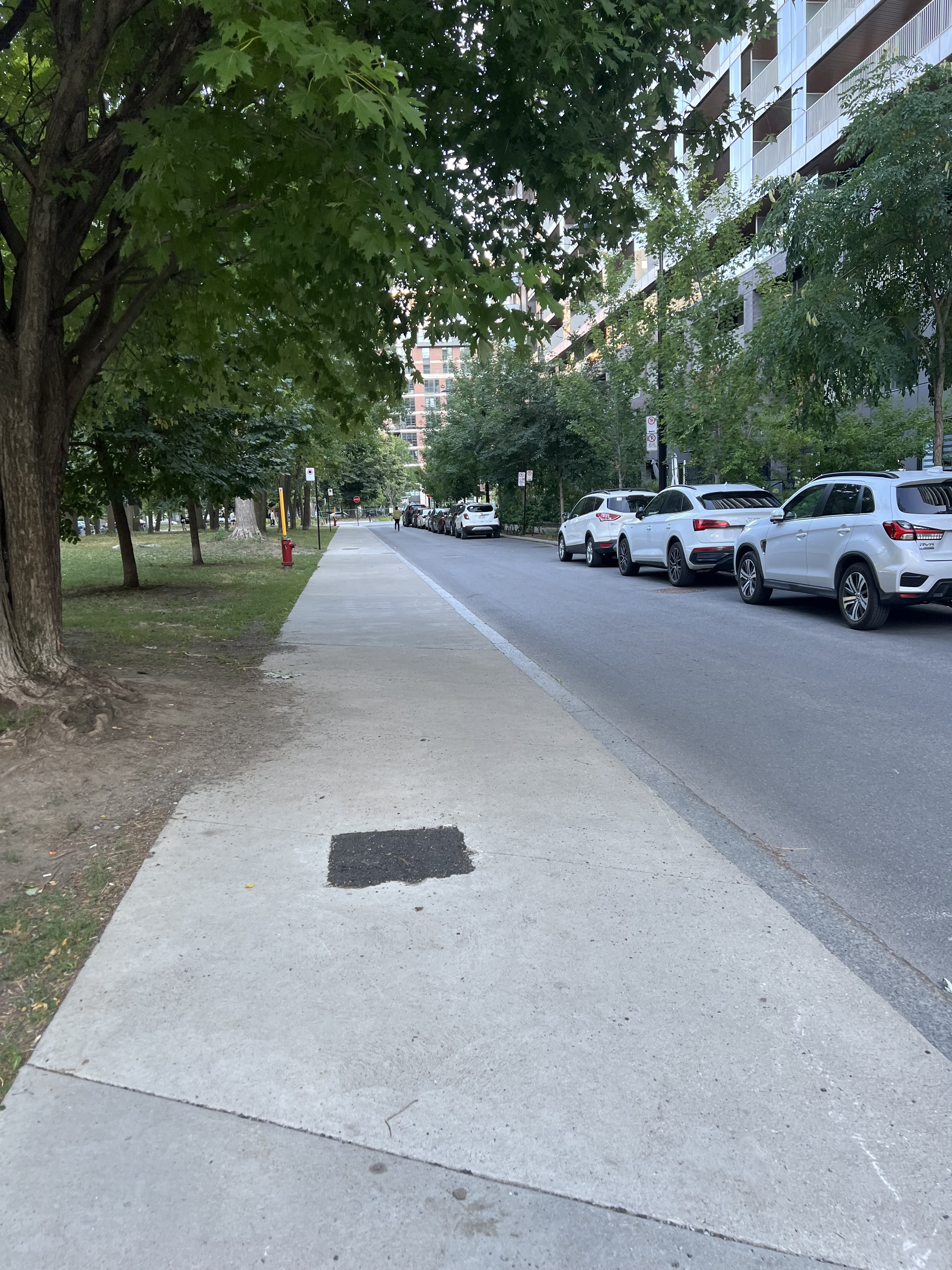 Sur les nouvelles rues depuis l’aménamgent de la rue Ottawa, ce sont des segments d’asphalte qui font la largeur du trottoir qui ont été coulés autour des poteaux de HQ