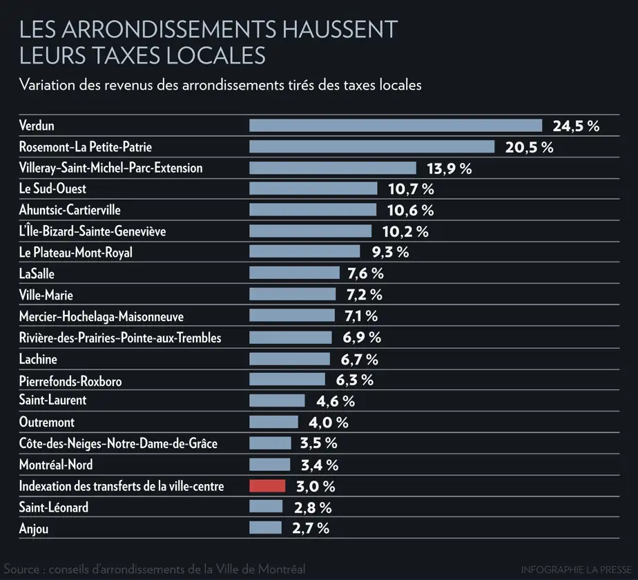 Les augmentations décrétées par chaque arrondissement, qui ont adopté leurs budgets ces derniers jours, ne touchent donc que cette partie de la facture. Les hausses varient entre 2,7 % et 24,5 %.