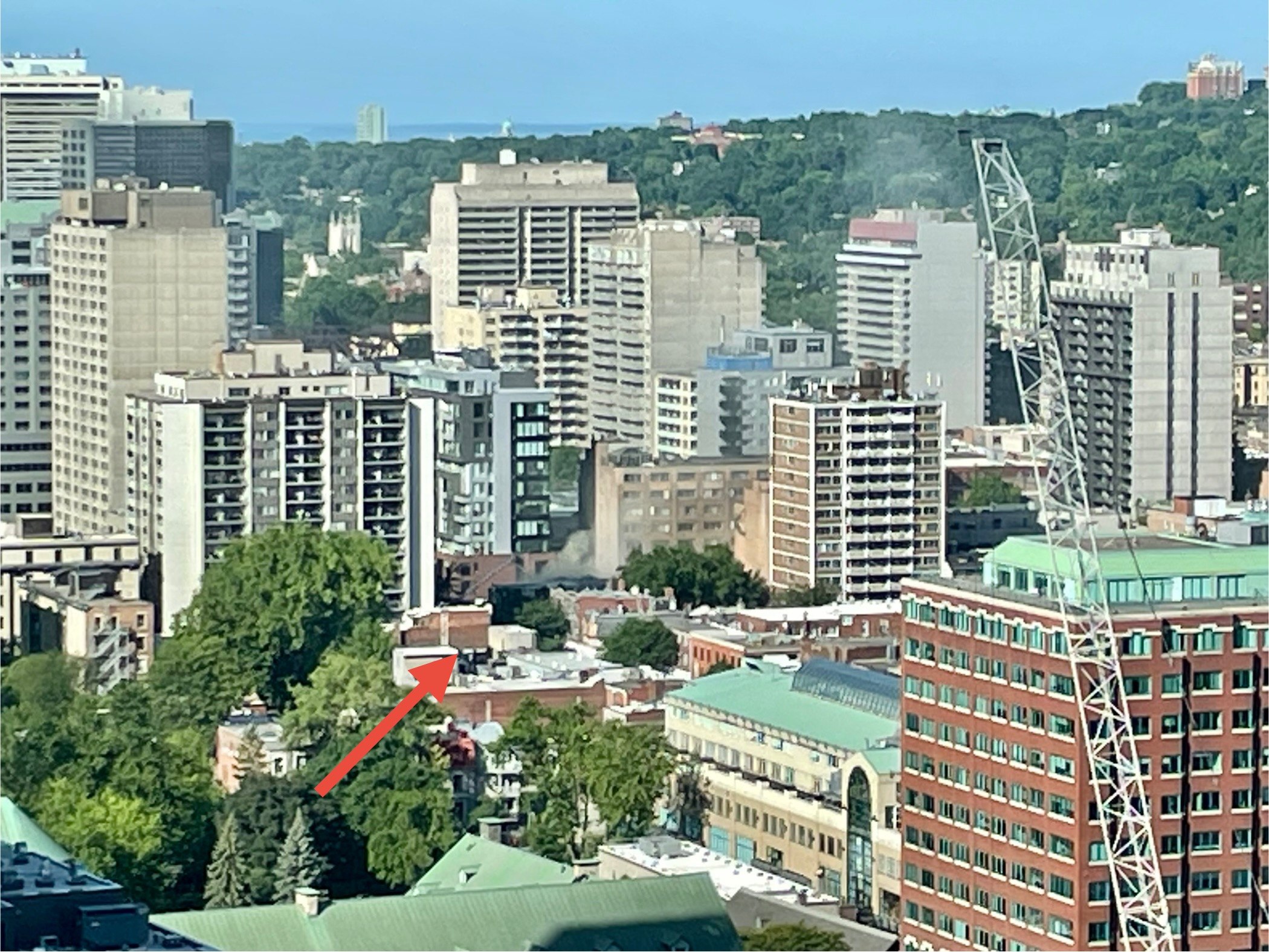 Selon la photo de Radio-Canada, c’est le bâtiment au coin Nord-Est de Saint-Catherine/Towers