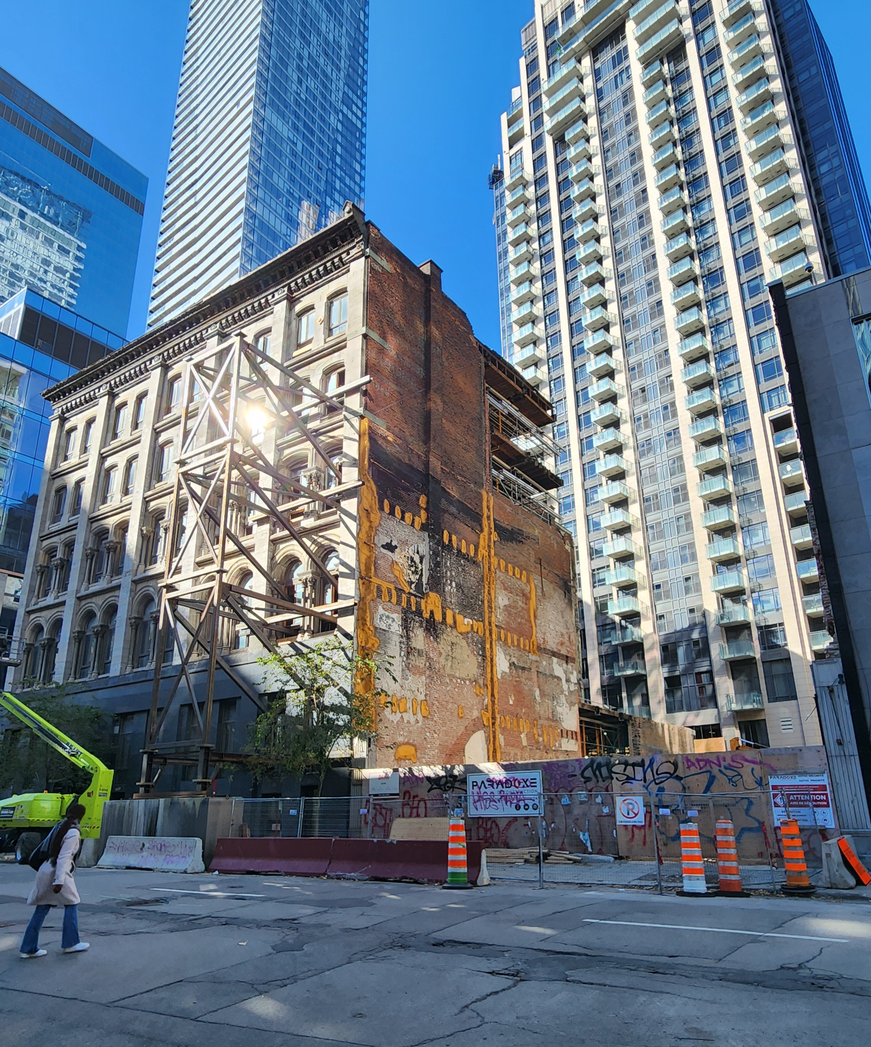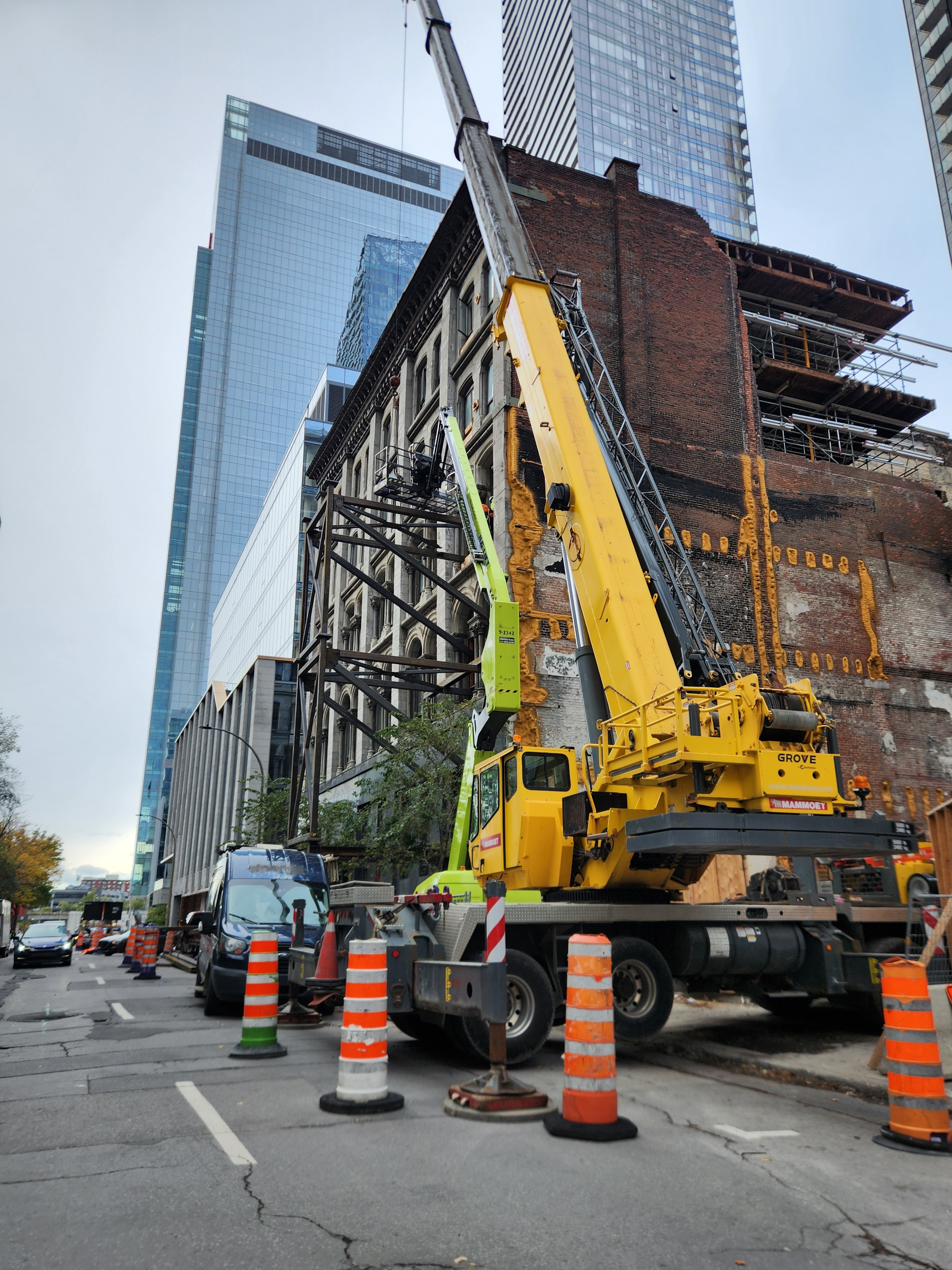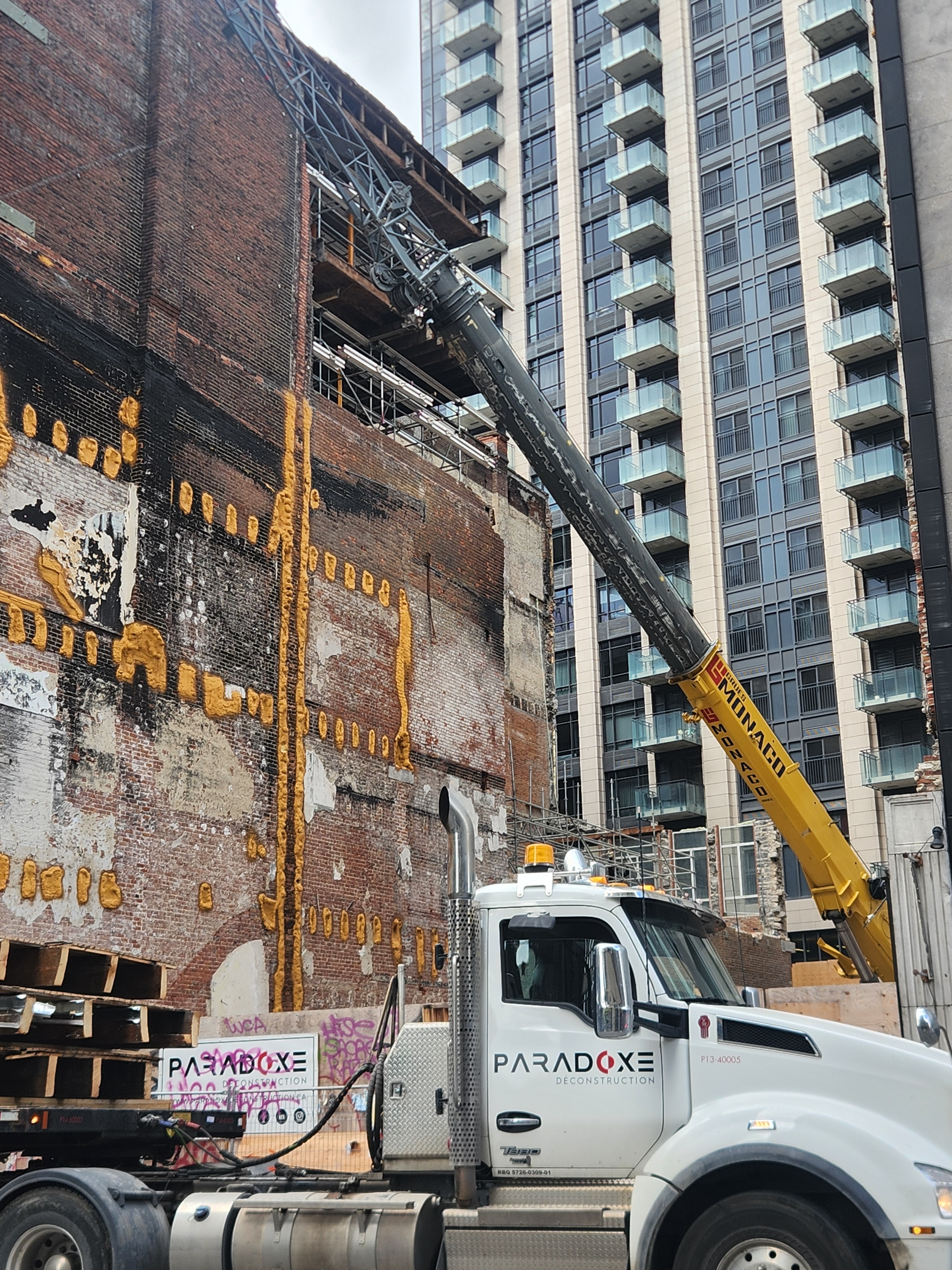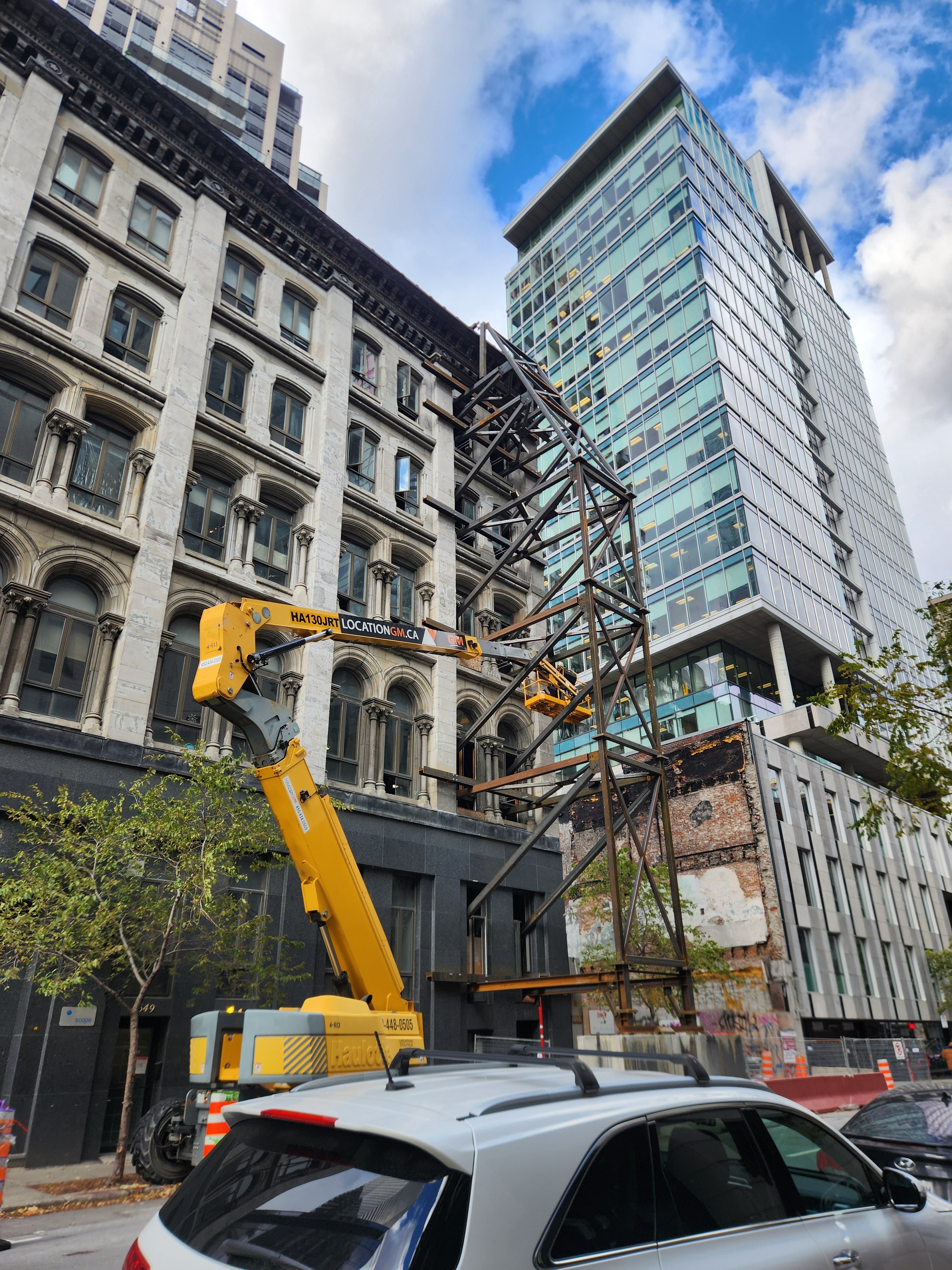 Ça me semble une structure pour soutenir le mur de pierres grises, ce qui implique possiblement le démontage complet de l’immeuble. Avec l’espace incendié à côté, ça pourrait être le site d’un futur grand édifice en hauteur, en combinant les lots.