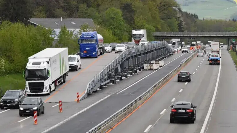 Sur l’autoroute A1 en Suisse, près de Berne, une technologie inédite de déviation des voies lors de travaux a été testée au cours des dernières années : le pont mobile.