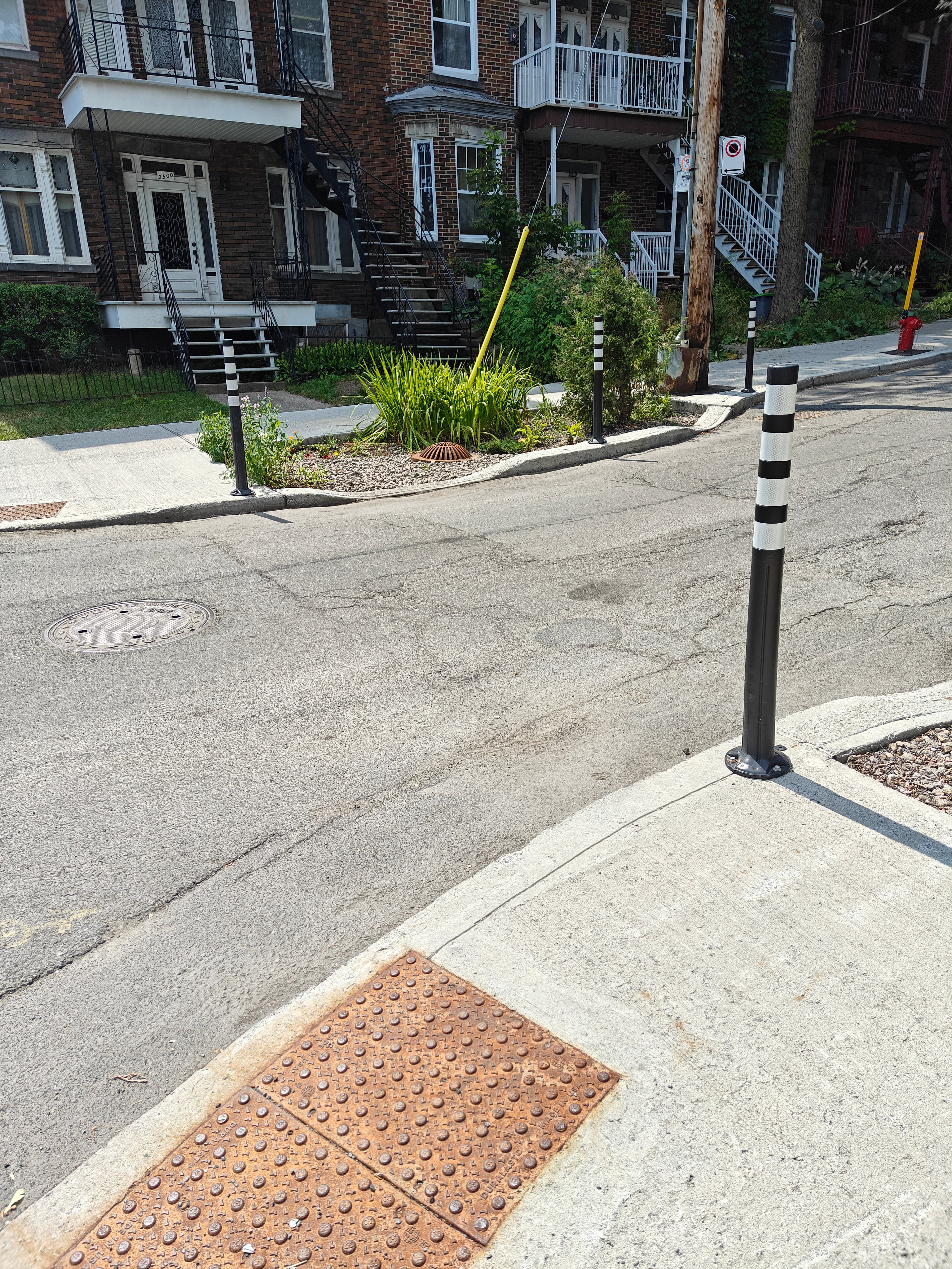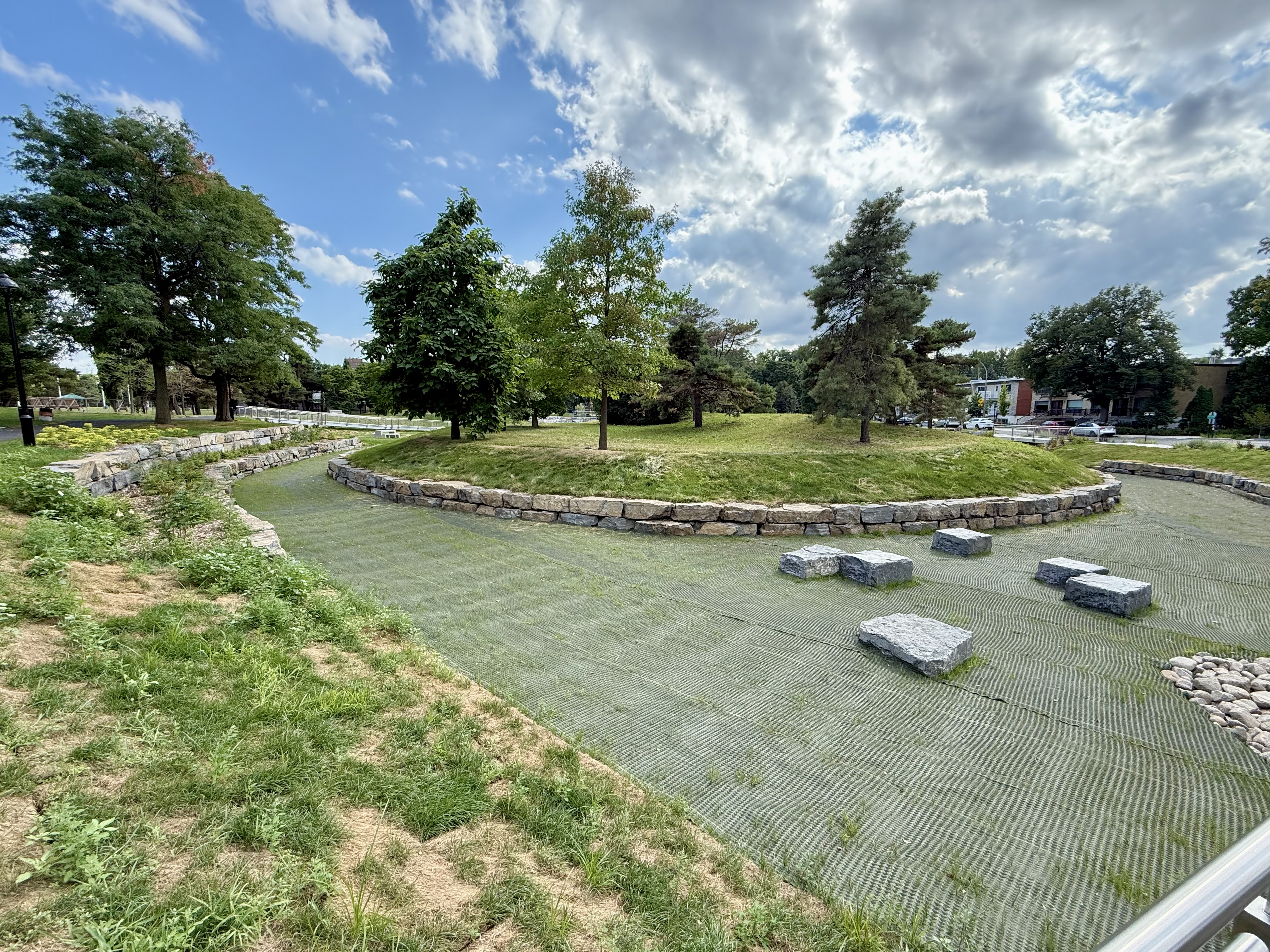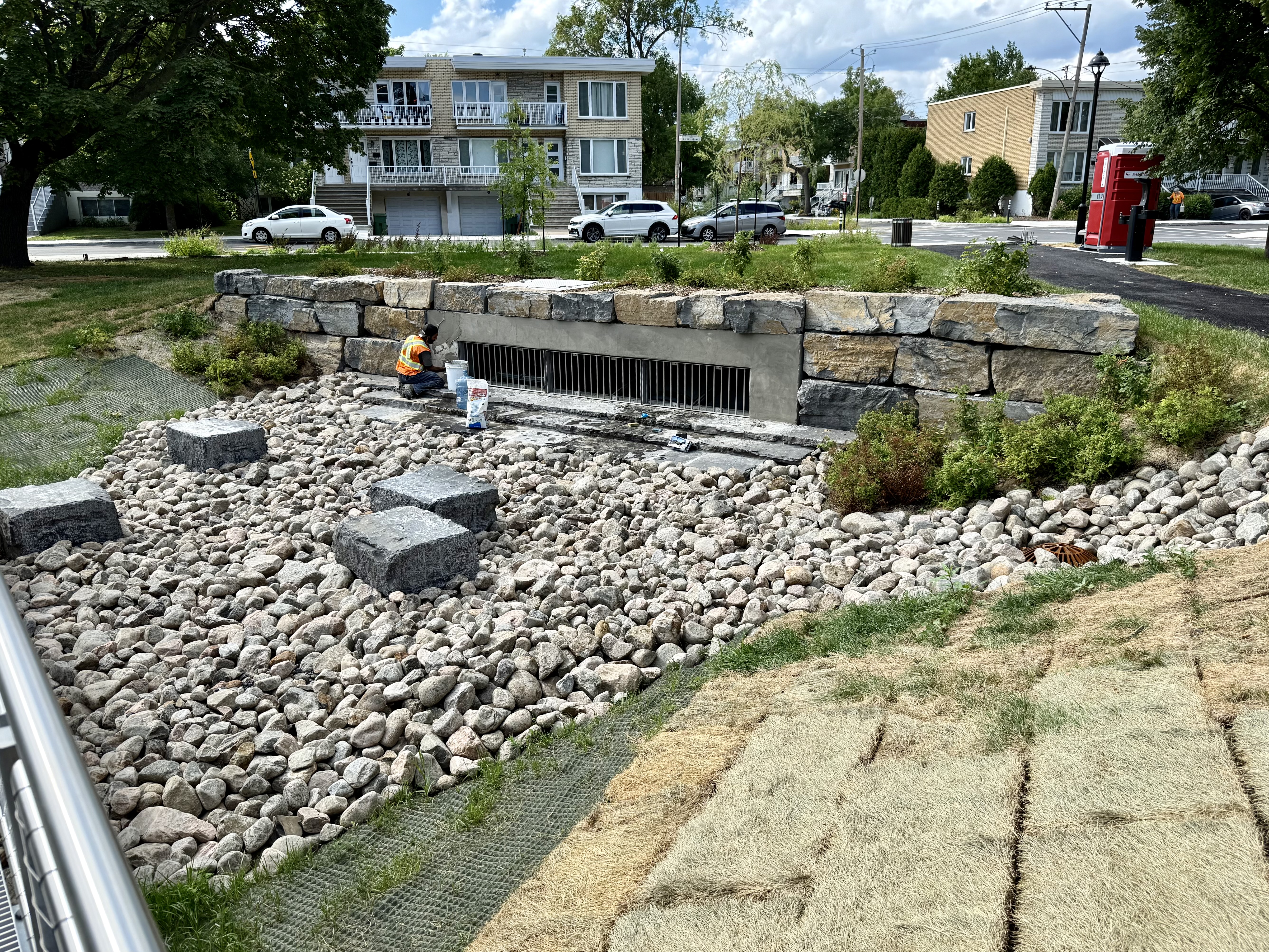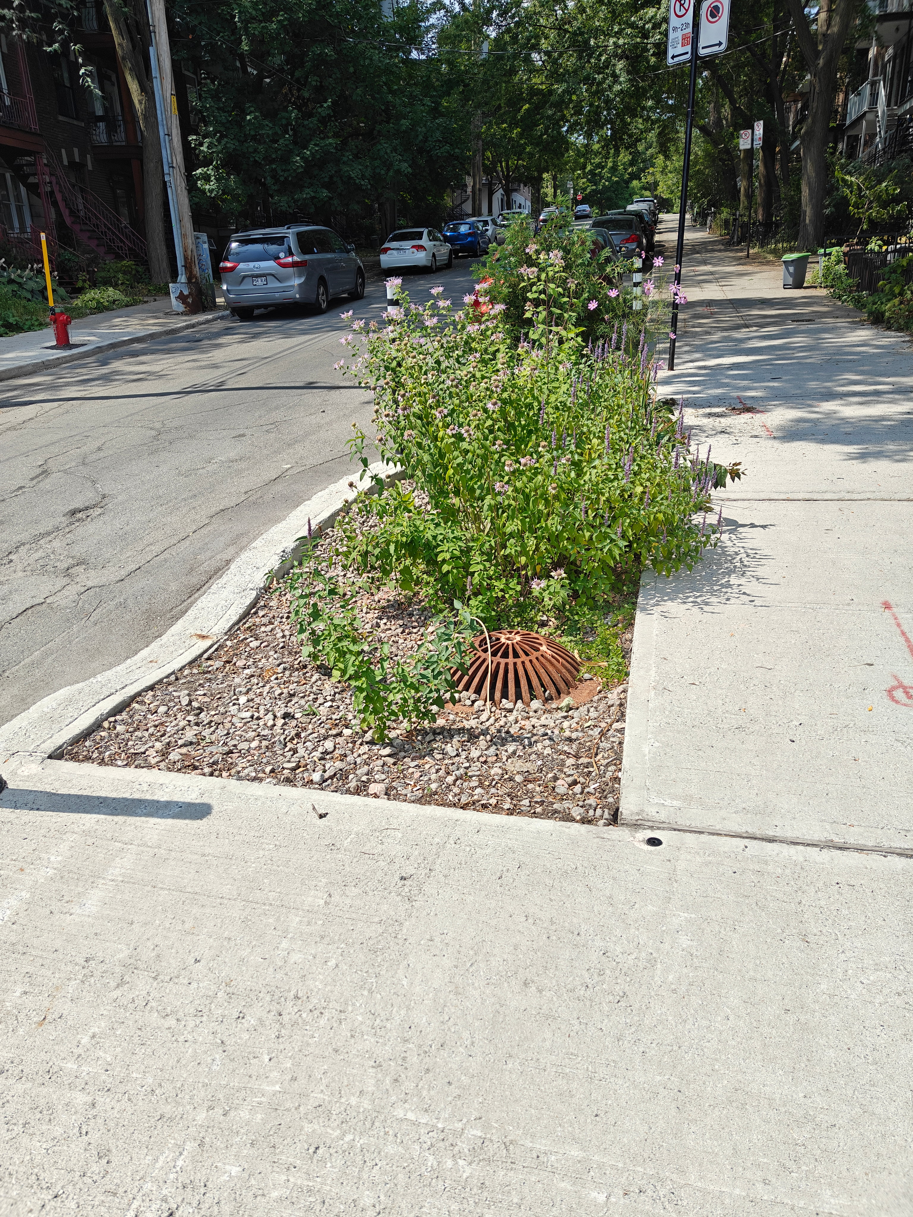 Je suis à environ dix minutes de vélo, donc pas super pratique quand il pleut fort. Je suis quand même allé après l’orage, et j’ai vu de l’eau descendre le long du trottoir sur la rue Pierre-Bédard. C’était peut-être quelqu’un qui arrosait avec un boyau, mais c’était quand même intéressant… L’eau coulait dans les fossés de drainage, mais continuait son chemin jusqu’au dernier, qui absorbait tout comme une éponge. Ce n’était pas une grosse tempête, mais ça a marché.