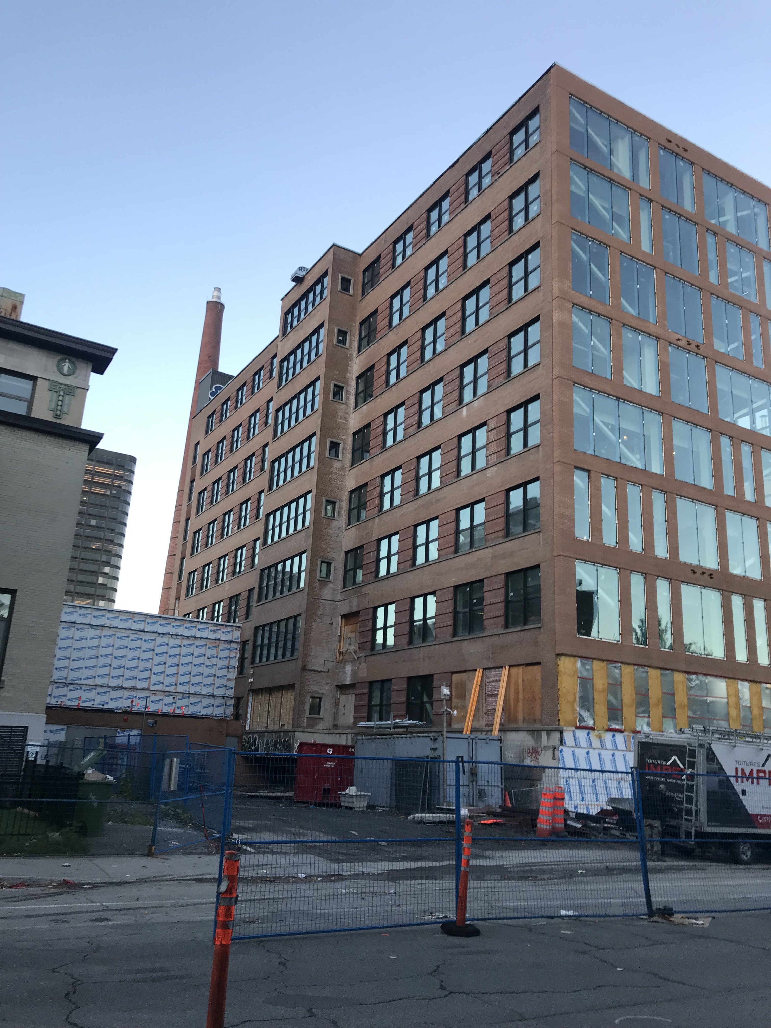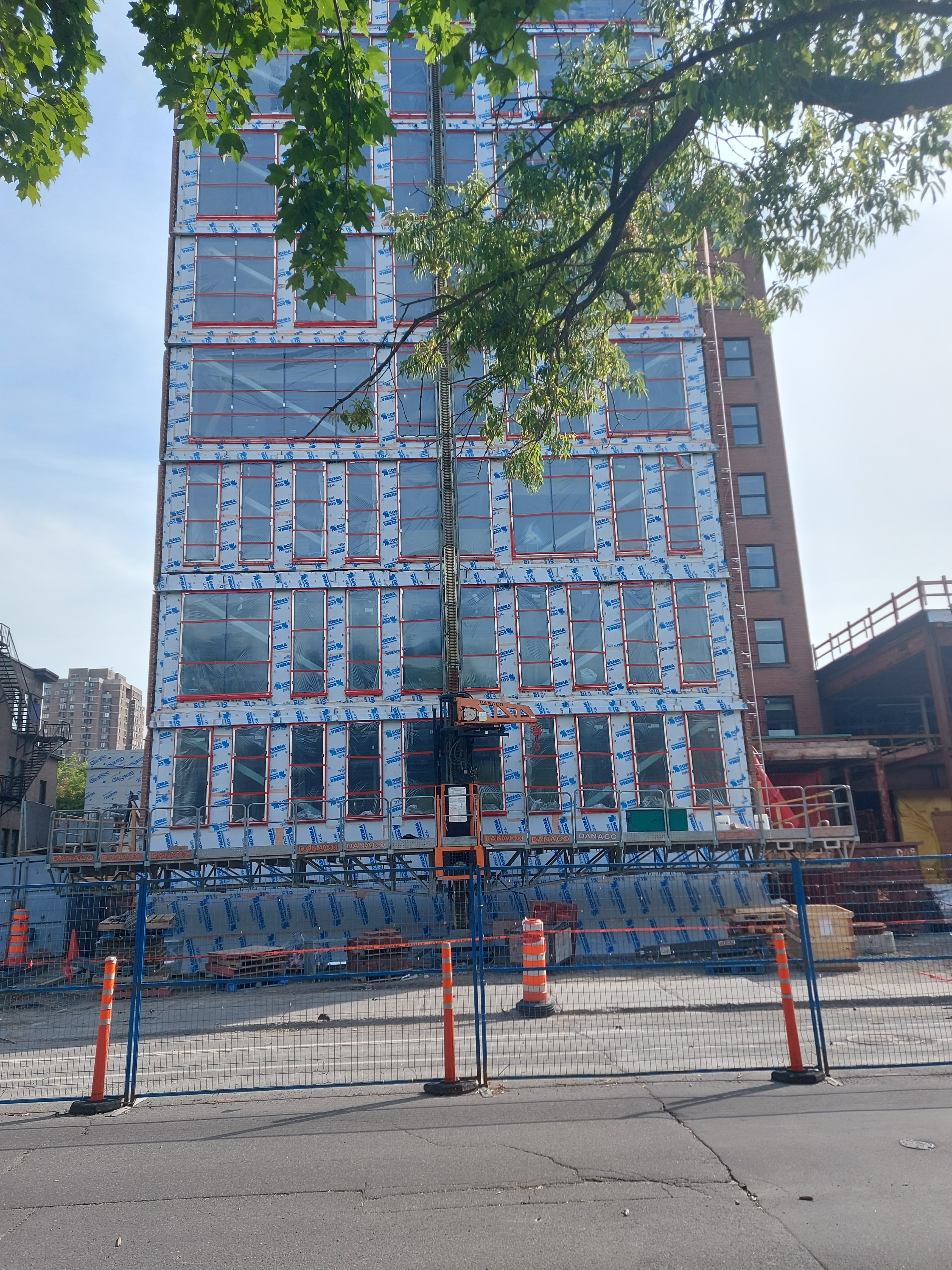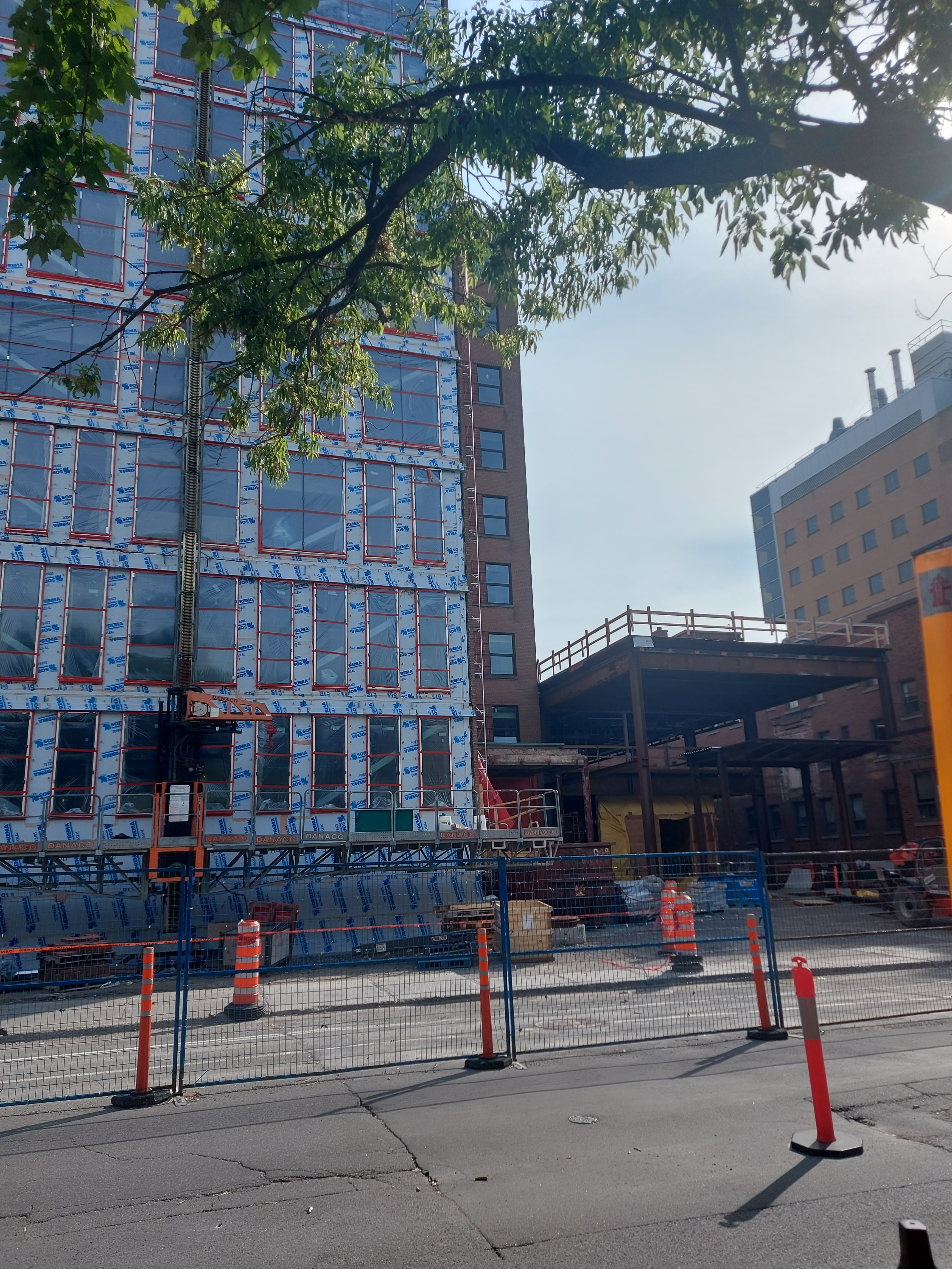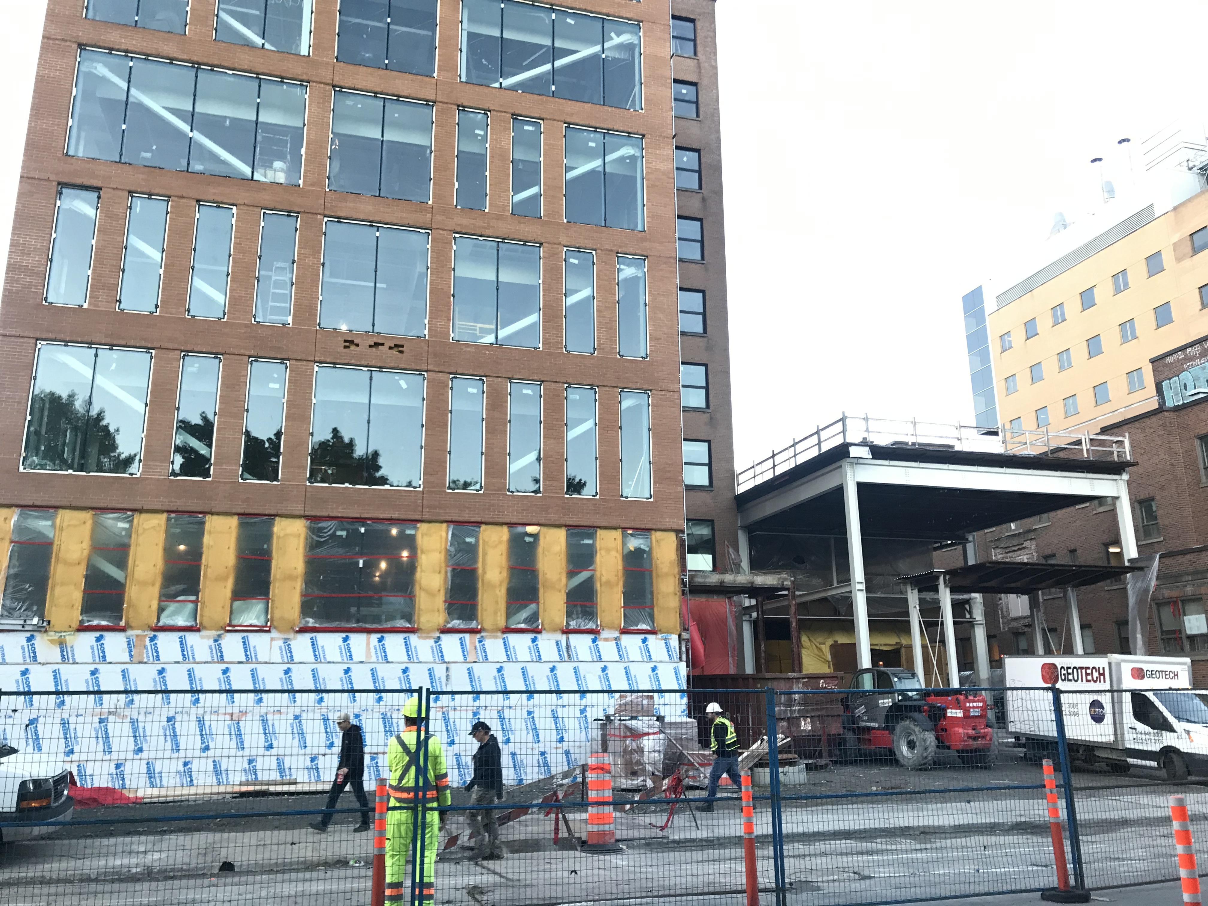 Les fenêtres sont couvertes peu à peu, j’imagine qu’ils vont mettre de l’isolant sur la façade bientôt. On peut voir du progrès sur le mur à gauche aussi, un nouveau volume à l’édifice.