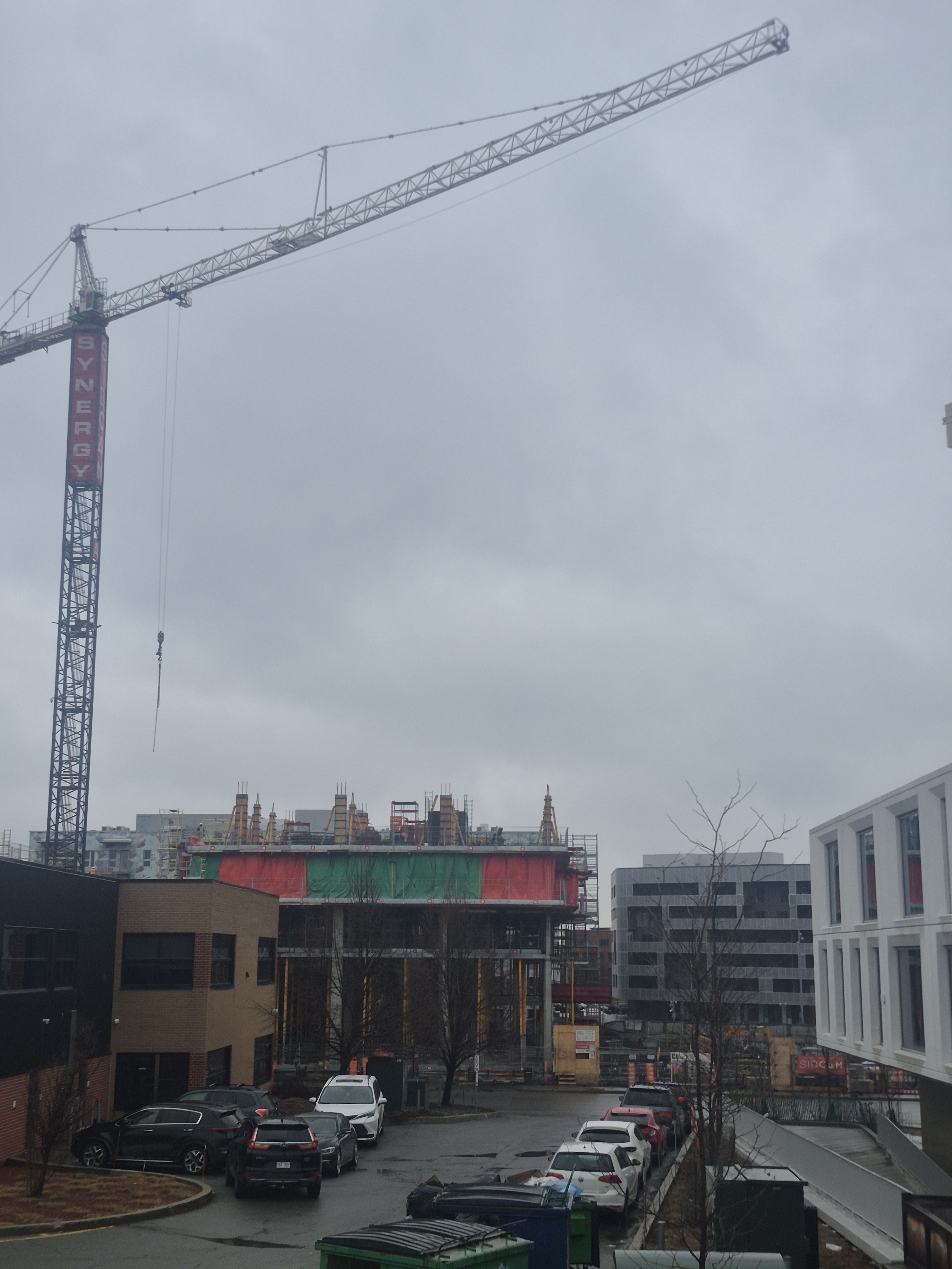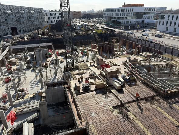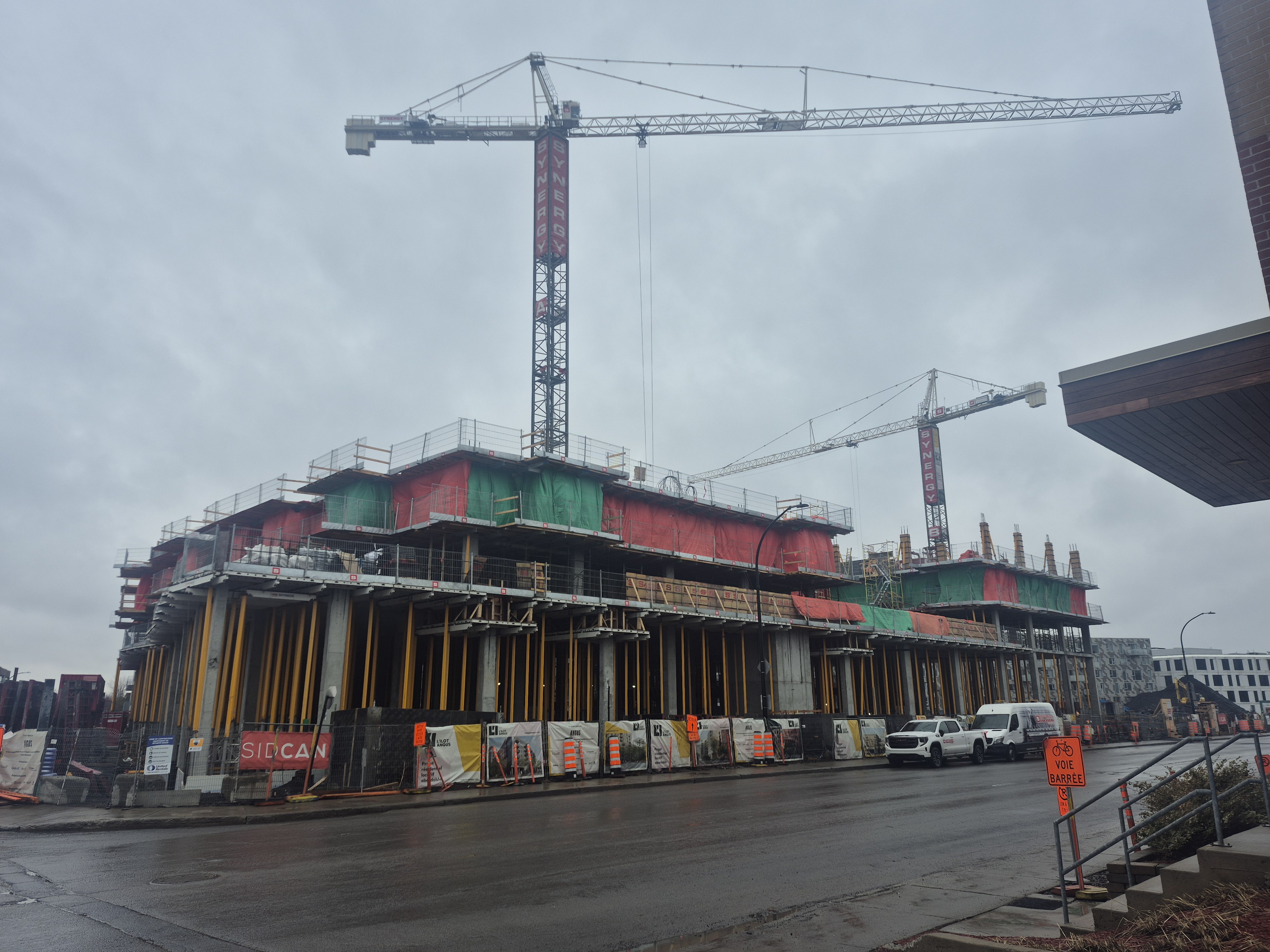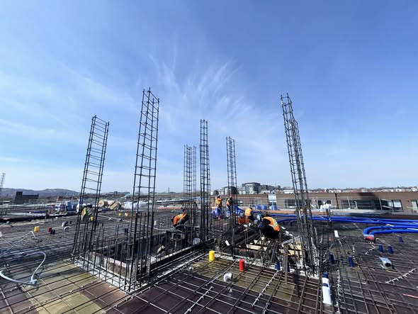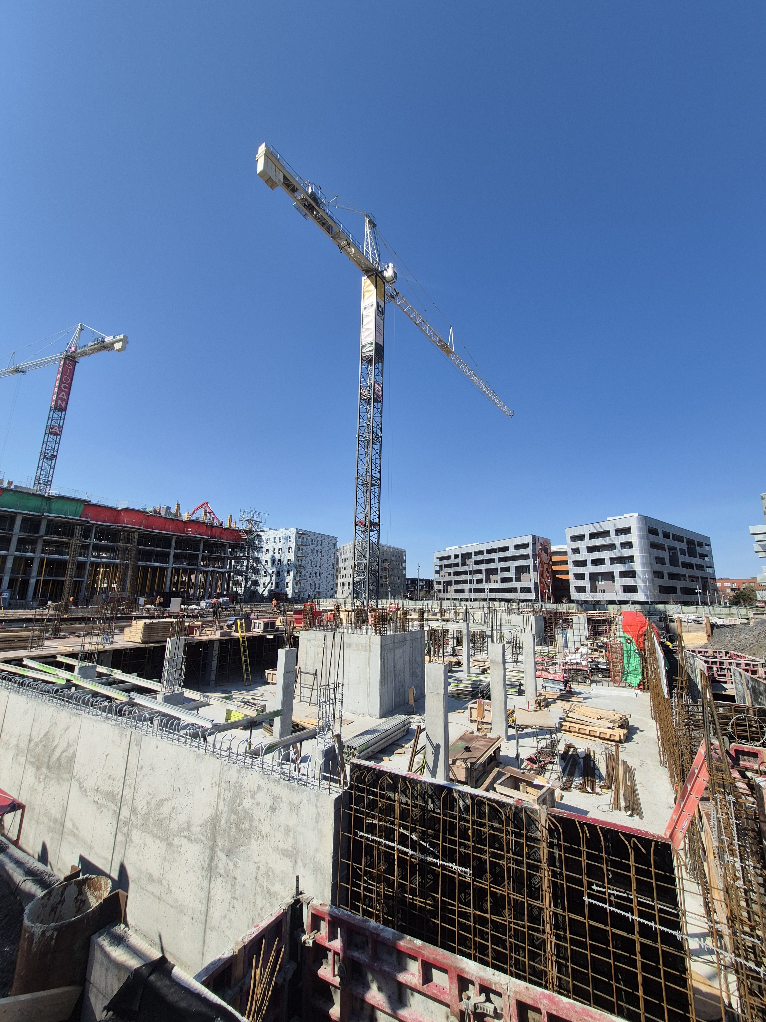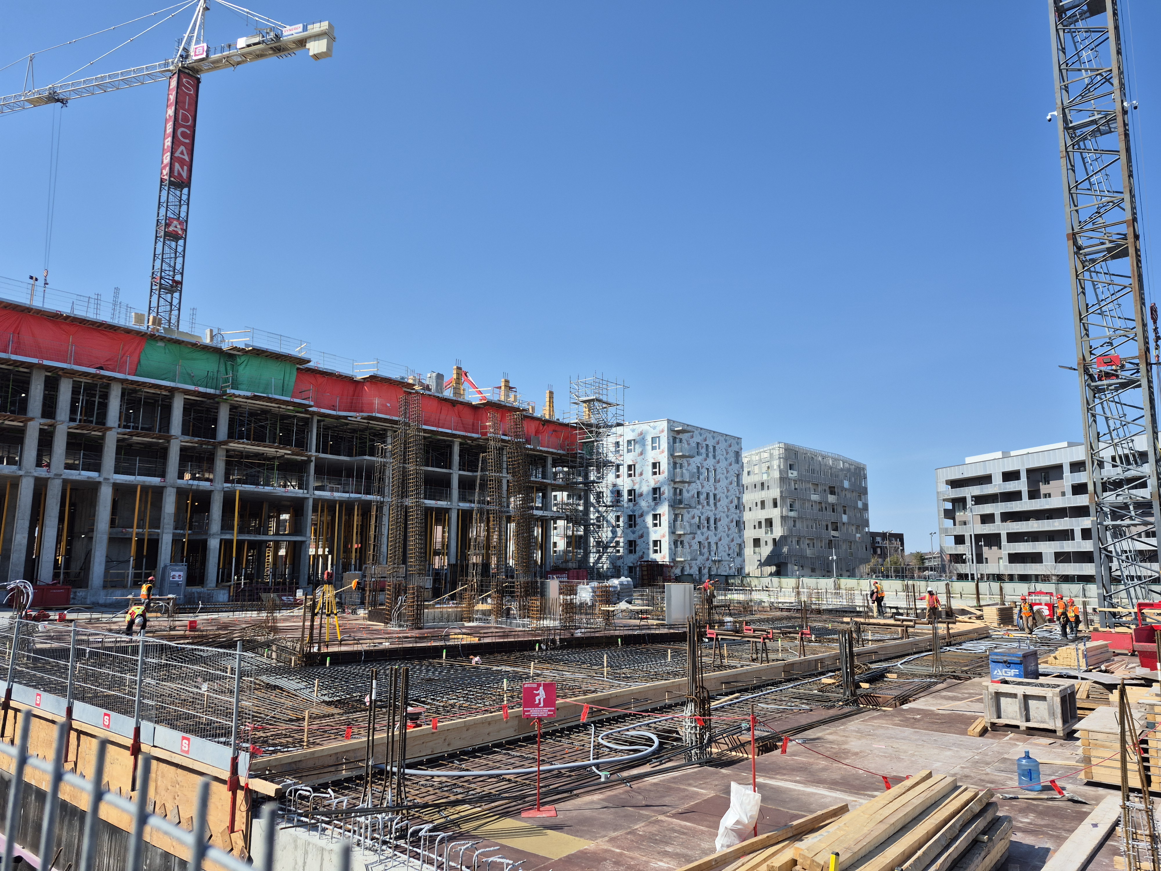 Les équipes sur le chantier poursuivent le coulage des dalles de béton de la structure du complexe résidentiel. Du côté du bâtiment nord, les travailleurs s’activent au plancher du 5e étage, sur un total de 8 étages prévus. Pour le bâtiment sud, la dalle du sous-sol est finalisée et les travaux du rez-de-chaussée sont maintenant amorcés. Ces opérations devraient s’échelonner sur deux mois, après quoi le coulage des étages supérieurs pourra débuter.