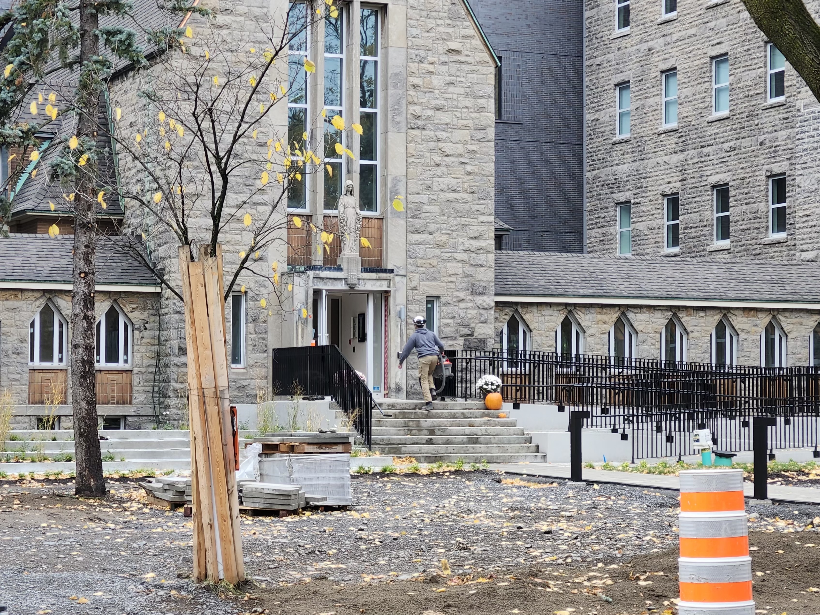 L’aménagement autour du terrain continue. Ça achève. Je ne suis pas un fan de la porte de la chapelle. Le rendu montrait une porte du style “église” en bois, pas une porte simple en verre.