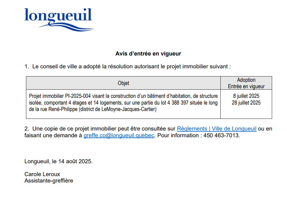 Le conseil municipal de Longueuil a autorisé un projet de résolution concernant la réalisation du projet immobilier La Clé pour moi, un immeuble résidentiel de quatre étages qui accueillera 14 logements destinés à une clientèle adulte autiste. L’édifice sera érigé sur une portion du terrain de l’ancienne église Saint-Maxime, dans le secteur LeMoyne, avec façade sur la rue René-Philippe.