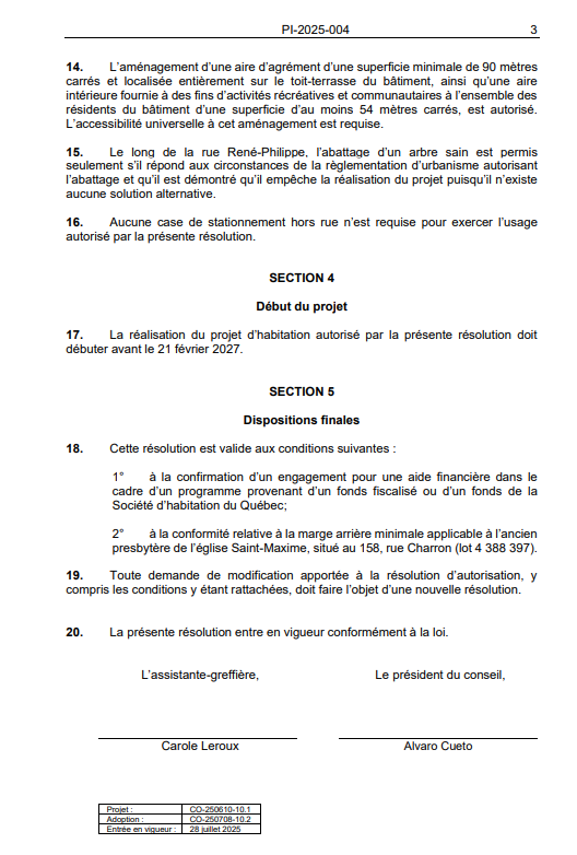 Dans un contexte de pénurie marquée de logements, la Ville considère ce projet comme une priorité. Le terrain sera officiellement subdivisé afin de créer un lot distinct, ce qui permettra l’implantation de l’immeuble à usage strictement résidentiel, adapté aux besoins de sa clientèle.