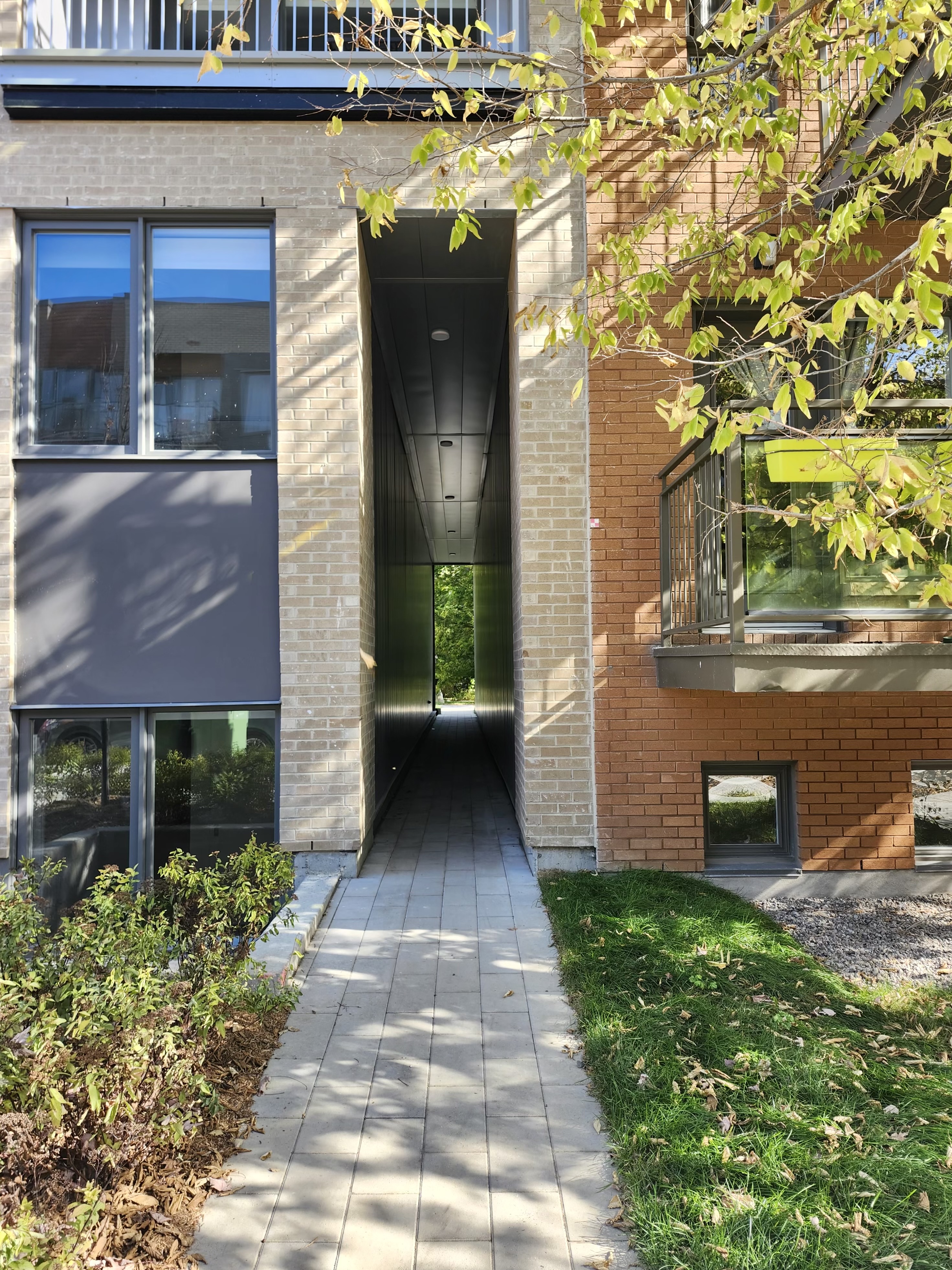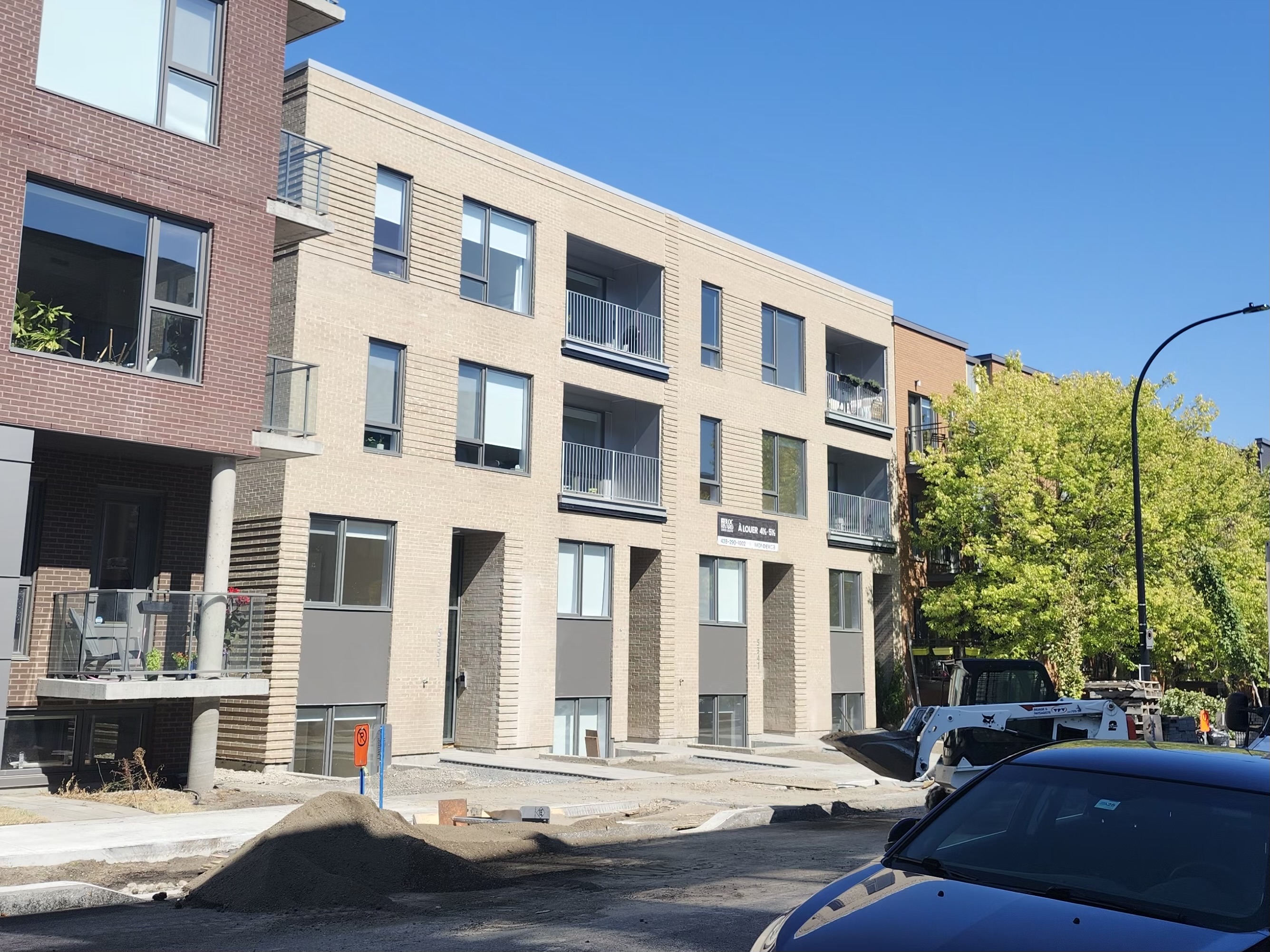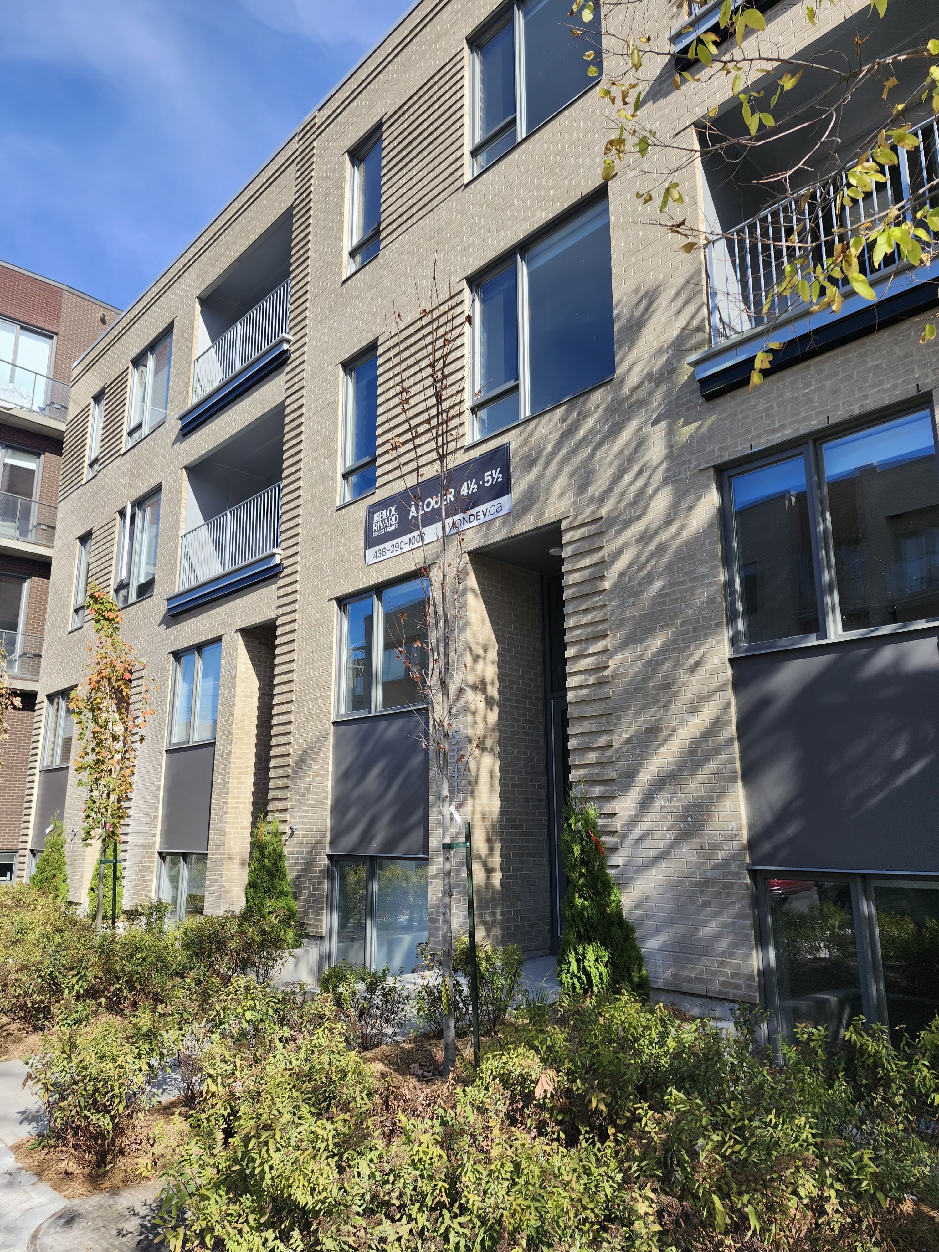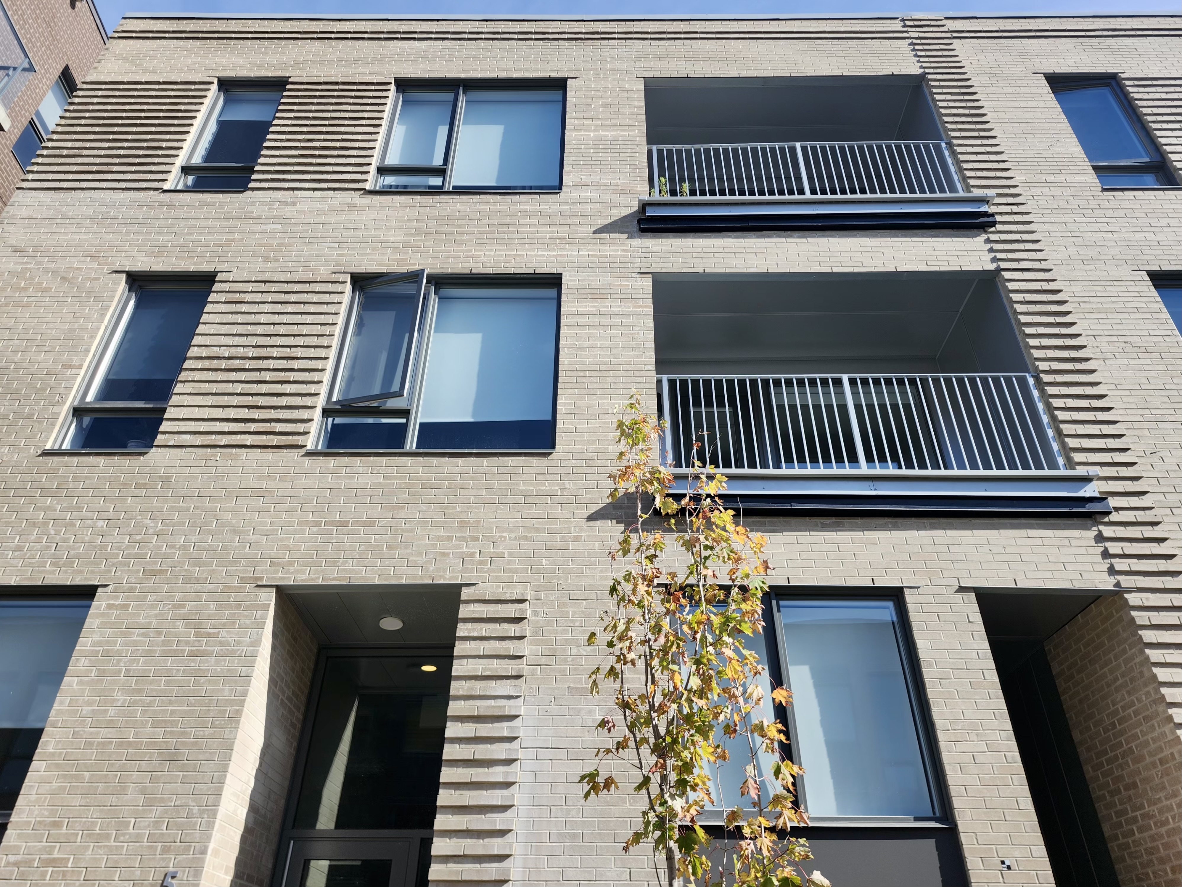 Une photo mieux dégagée de la façade. Il y avait un peu d’aménagement paysager en réalisation ce matin, les arbres sont livrés.