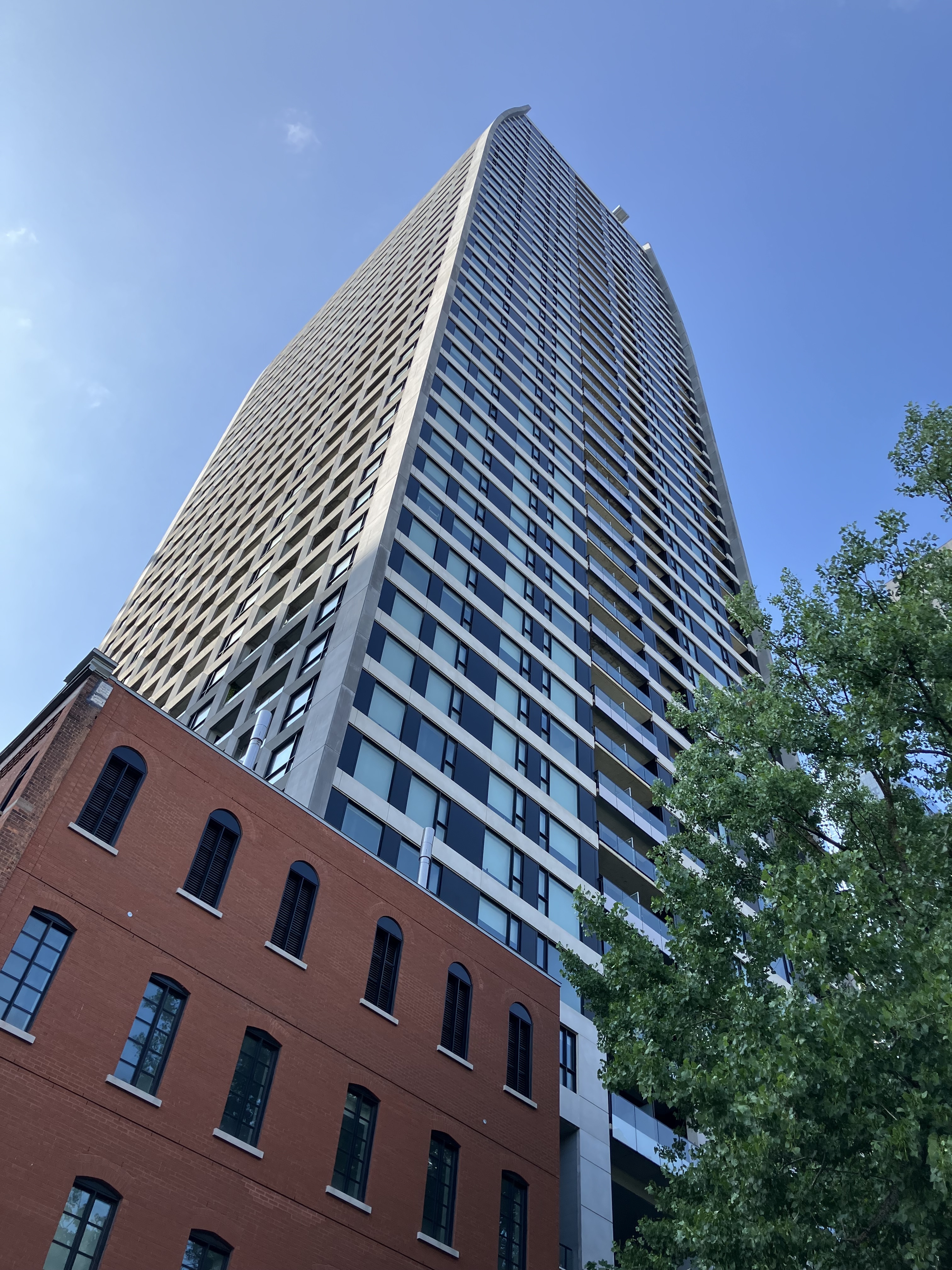 La tour atteint 25 étages (54 m) (note que je rajoute: la version précédente avait 3 étages). Elle s’inscrit en retrait de 2 m par rapport à un basilaire d’une hauteur de 11 à 16 m. En plus de comporter un commerce et l’entrée résidentielle, le basilaire comprend à l’extrémité sud une porte cochère d’une hauteur de 4,5 m et une largeur de 5,7 m. Celle-ci donne accès à l’entrée du stationnement située dans la phase 1, à la dalle de propreté située entre les deux phases et au quai de chargement de la phase 2. La tour a un linéaire de façade de 14,7 m et une superficie de plancher d’environ 500 m². La tour se situe à une distance de 18,9 m de la tour de la phase 1 et à 19 m de la tour du Solstice, propriété située au nord sur la rue de la Montagne.