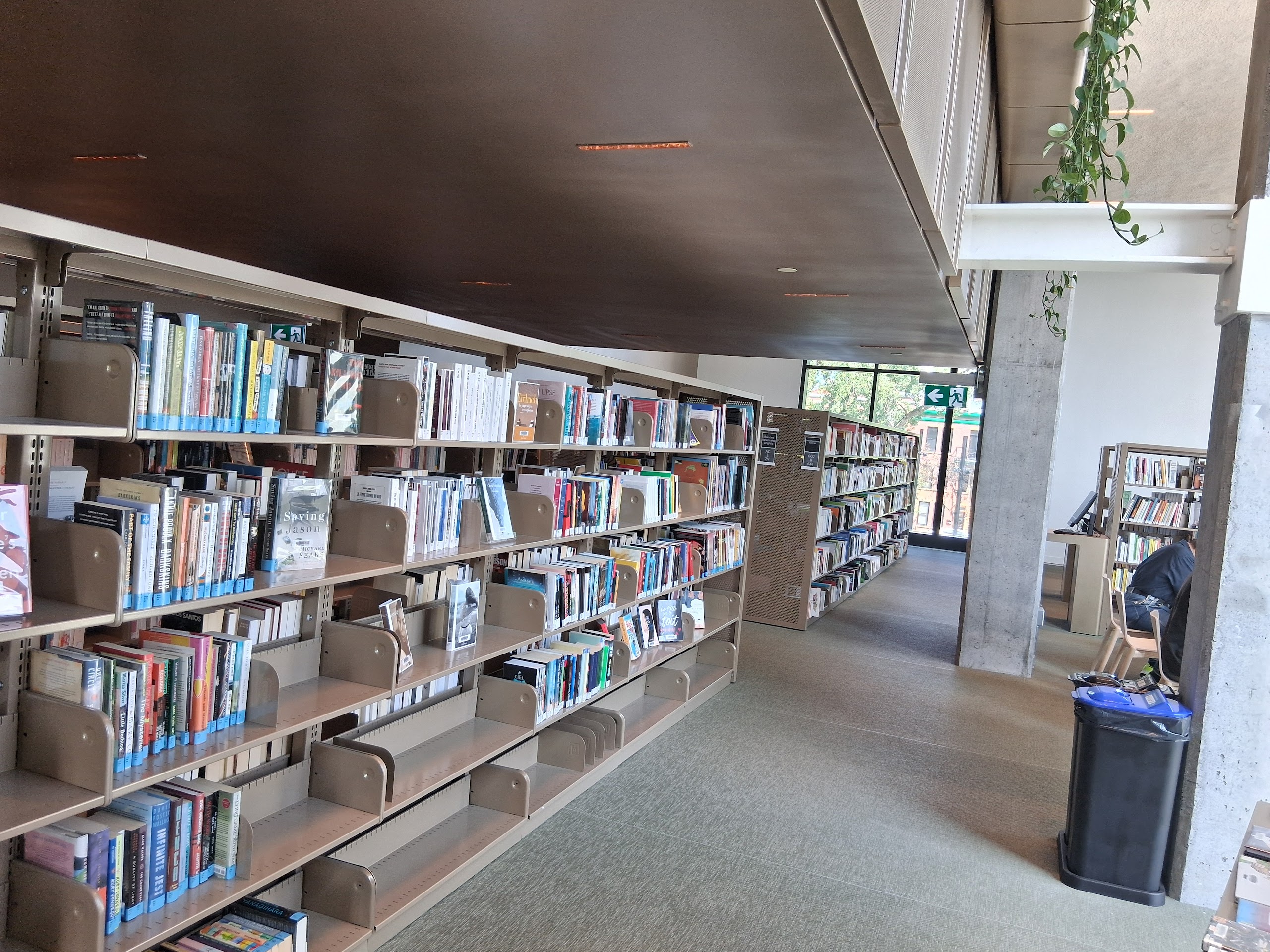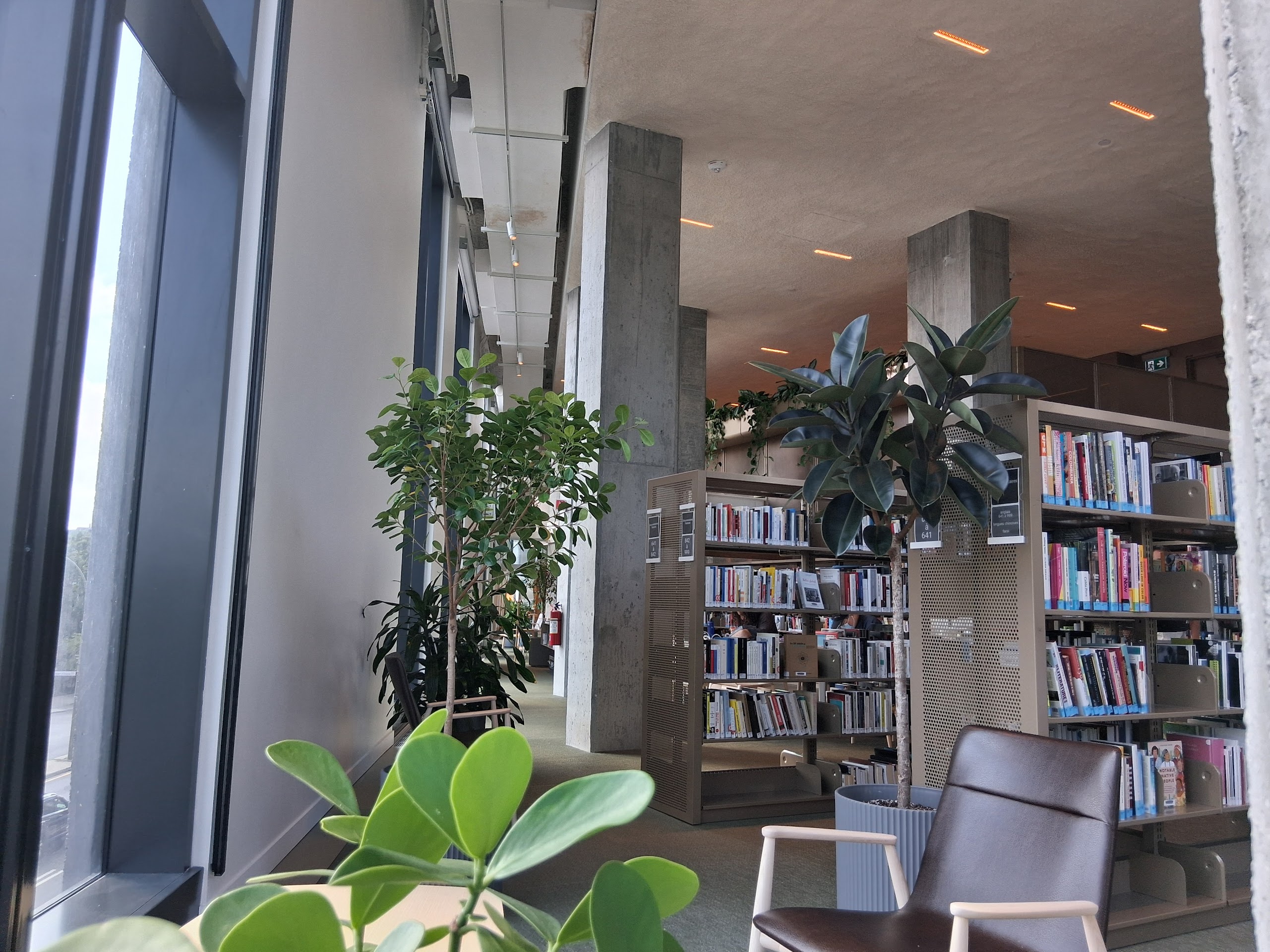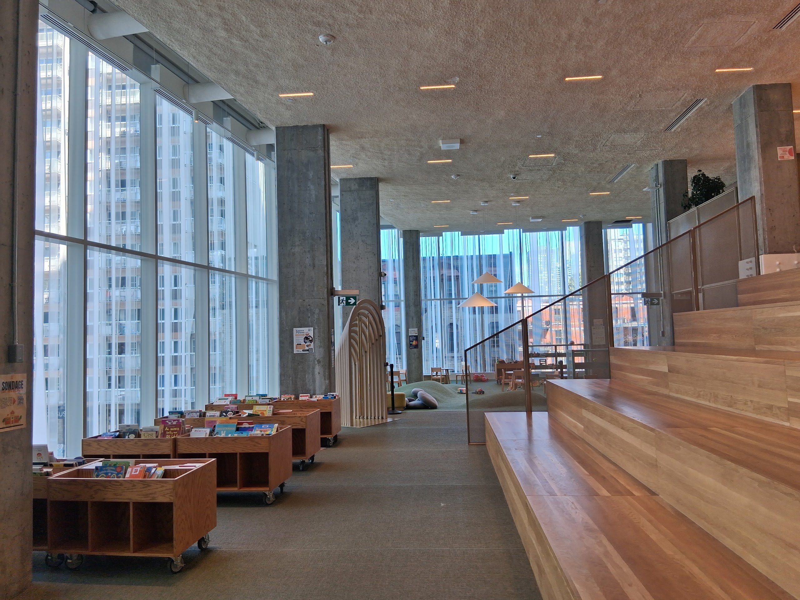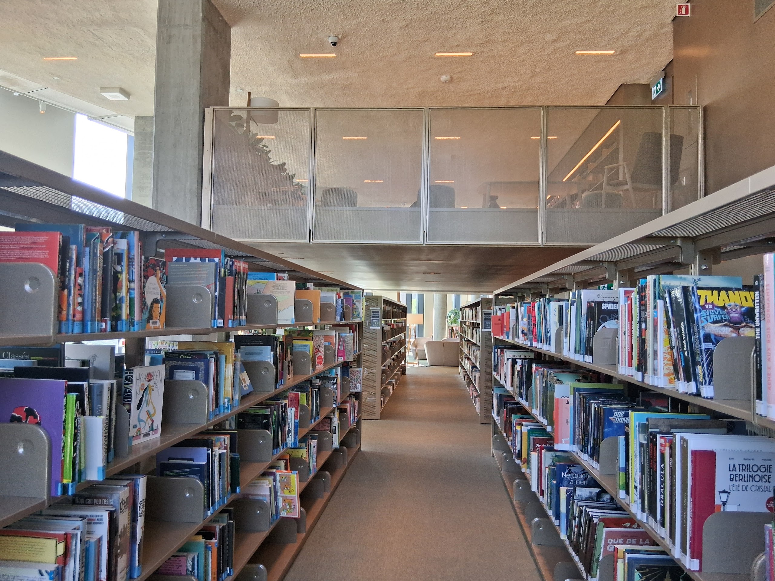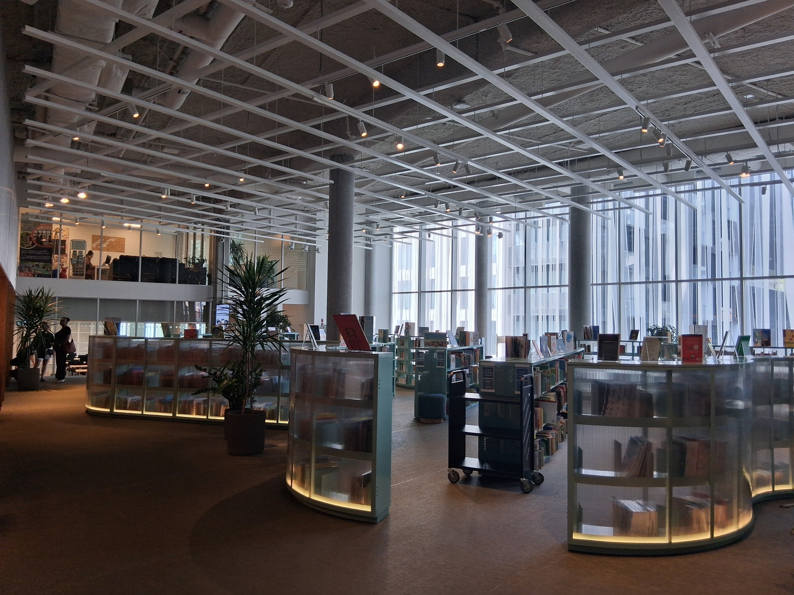 La bibliothèque est à l’étage. Accessible par un escalier surdimentionné ou un ascenceur. Le rez-de-chaussée comporte un café, des espaces de co-working, un auditorium et un espace muséal.