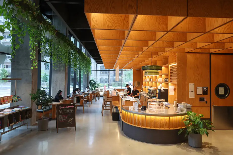 But this is a public place: Sanaaq Centre in downtown Montreal, which upends the conventions of North American public space. Rather than offering a single function, the 57,000-square-foot space on downtown’s western edge contains multitudes. It combines a public library, a black-box theatre, a media lab, a social services hub, urban agriculture and the café under one roof.