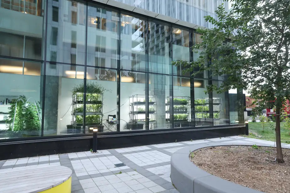 Déjà, en s’approchant du bâtiment moderne situé à un jet de pierre de la station de métro Atwater, au cœur de Montréal, on s’étonne. À travers les vitres, ce ne sont pas des livres que l’on voit, mais des plantes : les jardins suspendus d’Innovation Jeunes. Car le Centre Sanaaq regroupe sous un même toit les services d’une panoplie d’organismes communautaires, en plus d’une bibliothèque et d’un lieu culturel.
