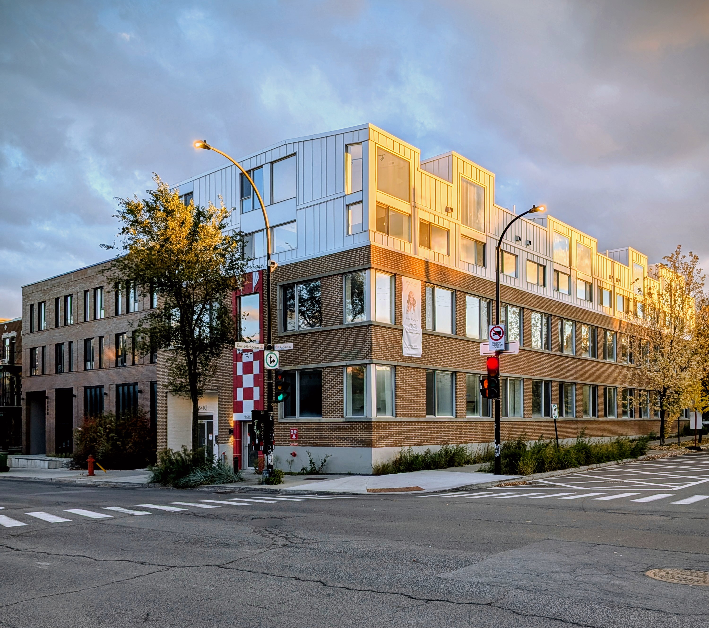 Le résultat est impeccable et s’insère bien dans la trame urbaine. On a conservé l’ancien bâtiment et augmenté son occupation par deux étages contemporains. Le tout donne un aspect assez harmonieux, je souligne la remise en valeur de cette mosaïque, qui ajoute une note identitaire et distinctive à ce projet exemplaire de rénovation.