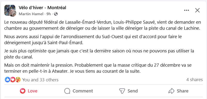 Pour en revenir au canal de Lachine, l’arrondissement va accorder un contrat pour déneiger la piste du côté nord du canal entre la passerelle Atwater et la rue de la Commune