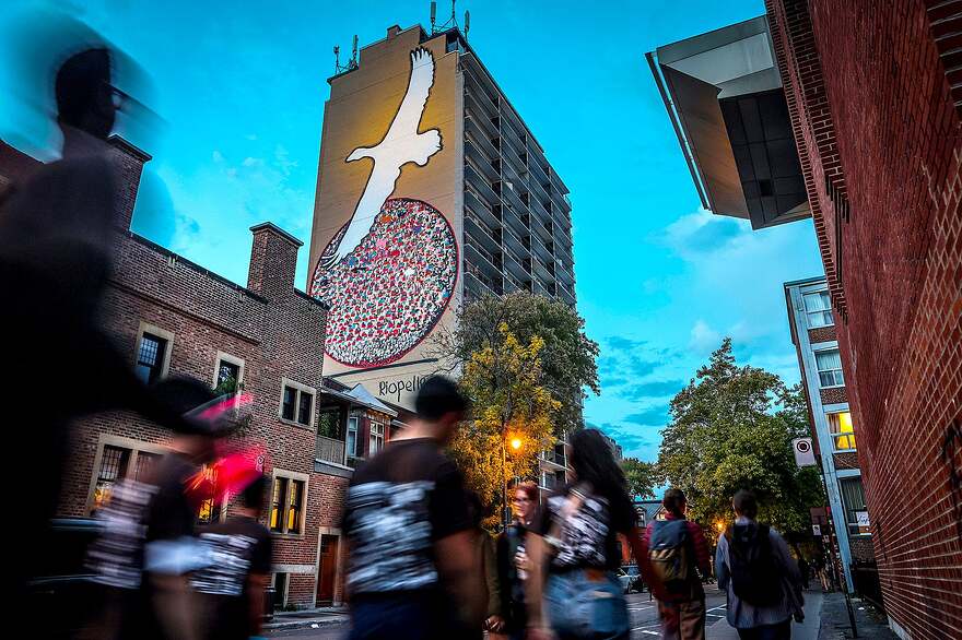 Une murale en hommage à Riopelle, signée Marc Séguin, a été illuminée cette semaine à l’angle des rues Milton et University.