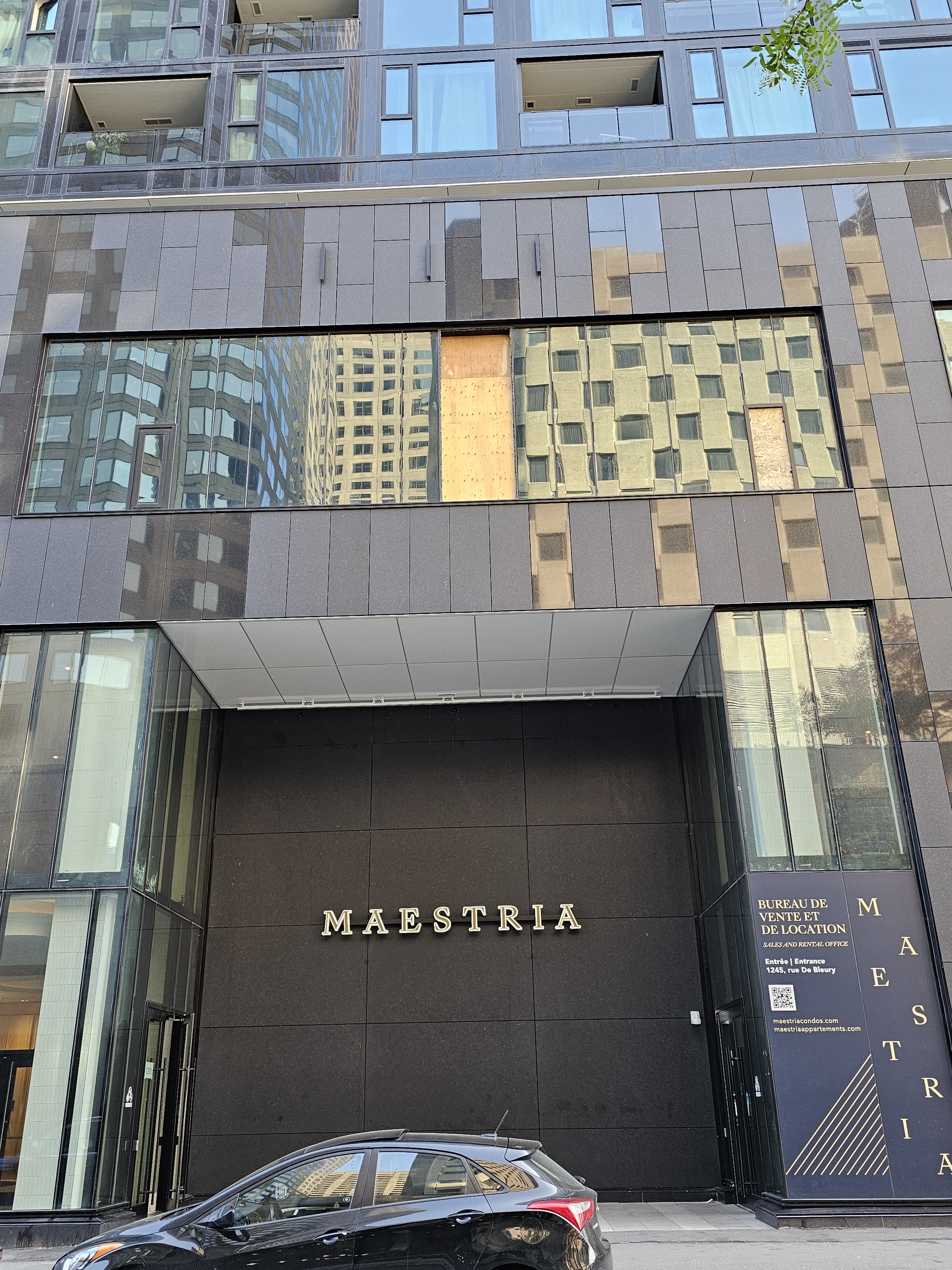 A window shattered at Saint-Catherine & Rue de Bleury in Montreal, sending glass onto the street. Police have blocked off the area for safety
