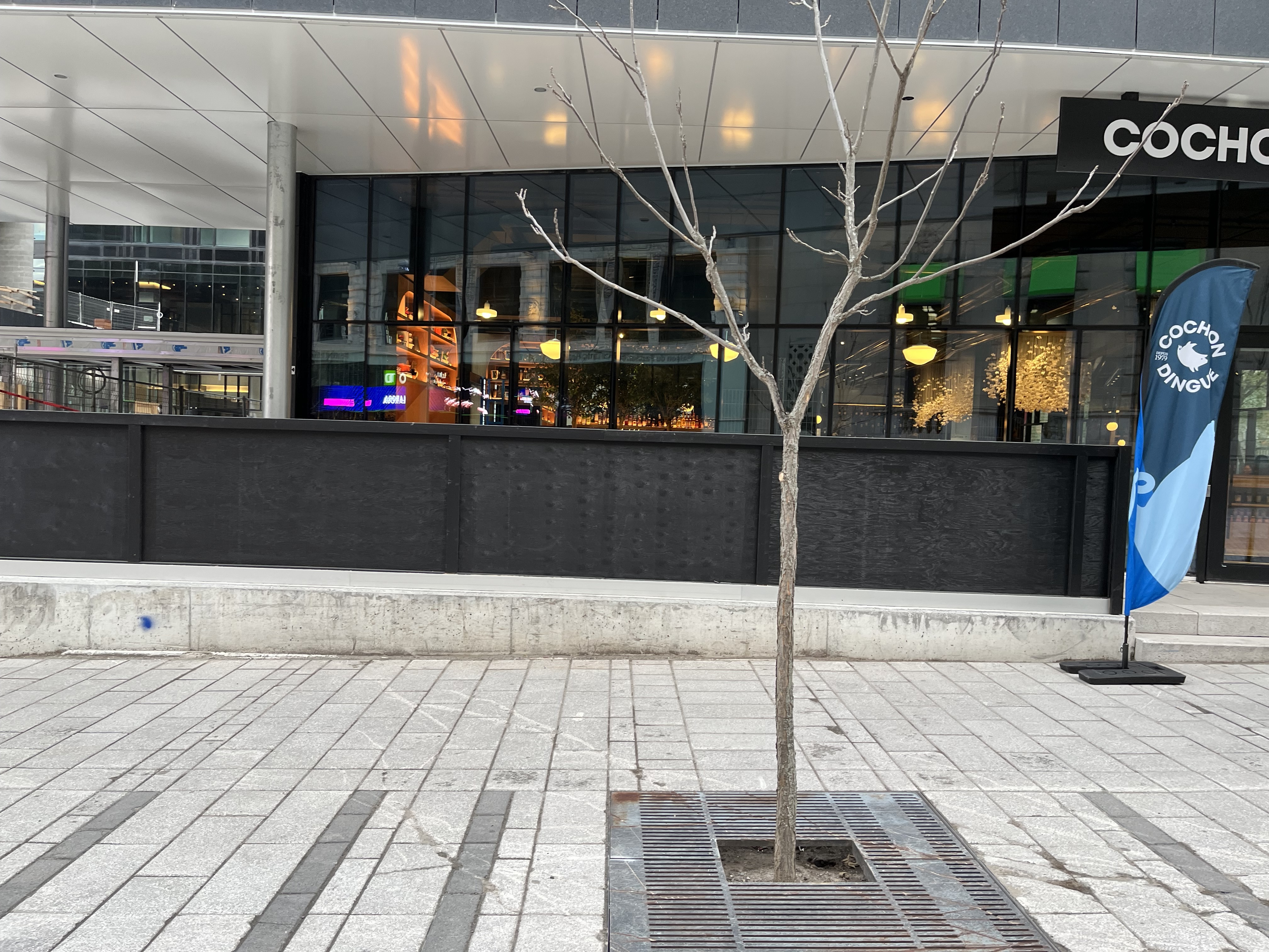 Le restaurant Cochon Dingue doit être à la veille d’ouvrir car ils ont retiré les collants dans les fenêtres et on pouvait y voir une réunion de staff avec des tables prêtes cet après-midi.
