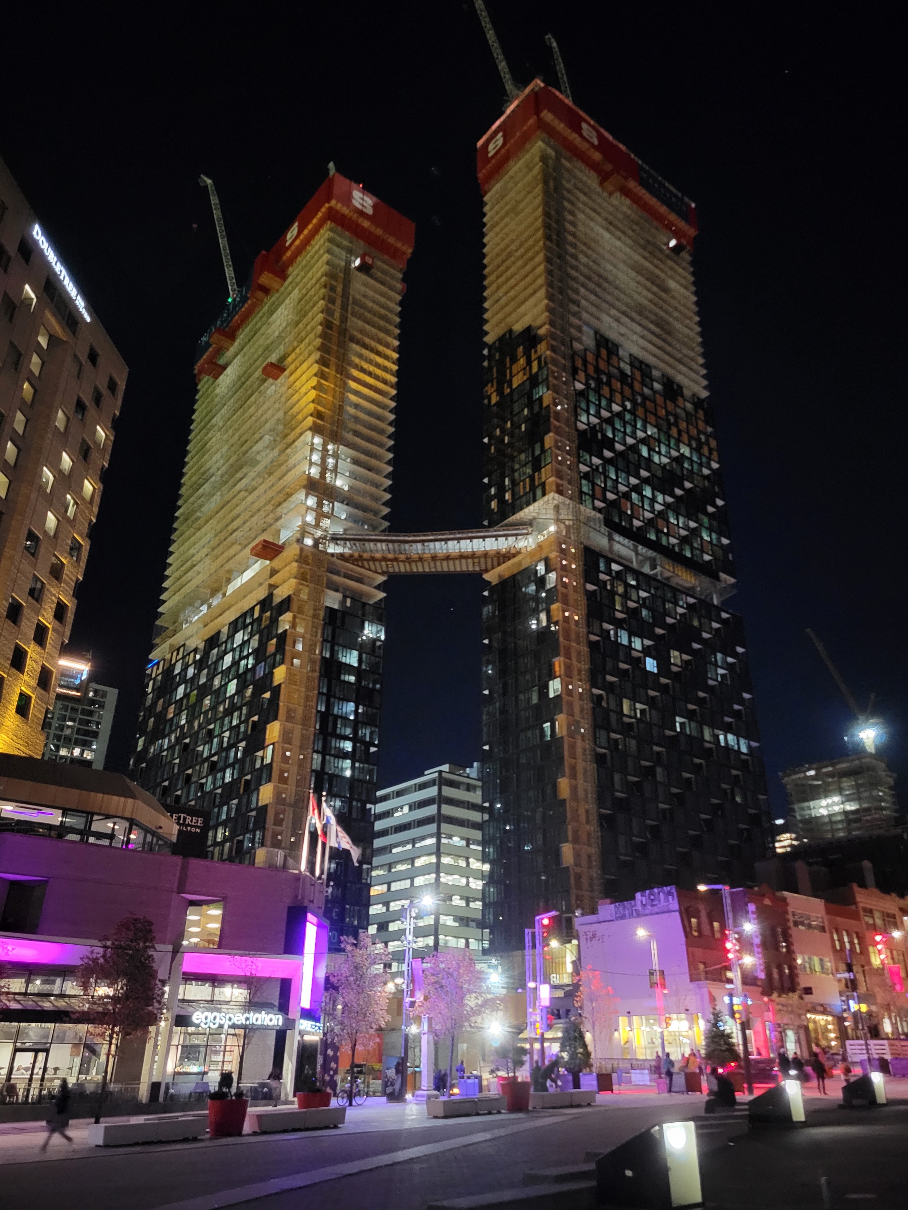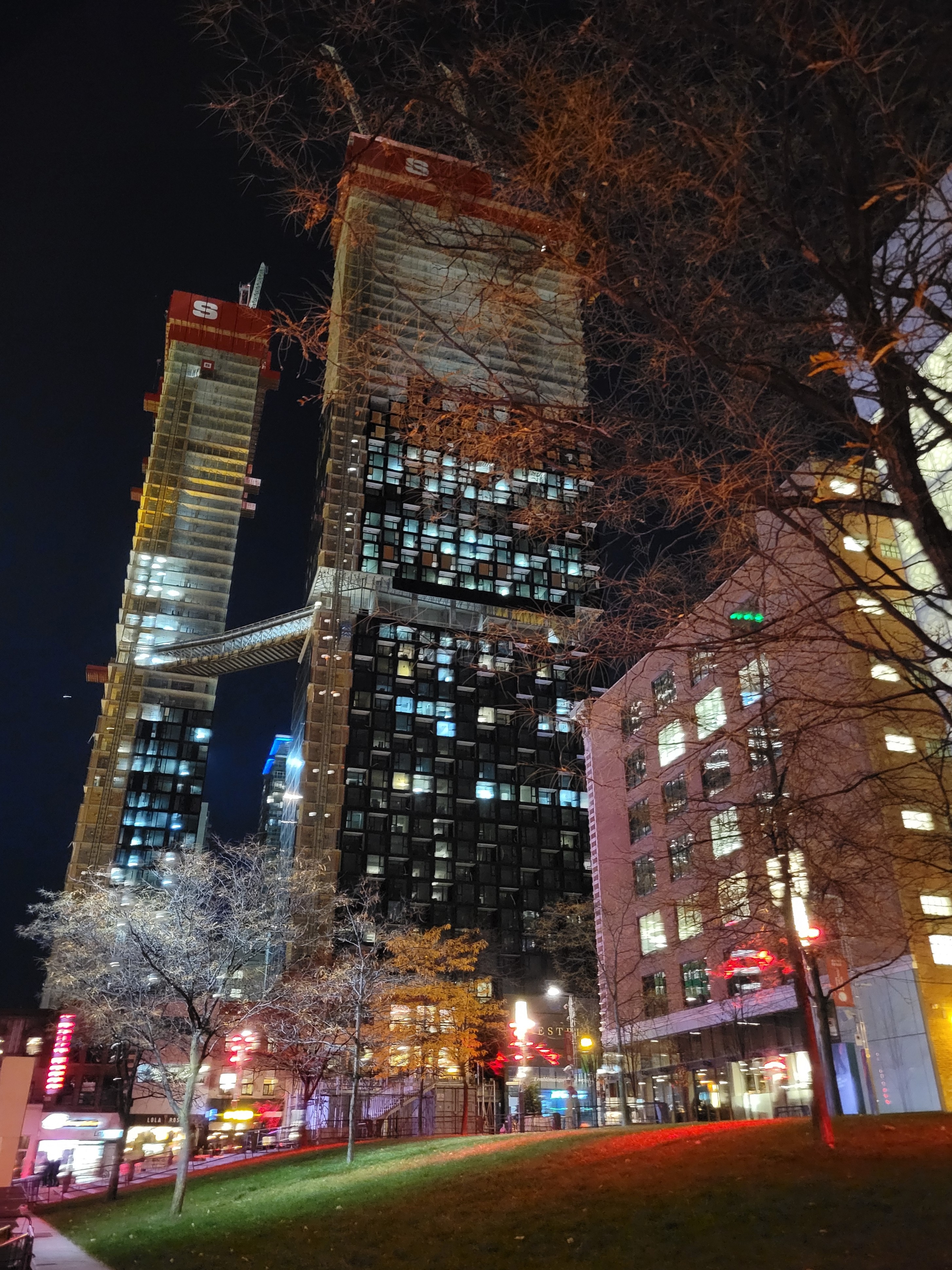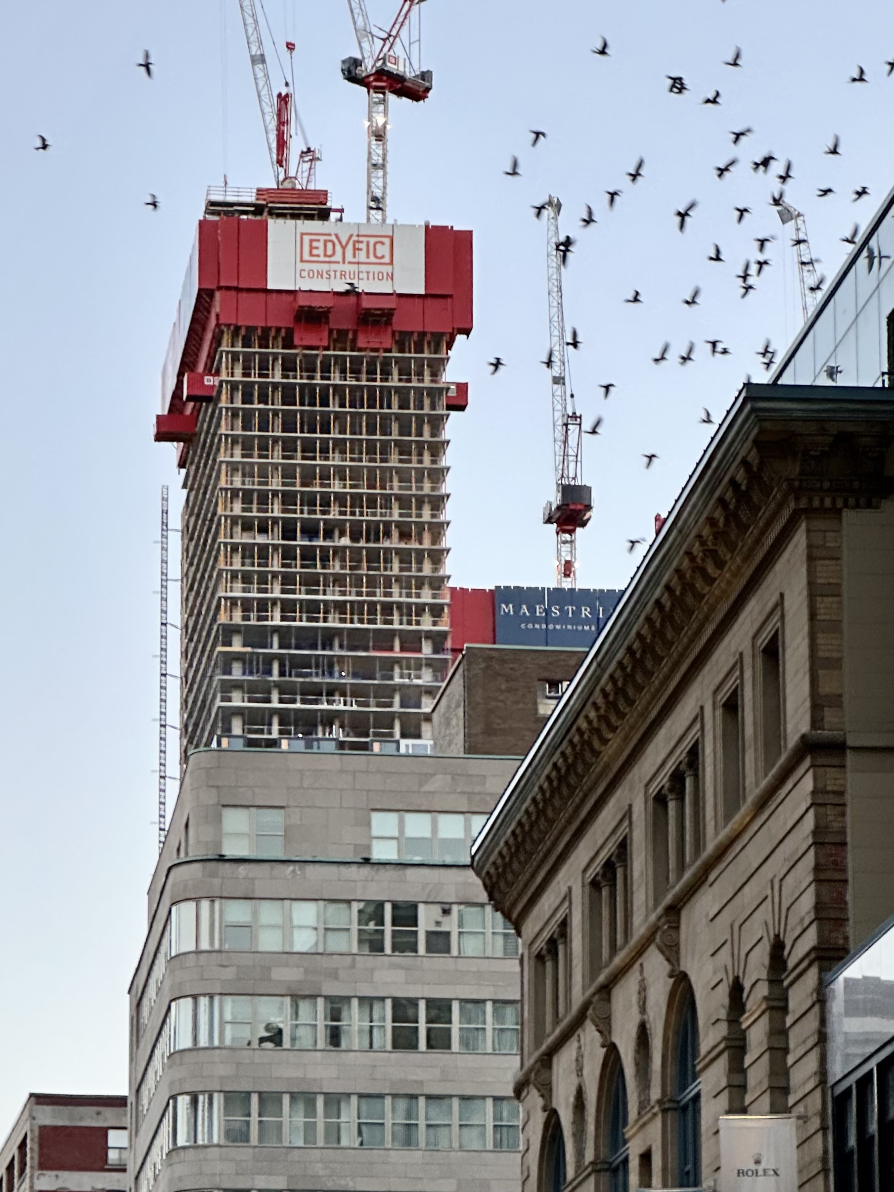 La partie sud de la tour Maestria 2 a été relevée d’un étage hier après-midi et elle s’approche de la hauteur de la tour 1. À gauche le revêtement de la Tour Banque Nationale est pratiquement rendu au haut de la tour. On peut voir sur la droite que la hauteur de la tour 1 Square Phillips est plus qu’à la moitié et devrait rejoindre la hauteur de la tour Telus bientôt. Plus à droite les travaux avancent aussi sur l’Imperia auquel je crois qu’il ne manque que 5 étages.