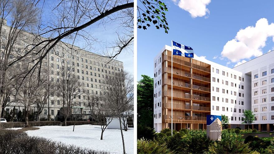 À gauche, le CHSLD Jeanne Le Ber / À droite, le visuel du nouvel hébergement qui le remplacera.