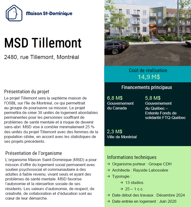 Le projet est réalisé dans le cadre du programme de financement du Fonds de solidarité FTQ (TOIT) et du Fonds pour le logement abordable de la Société canadienne d’hypothèques et de logement (SCHL).