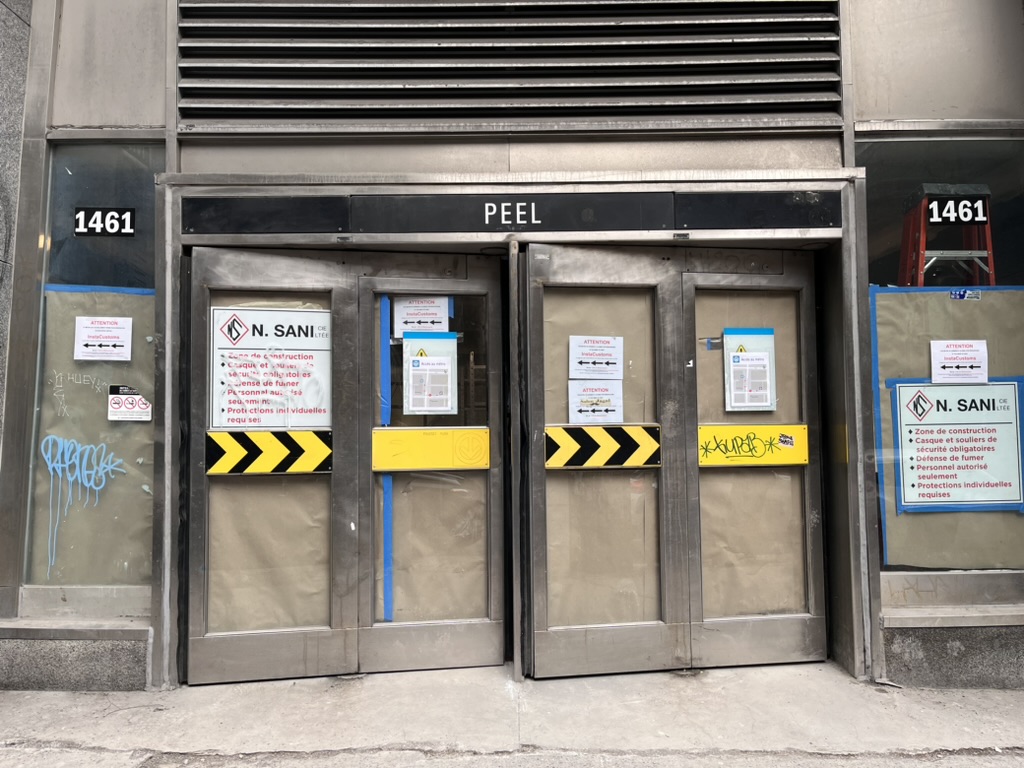 Peel était fermée à cause de travaux. La signalétique pour rediriger les usagers n’avait que l’adresse de l’entrée alternative en petite police (et on aurait dit qu’elle avait été corrigée à la main par un.e employé.e).